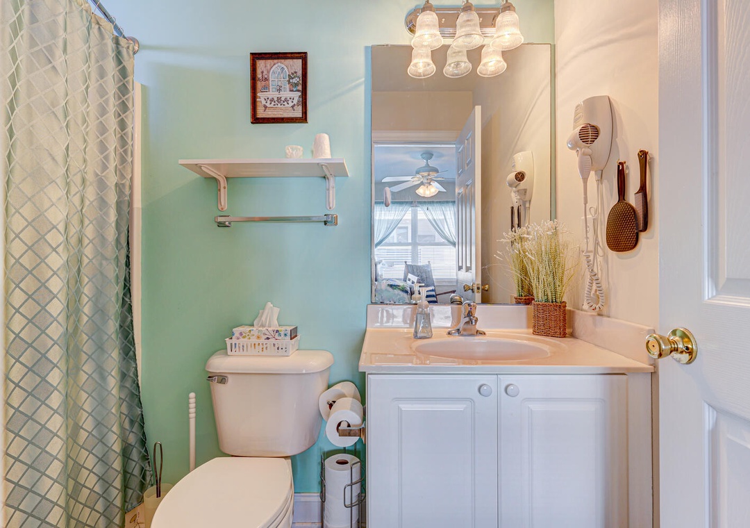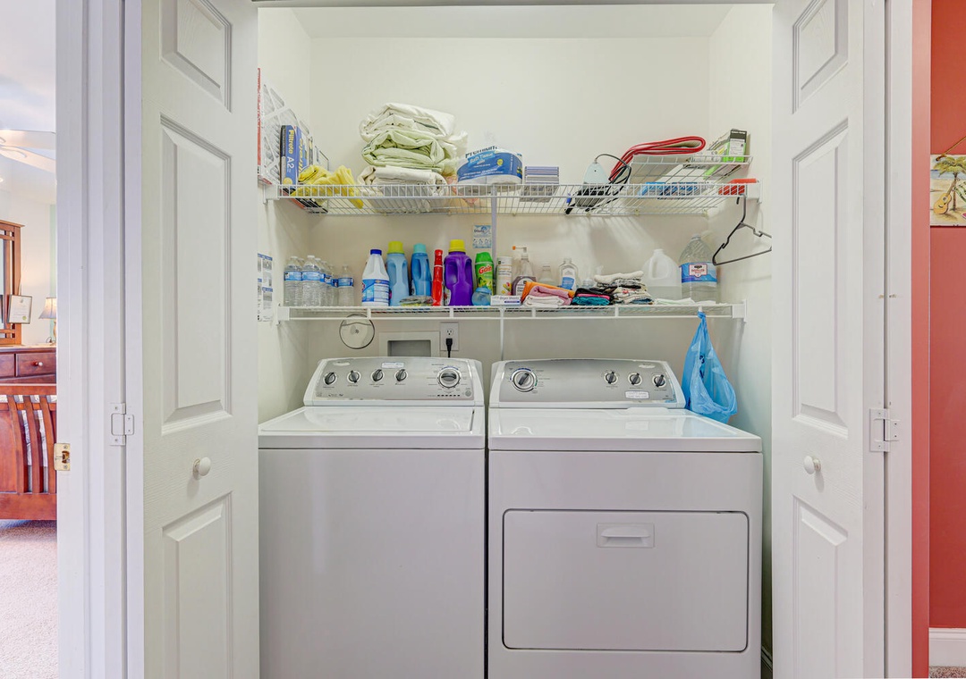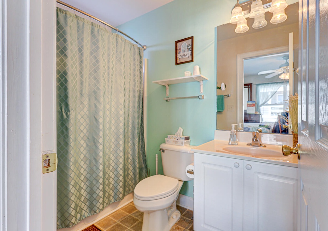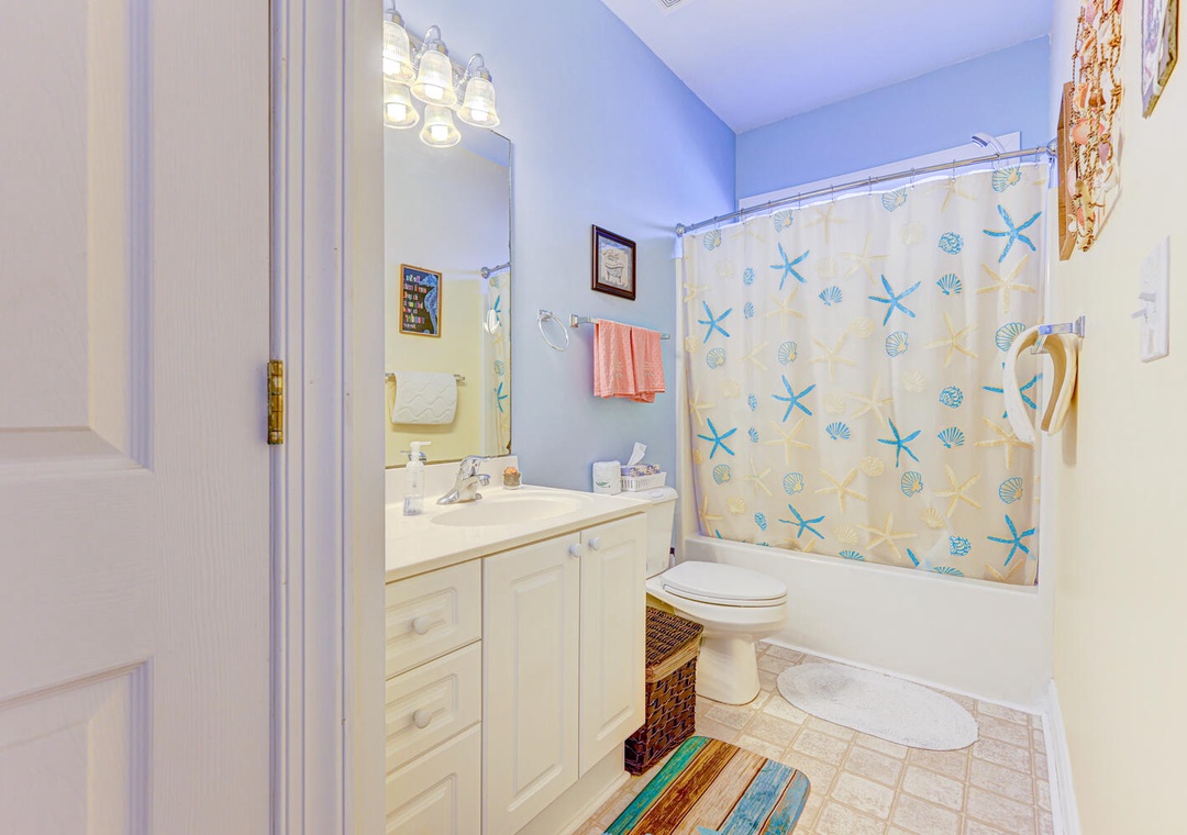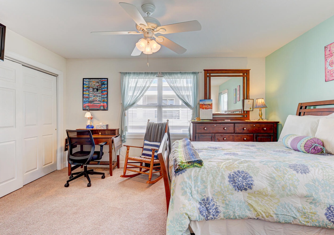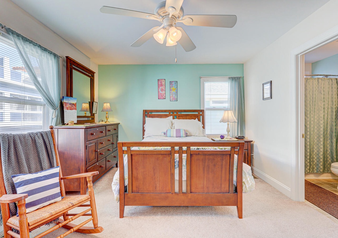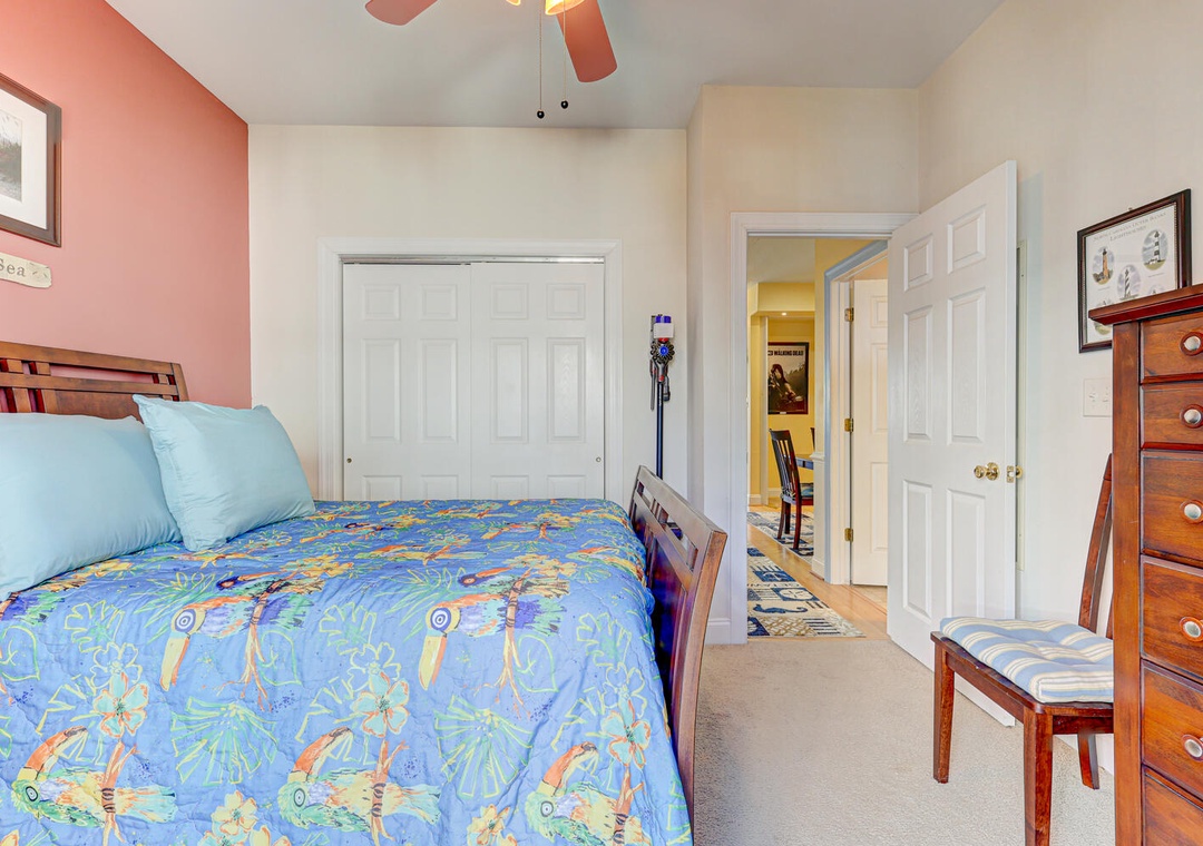 The rear guest bedroom with a double bed has a Kennedy Rocking Chair and small desk with a chair, ceiling fan, smart TV, and an attached complete private bath with tub/shower unit. The hallway closet between the two upper bedrooms contains the washer and dryer units for your usage.