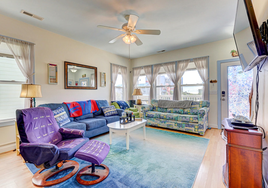 Located on this floor is the main Living area, featuring two easy chairs, queen size couch and a queen size sleeper sofa, cocktail table and a