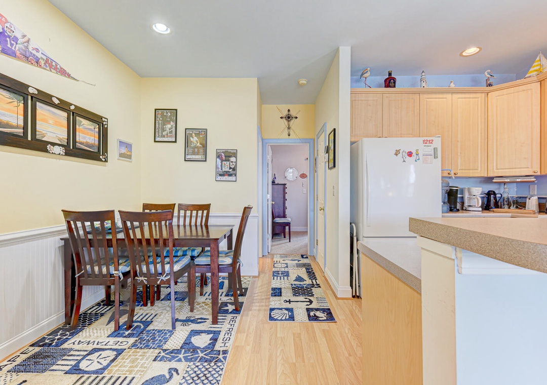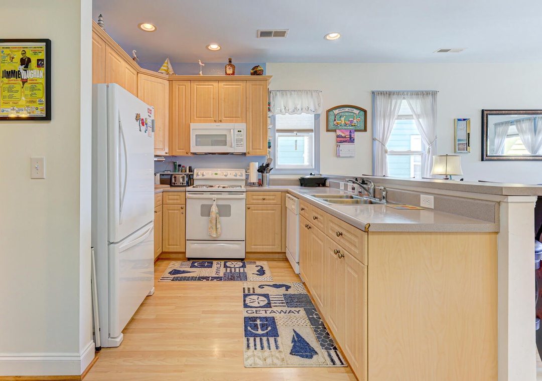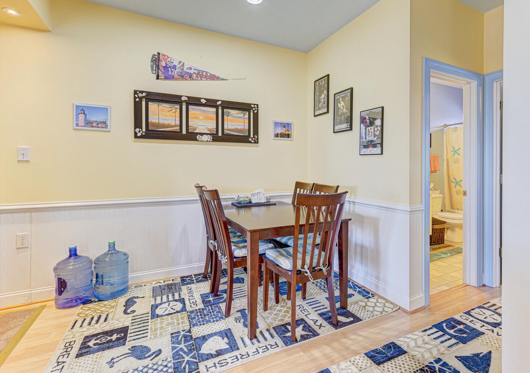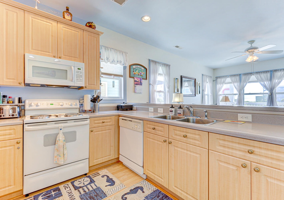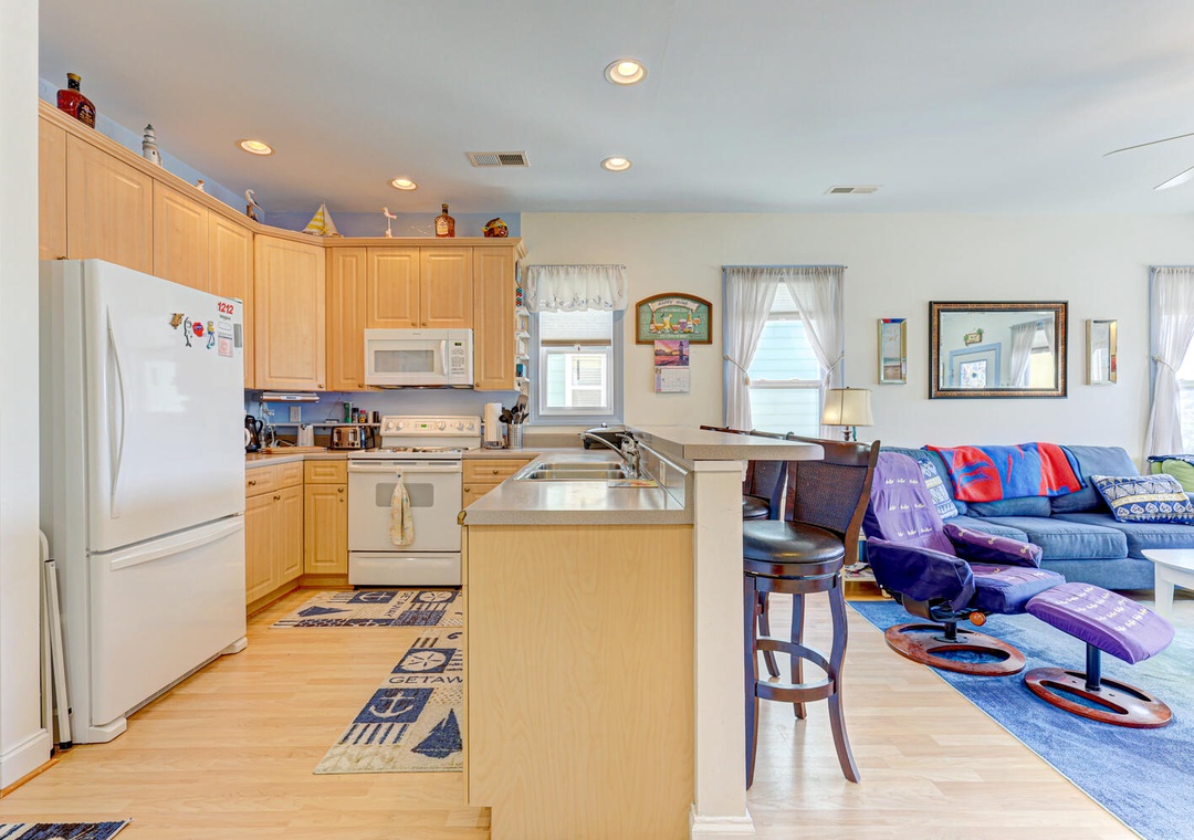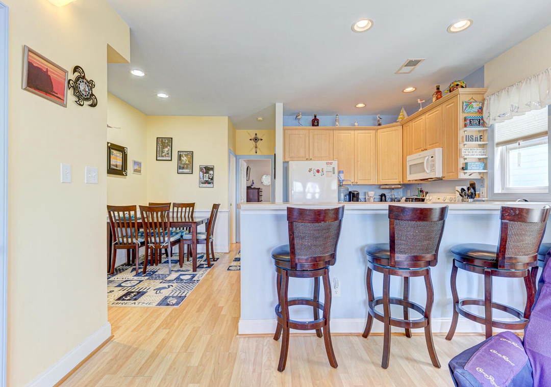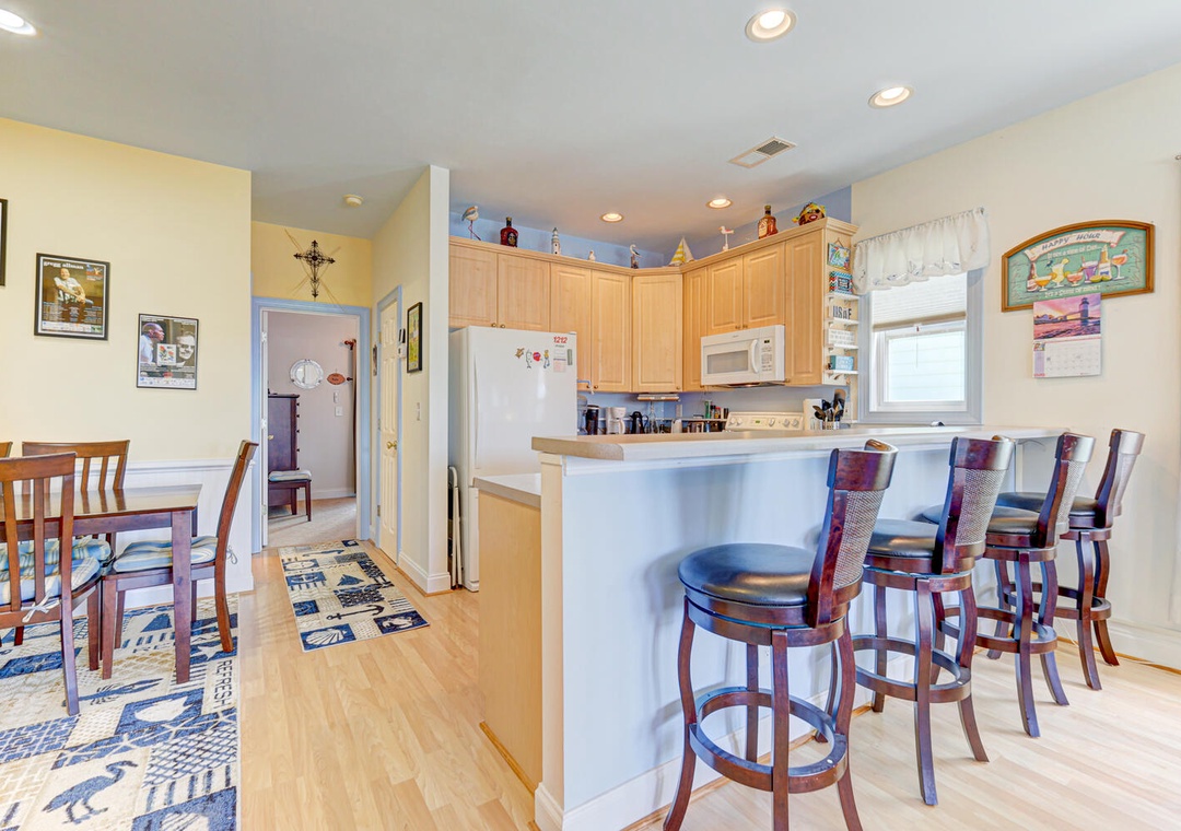 The fully equipped kitchen and dining area offer table seating for six and counter seating for four, with appliances like Keurig, drip coffee maker, 4 slice toaster, blender, crockpots and electric saucepans along with complete utensils to make your meal prepping a breeze.