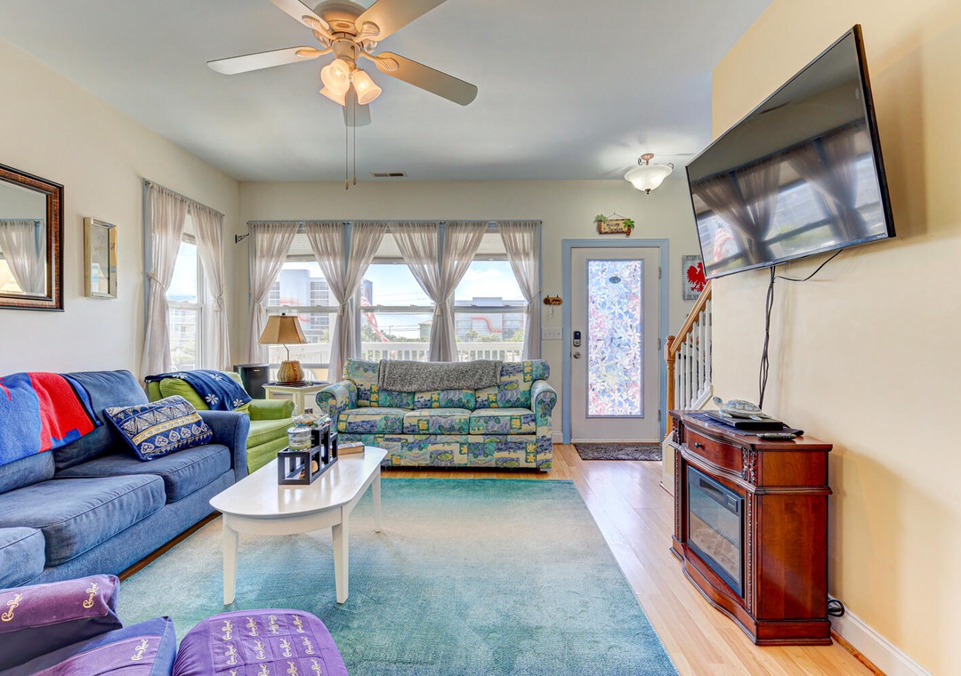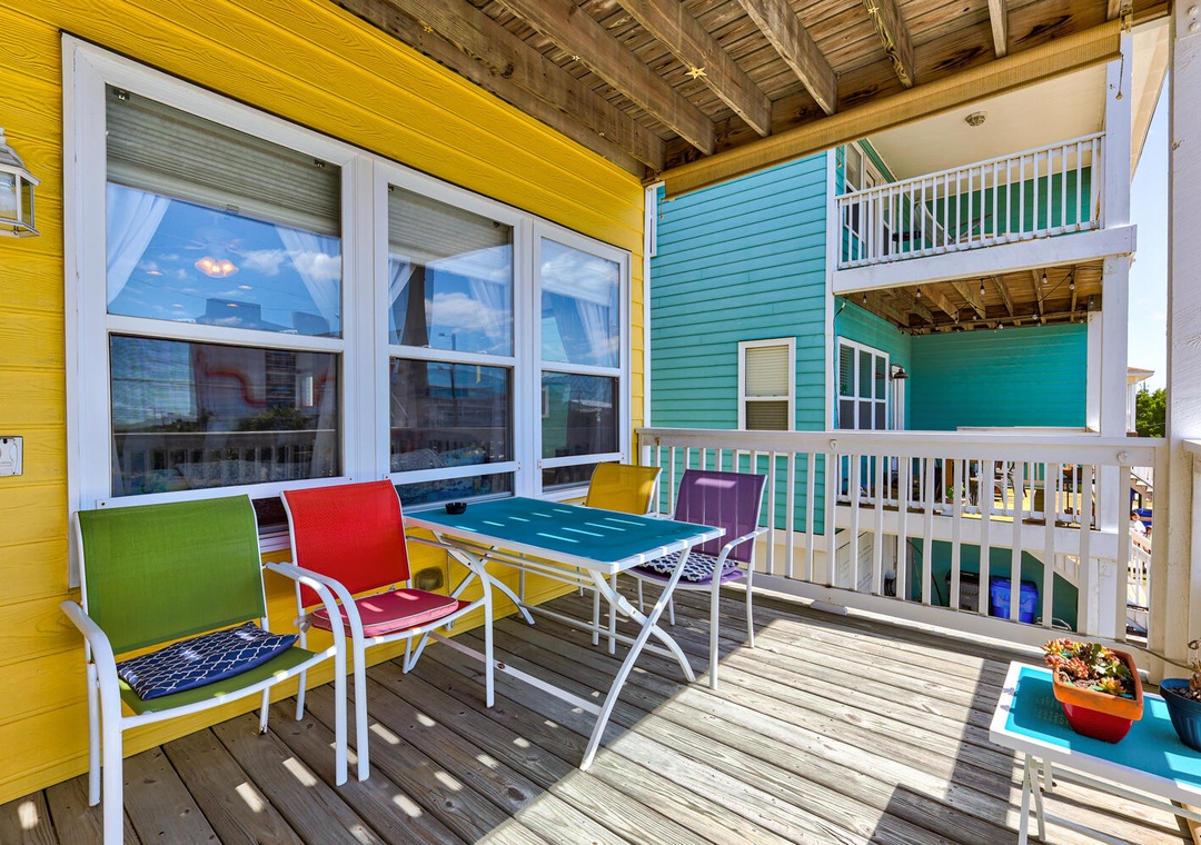 This inviting two story rental is the perfect retreat, combining a cozy homelike atmosphere. with all the modern conveniences. A charming deck at the entrance, complete with table and chairs provide a relaxing place for outdoor dining, or a great place for your sunrise view of the ocean or maybe a place for your morning coffee. Sunshades are available.