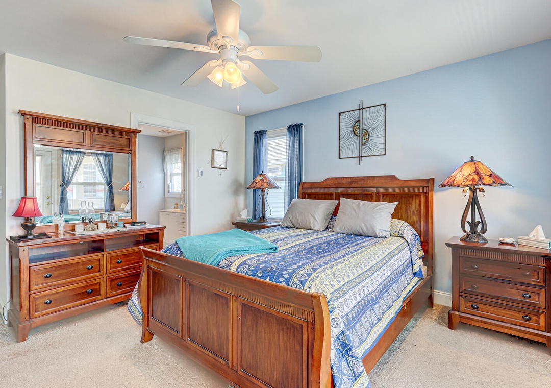 Upstairs on the third floor, you will find the master bedroom with queen size bed, end tables, ceiling fan, smart TV, private deck with table and chairs, outside ceiling fan, and 2 available hanging rope chairs. you will find the attached roomy master bath boasts dual vanity sinks and a tub/shower unit with modern shower spray head.