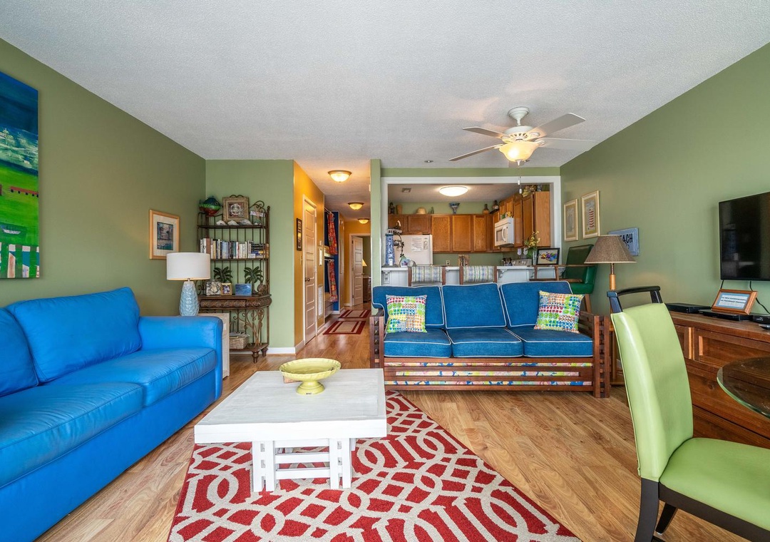 Discover the charm of this oceanfront gem nestled within The Riggings at Kure Beach. Positioned on the third floor, this adorable condo offers breathtaking views of the Atlantic Ocean, making it an ideal retreat for beach lovers. The interior features a cozy living room adorned with a flat screen TV and ample seating for relaxation after a day of seaside adventures. Board games are on hand for family fun, complementing the serene ambiance.