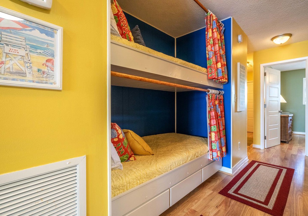 The kitchen is equipped with modern amenities including a refrigerator, flat cooktop stove, drip coffee maker, toaster oven, and blender, perfect for preparing meals with ease. Enjoy dining with a view at the table set for four or step out onto the back deck to savor your meals amidst the ocean breeze. The bedroom offers a peaceful sanctuary with a plush king bed, additional flat screen TV, and ceiling fan for comfort. A charming built-in bunk bed in the hallway provides cozy sleeping quarters for extra guests, ensuring everyone has a delightful stay.