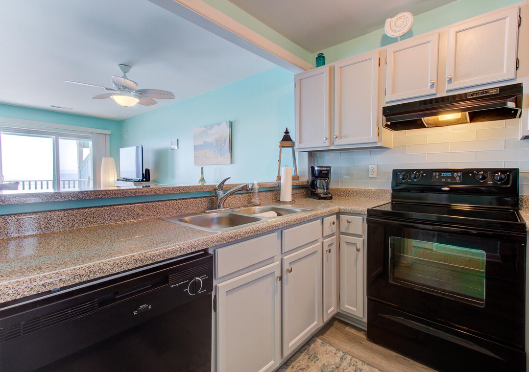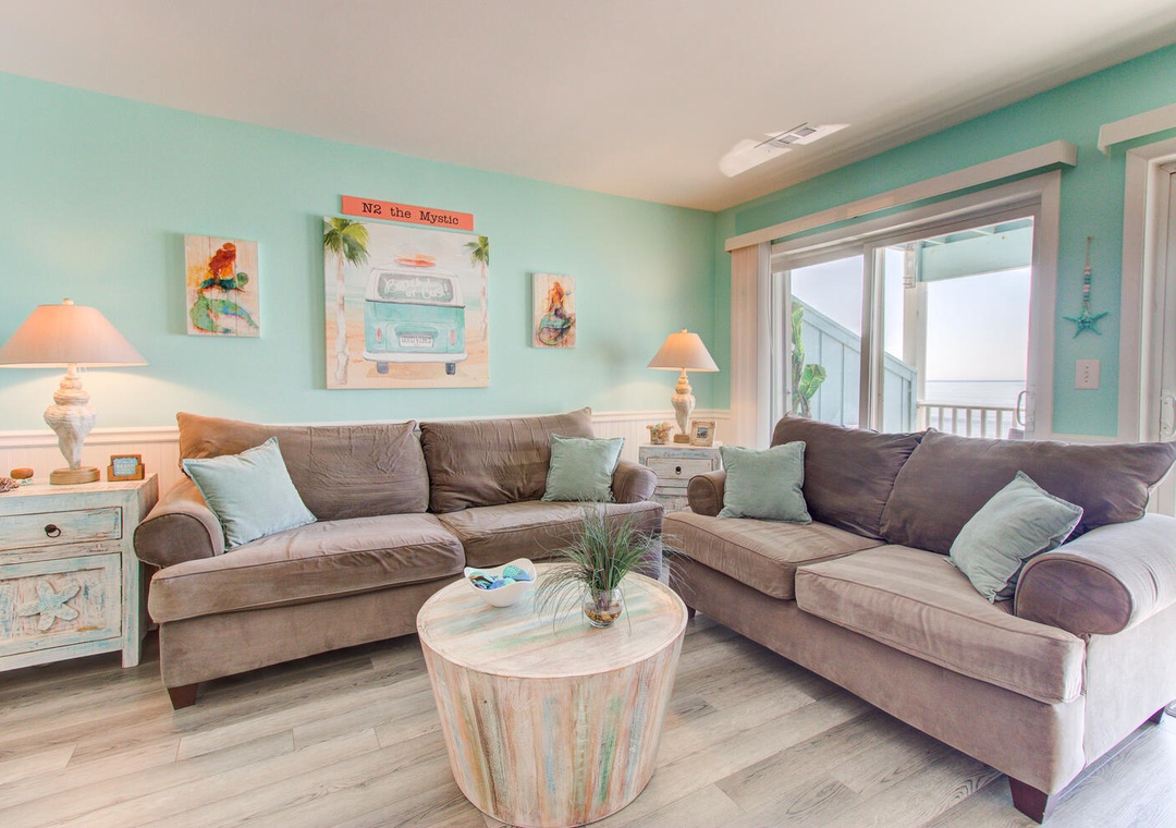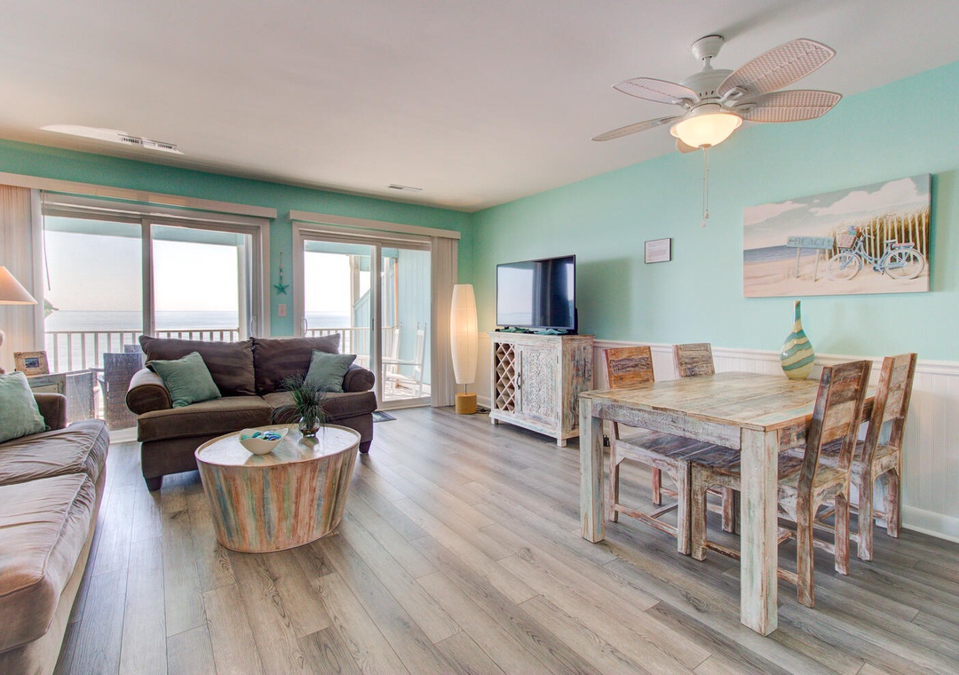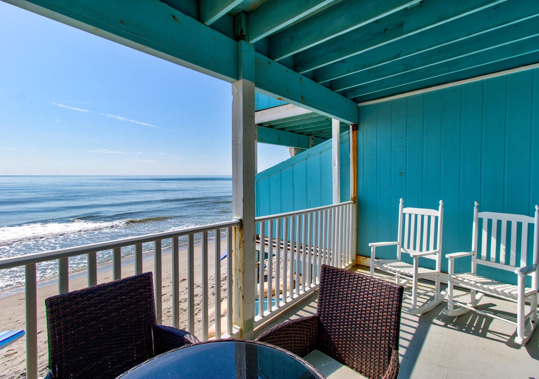 Step out onto the oceanfront deck and take in the breathtaking views of the Atlantic while sipping your morning coffee or unwinding in the evening. The deck is furnished with a table and seating and classic rocking chairs to enhance your coastal experience. Inside, the open living area features a comfortable couch, love seat, rocking chair, and a flat-screen TV and ceiling fan for added comfort. The fully equipped kitchen boasts a flat cooktop stove, oven, refrigerator, dishwasher, microwave, toaster oven, and a drip coffeemaker, as well as barstool seating for four and a dining table that also seats four.