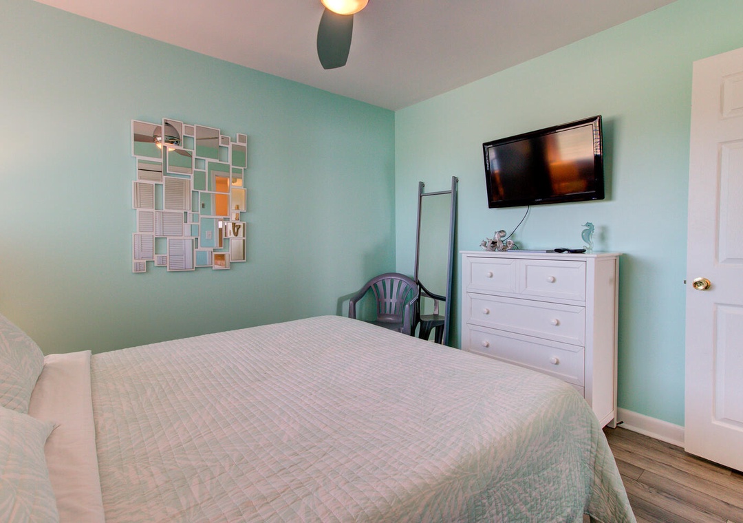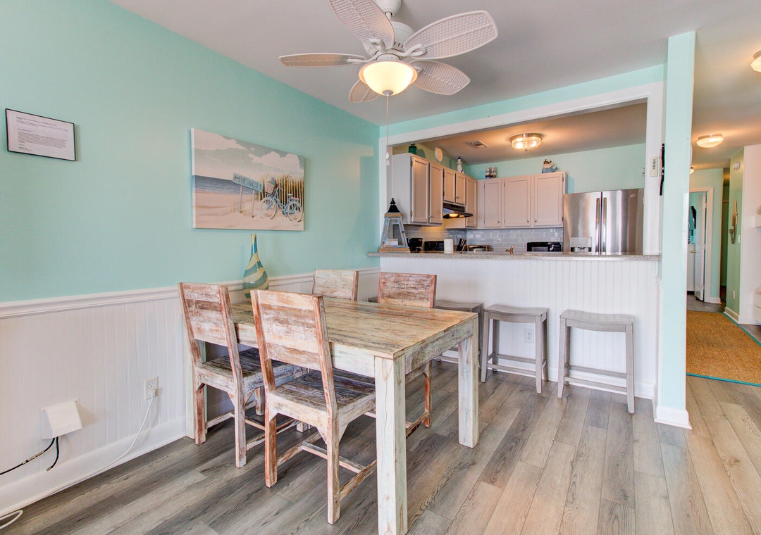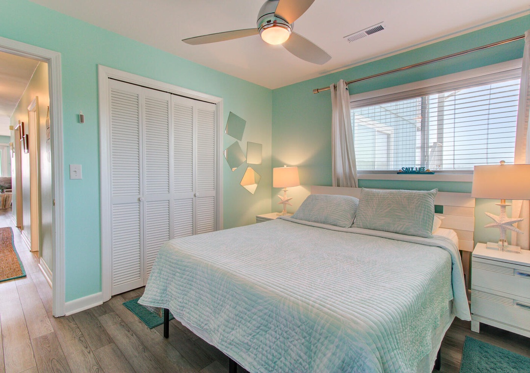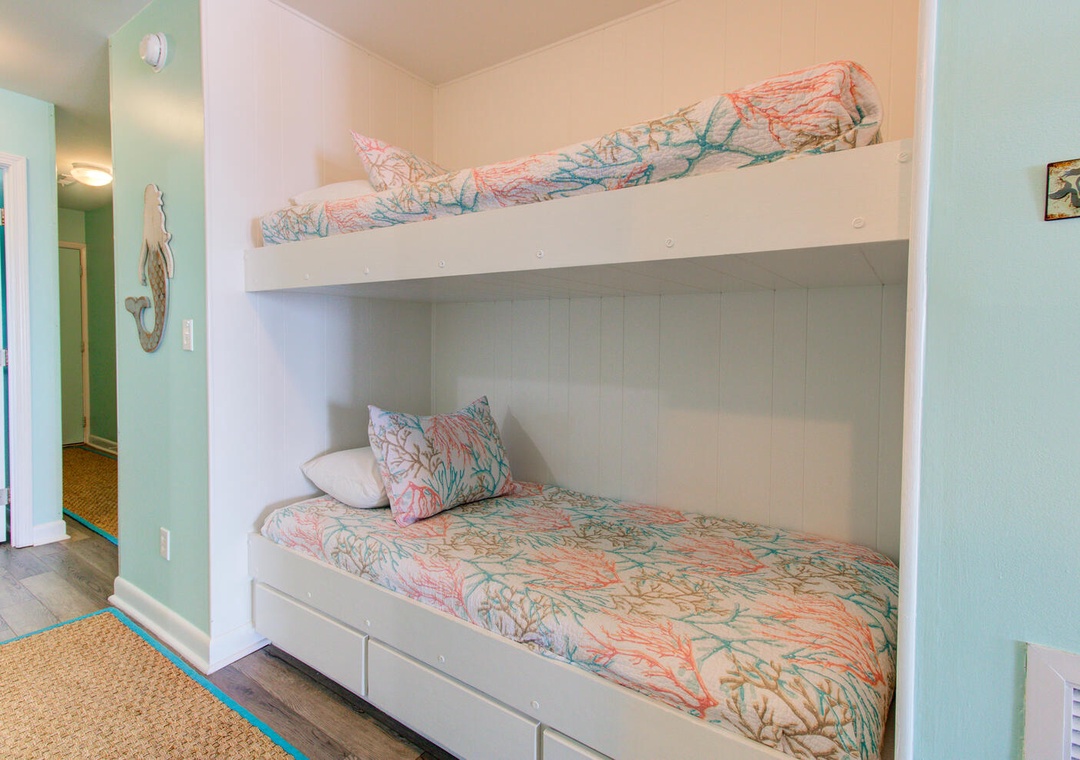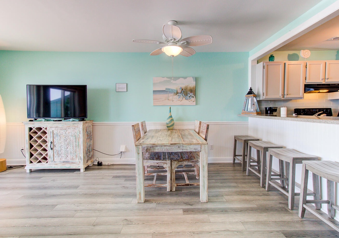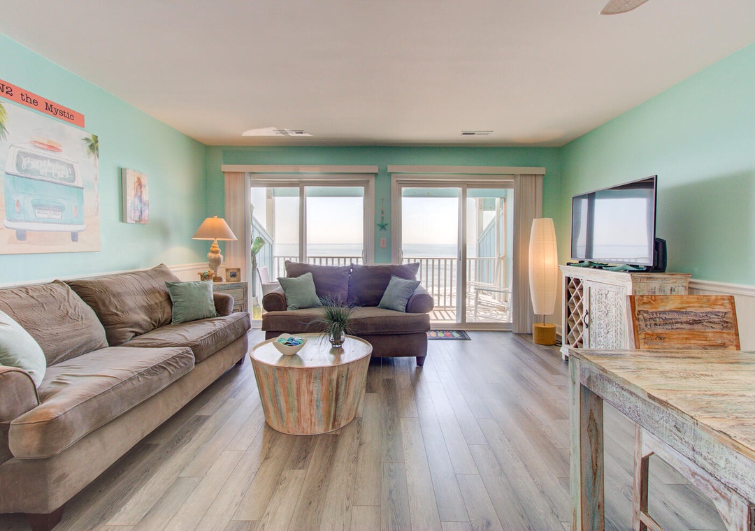 Riggings N2 comfortably accommodates guests with a queen bed in the bedroom, complete with a flat-screen TV and ceiling fan, as well as Twin XL bunk beds tucked into the hallway for additional sleeping space. The full bathroom features a tub/shower combo, and for added convenience, a stacked washer and dryer are included. Whether you're lounging inside, enjoying the deck’s ocean breeze, or taking advantage of the community amenities, this coastal escape offers the perfect balance of relaxation and adventure.