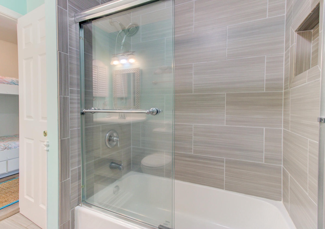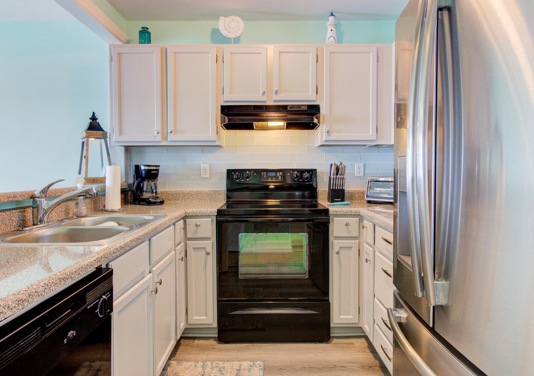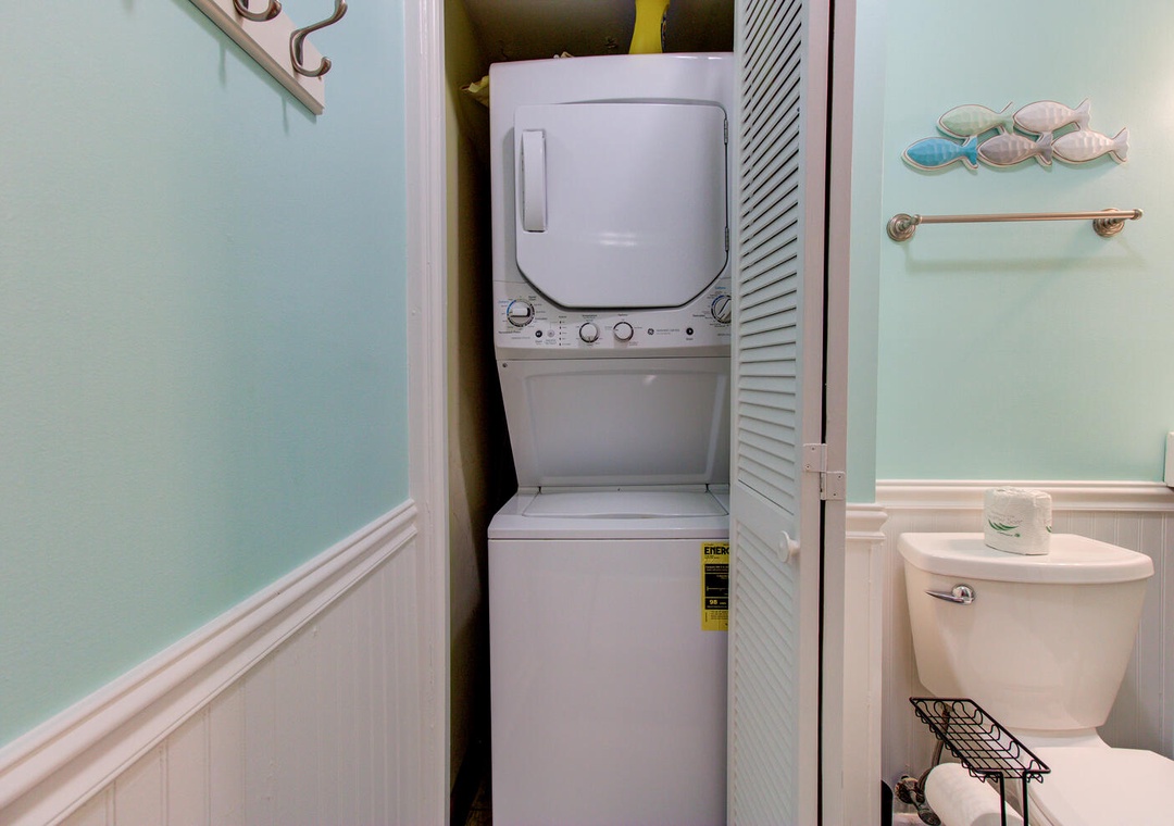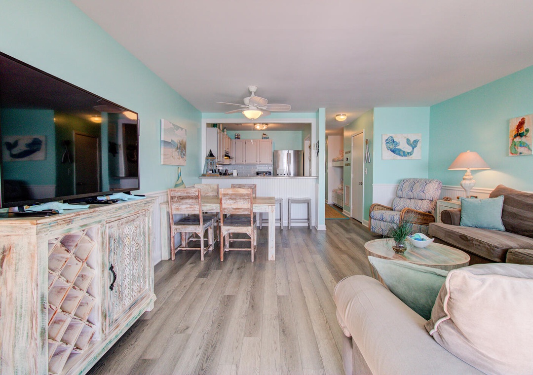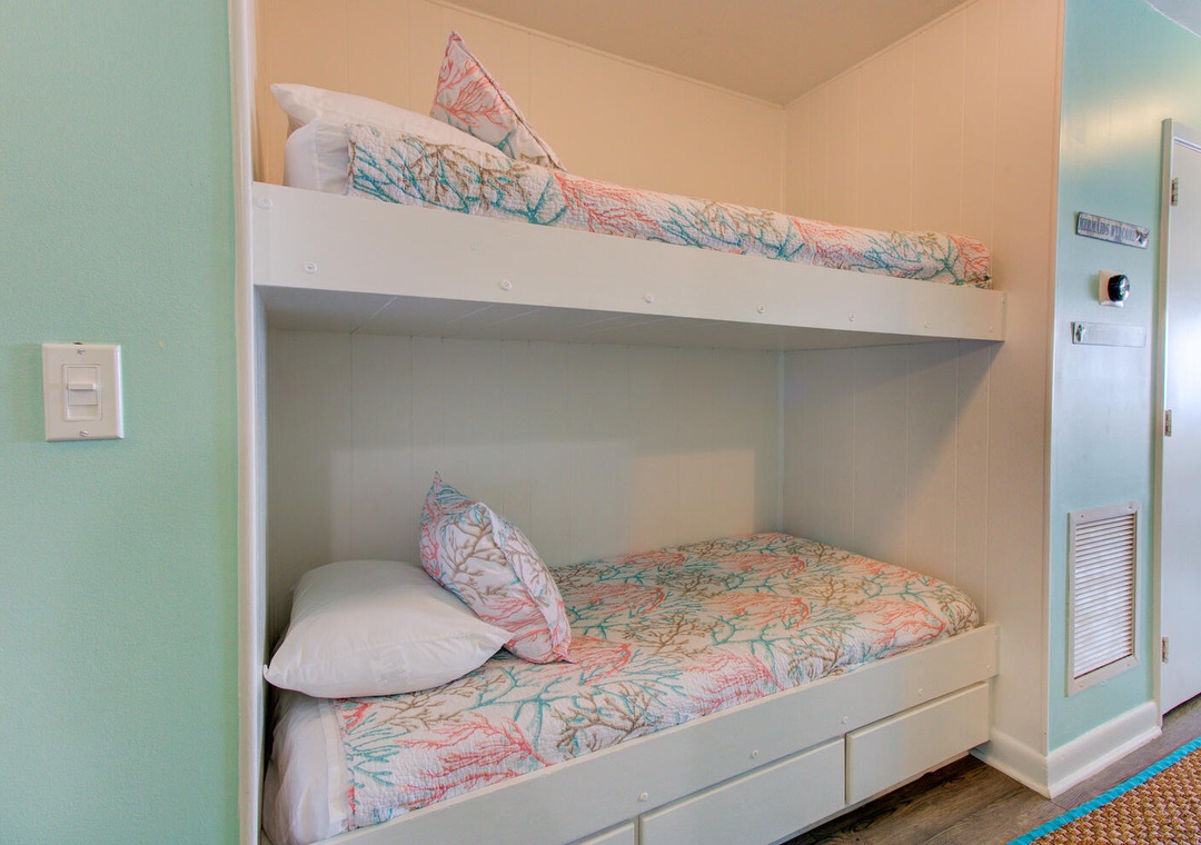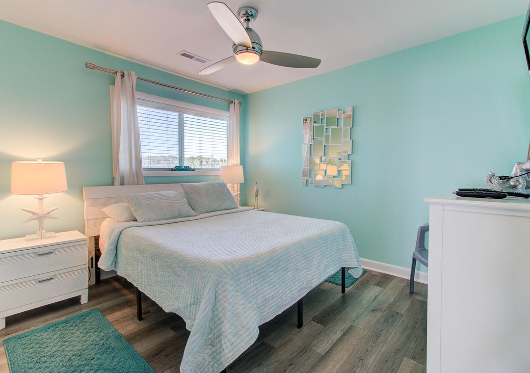 Riggings N2 comfortably accommodates guests with a queen bed in the bedroom, complete with a flat-screen TV and ceiling fan, as well as Twin XL bunk beds tucked into the hallway for additional sleeping space. The full bathroom features a tub/shower combo, and for added convenience, a stacked washer and dryer are included. Whether you're lounging inside, enjoying the deck’s ocean breeze, or taking advantage of the community amenities, this coastal escape offers the perfect balance of relaxation and adventure.