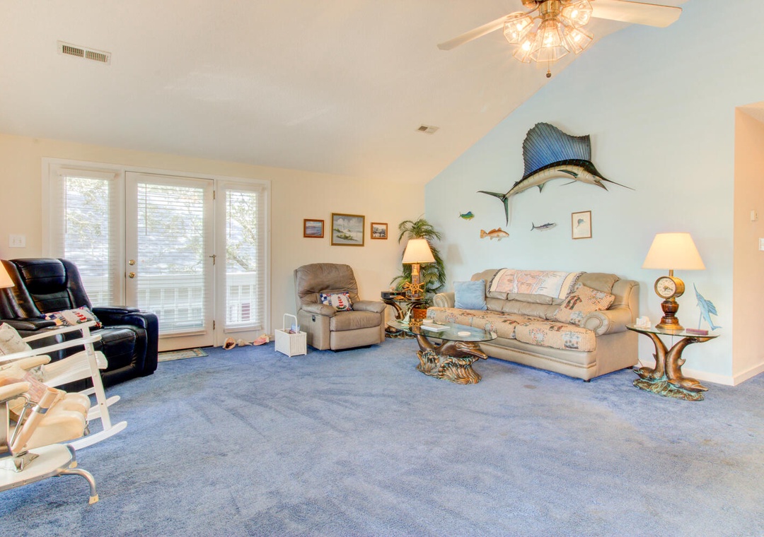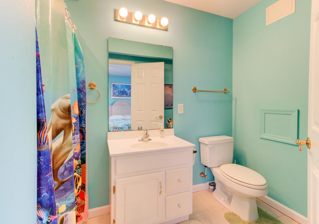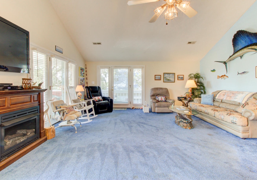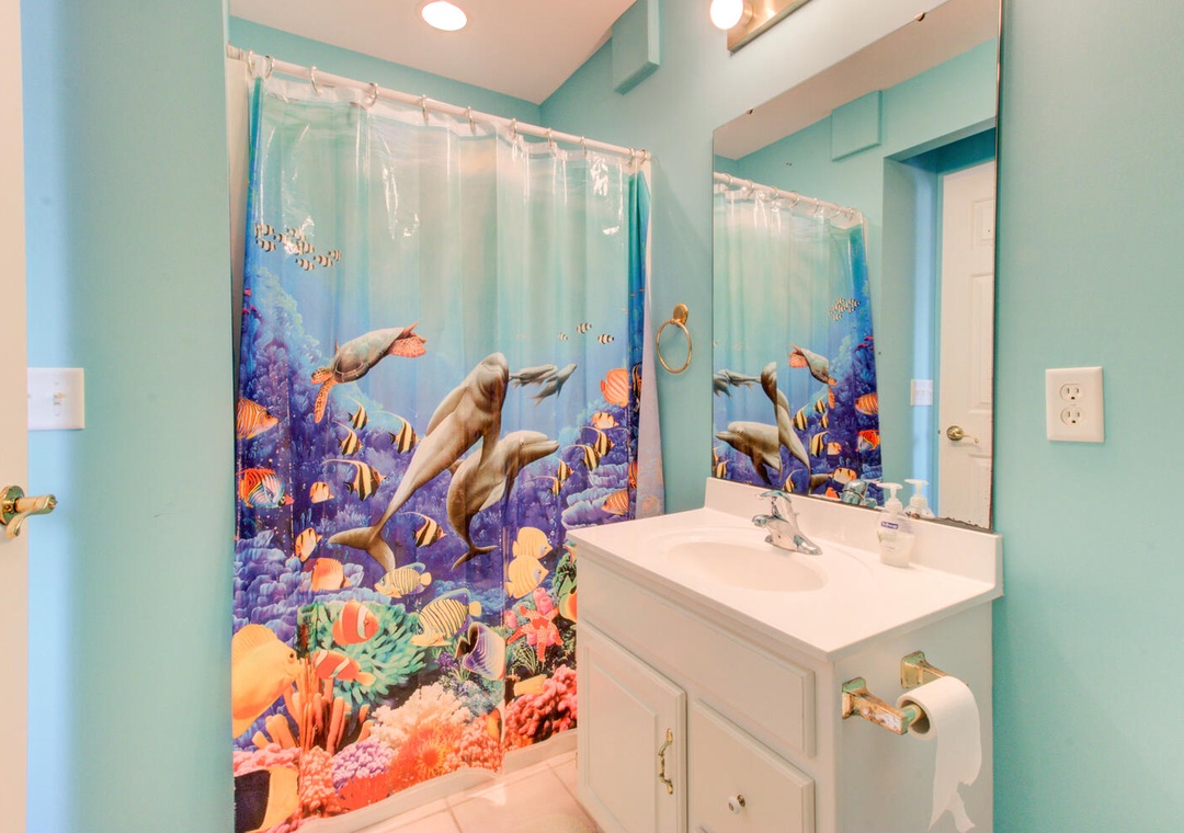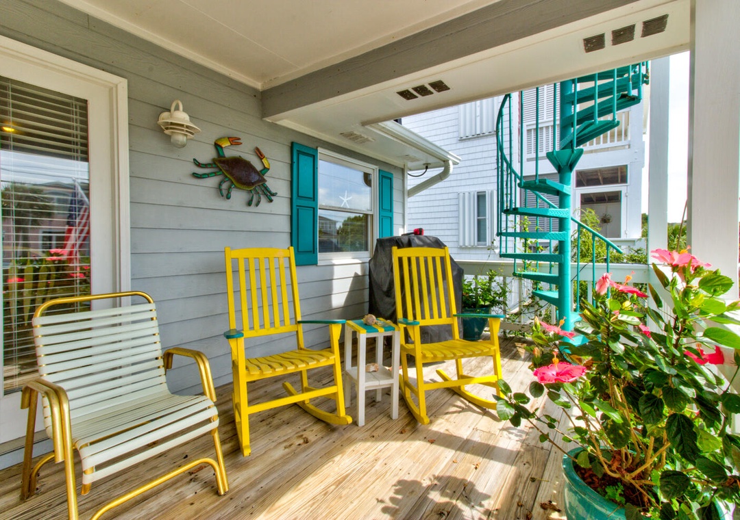 With five bedrooms, including a separate entrance mother-in-law suite, this home comfortably accommodates guests. The primary suite has a king bed, private deck, and ensuite bathroom with a glass walk-in shower and double vanity. Additional bedrooms include a queen room with a private bath, a full bed, a twin room with two beds, and another queen room in the mother-in-law suite, which also features a half bath and private full bath with a shower. A second shared bathroom offers a tub/shower combo. Outdoor amenities include two outdoor showers (one enclosed) and a gas grill, perfect for relaxing after a day at the beach.