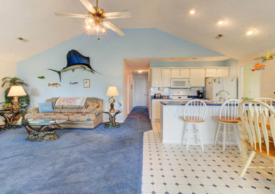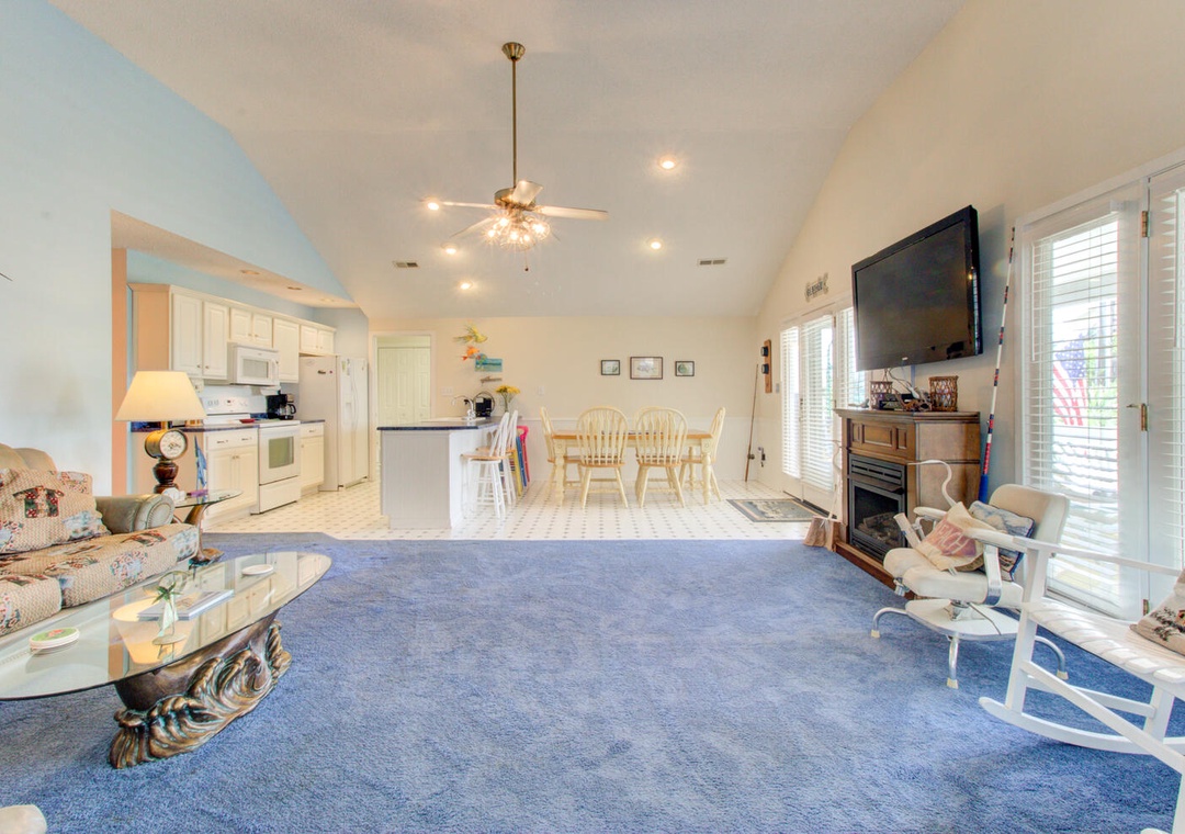 This spacious, pet-friendly home is just four blocks from the beach, offering central heating and air conditioning, complimentary Wi-Fi, and parking for up to six cars, including two in the garage. The front deck provides a street view with seating for eight. Guests can enjoy a fully equipped kitchen with a refrigerator, dishwasher, cooktop stove, microwave, and small appliances like a drip coffeemaker, toaster, hand mixer, crockpot, and blender. The dining area seats six, with additional barstool seating for five. The living room features a flat-screen TV, DVD player, stereo, decorative fireplace, and access to the street-facing deck. A laundry room with a washer and dryer adds convenience.