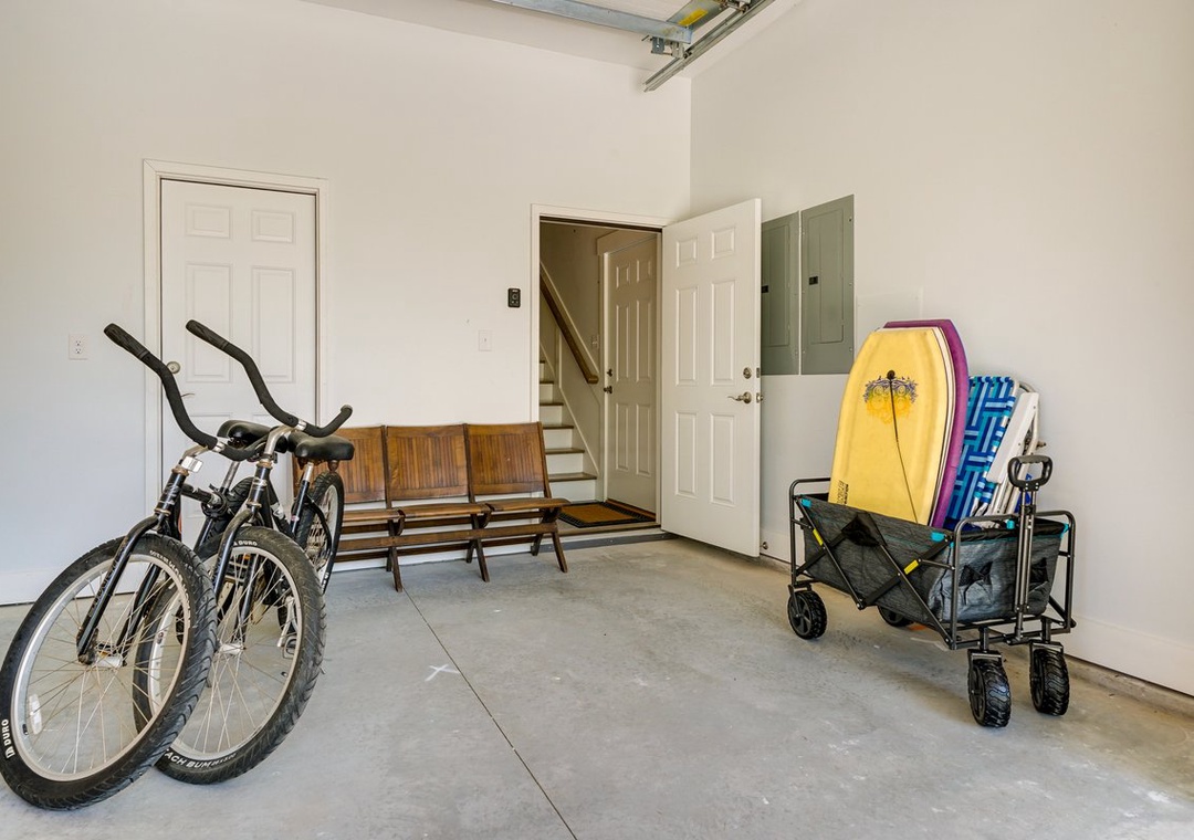 Amenities in the garage include charcoal grill, bikes, beach chairs, beach wagon and boogie boards.