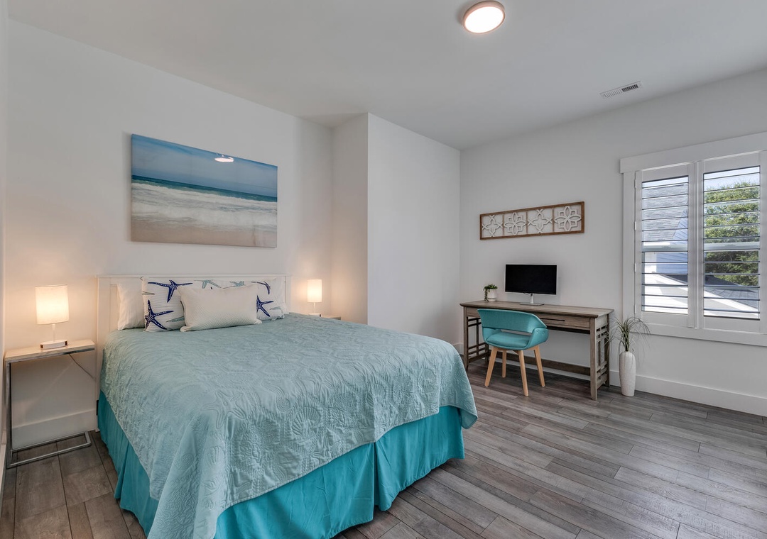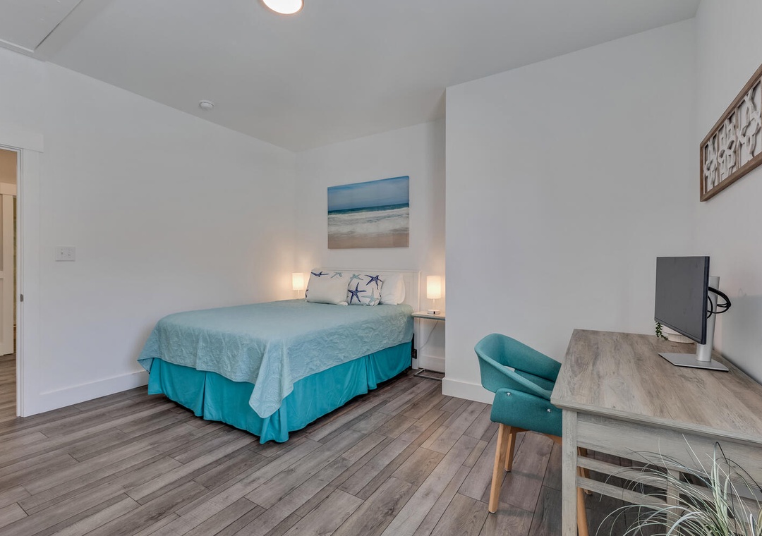 The fully equipped kitchen is ready for all your culinary adventures, whether you're whipping up breakfast before a beach day or enjoying a quiet dinner at home. The cozy, well-furnished living area invites you to kick back and relax with a movie, game night, or good conversation.