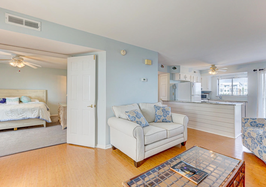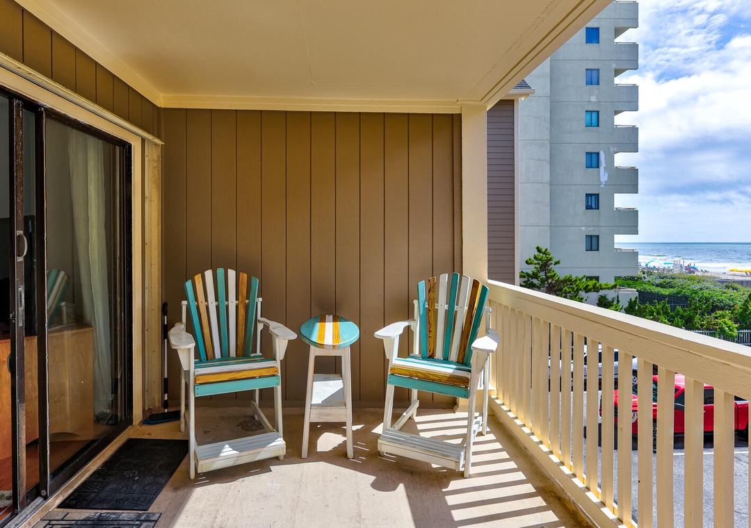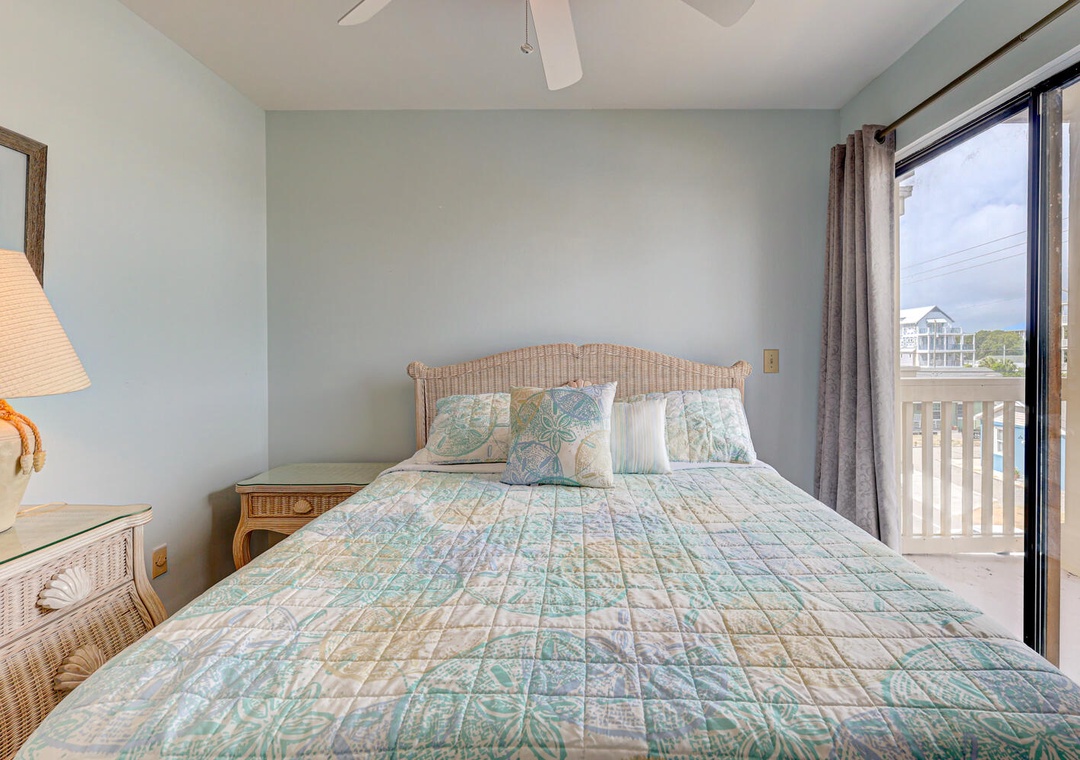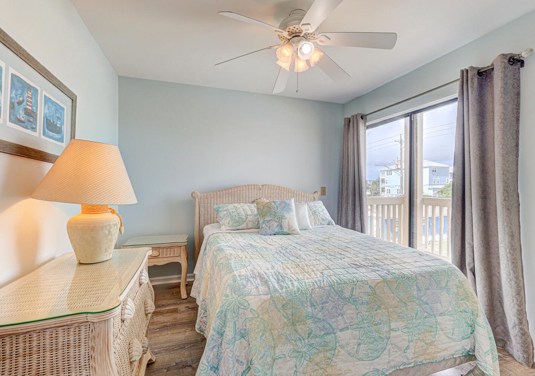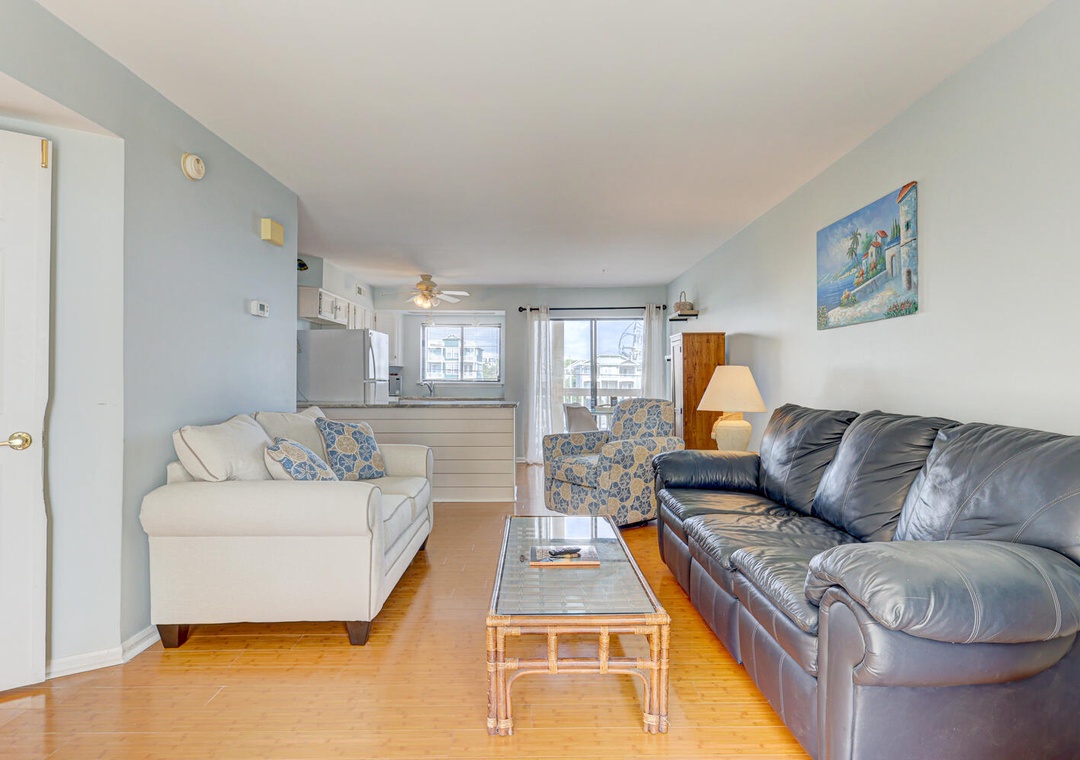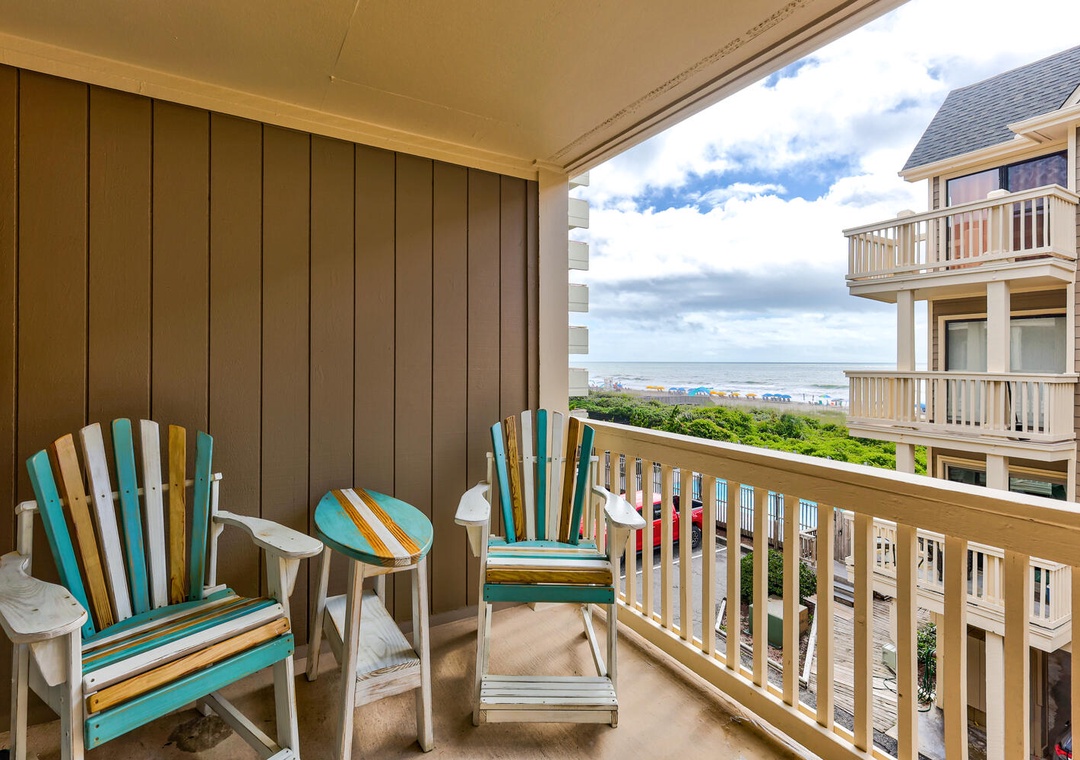 Step into a bright and inviting living space, where a comfortable couch, loveseat, and chair provide plenty of seating to unwind. The adjacent balcony offers stunning ocean views, making it the ideal spot to sip your morning coffee or enjoy the sunset. The fully equipped kitchen includes all the essentials, plus a dining table for four. Both bedrooms offer peaceful retreats, with the master featuring a king bed, an attached bathroom, and a ceiling fan for added comfort. The second bedroom includes a queen bed and access to a private balcony overlooking the road.