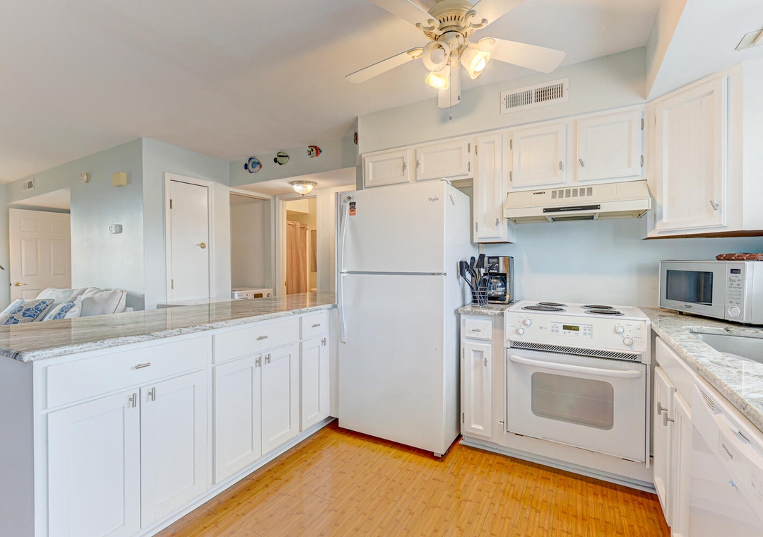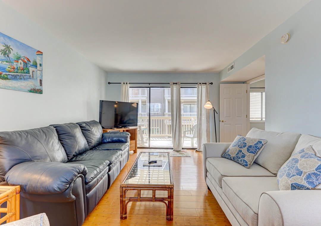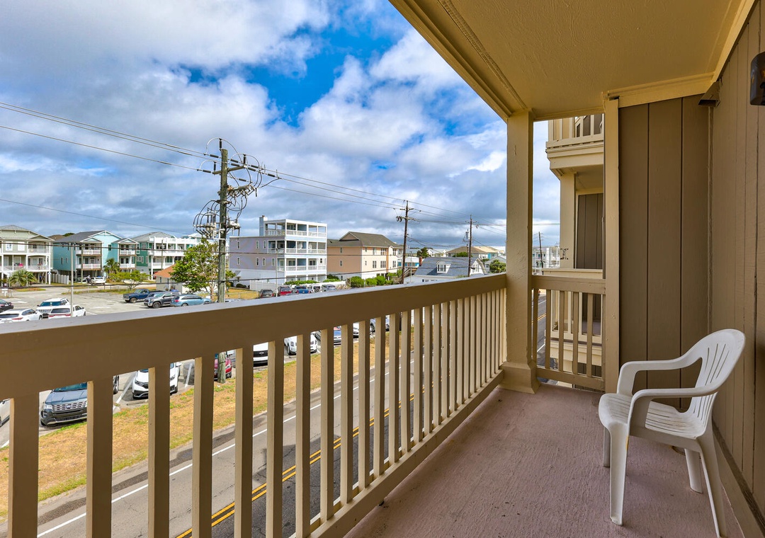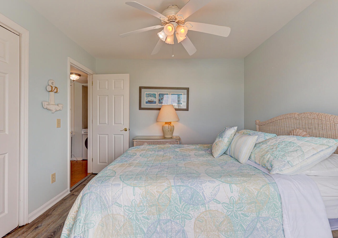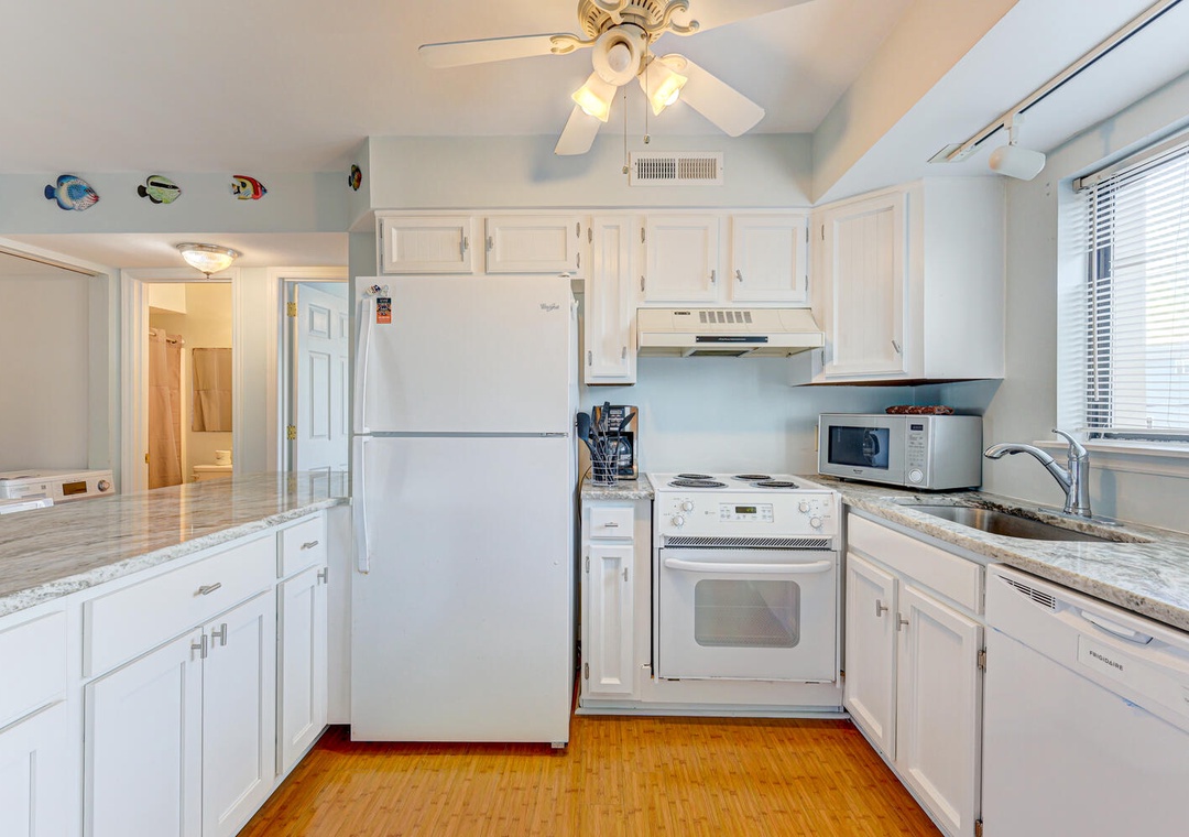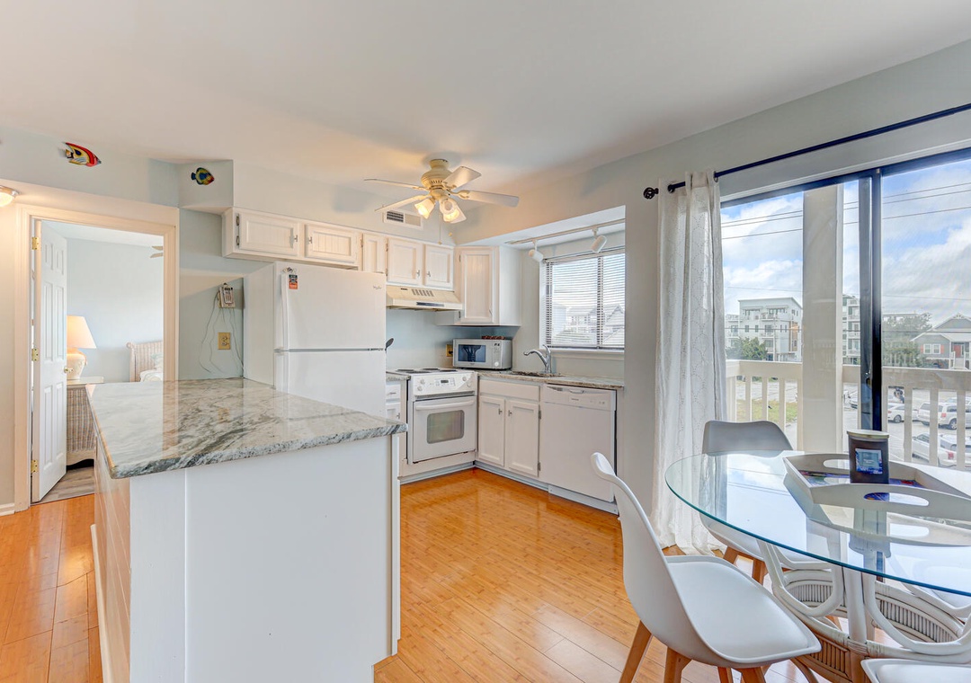 Step into a bright and inviting living space, where a comfortable couch, loveseat, and chair provide plenty of seating to unwind. The adjacent balcony offers stunning ocean views, making it the ideal spot to sip your morning coffee or enjoy the sunset. The fully equipped kitchen includes all the essentials, plus a dining table for four. Both bedrooms offer peaceful retreats, with the master featuring a king bed, an attached bathroom, and a ceiling fan for added comfort. The second bedroom includes a queen bed and access to a private balcony overlooking the road.