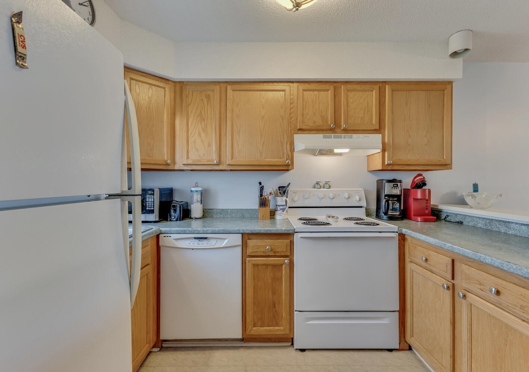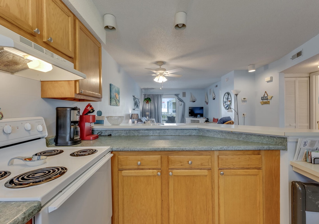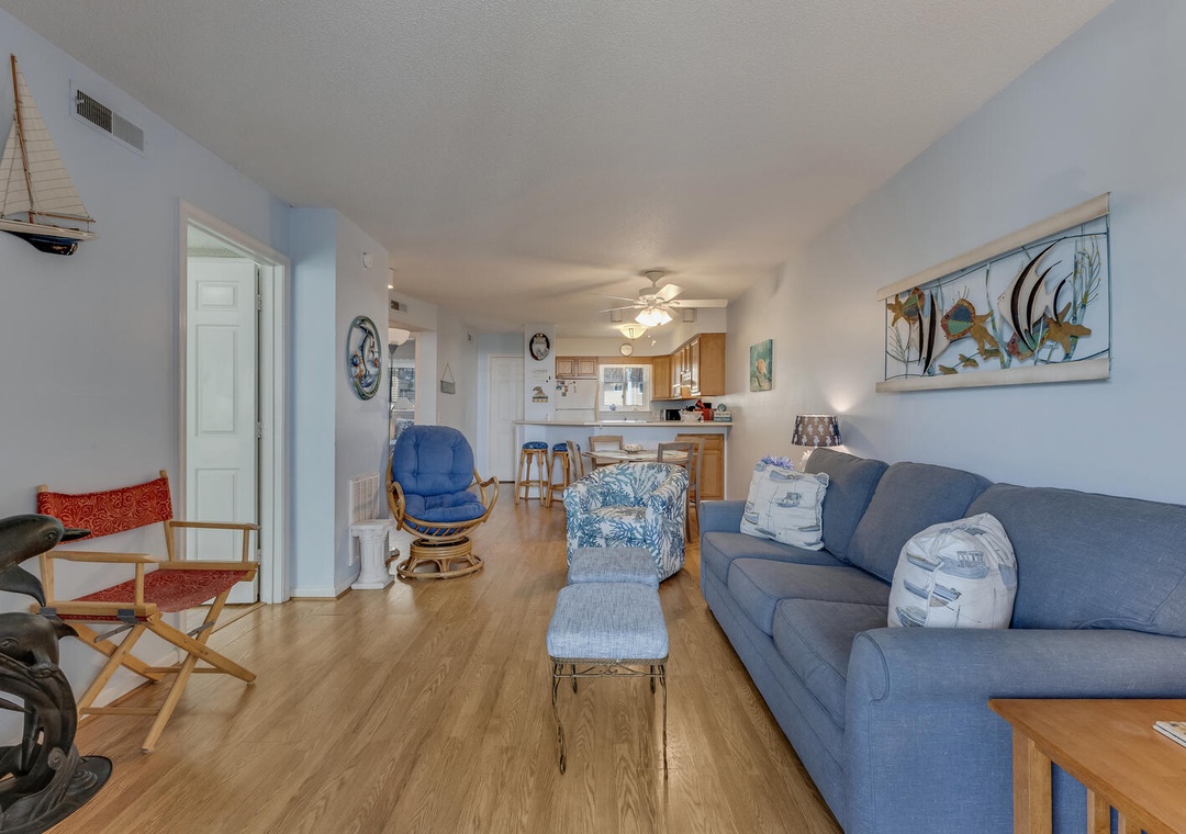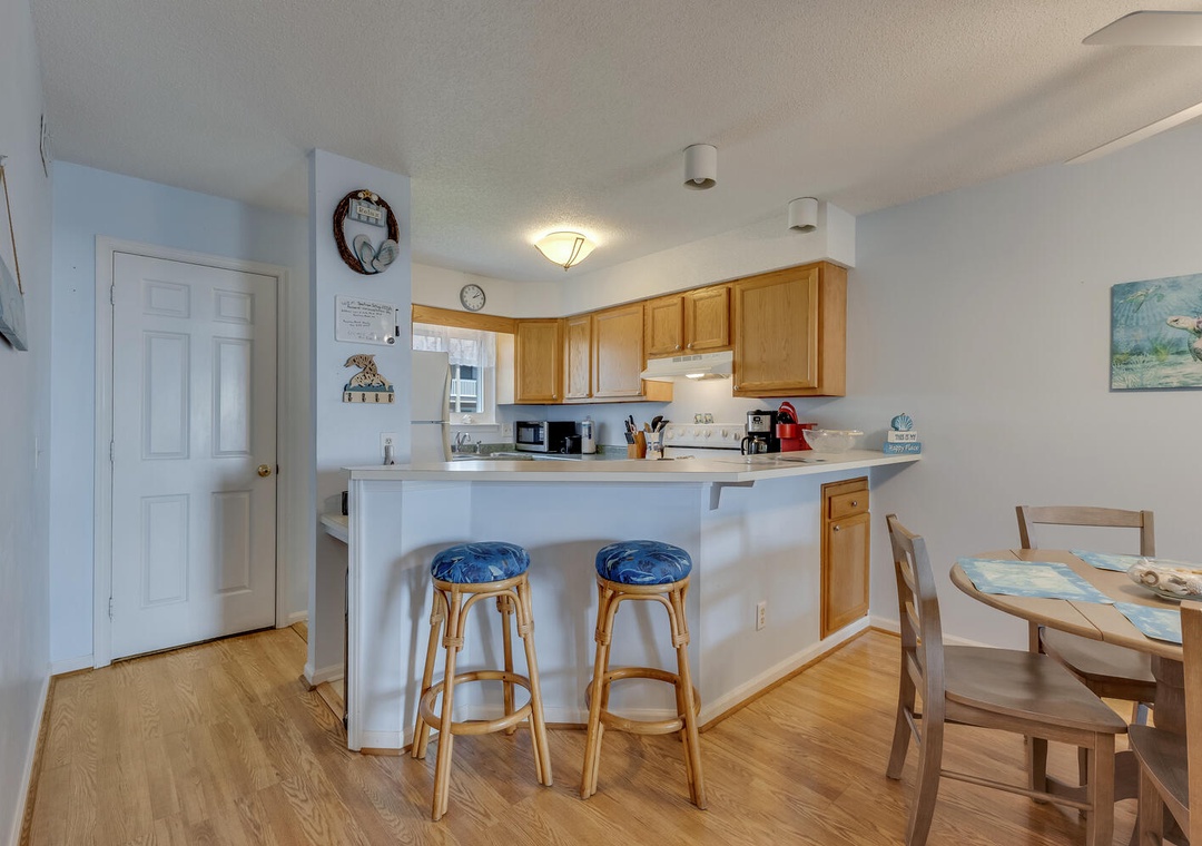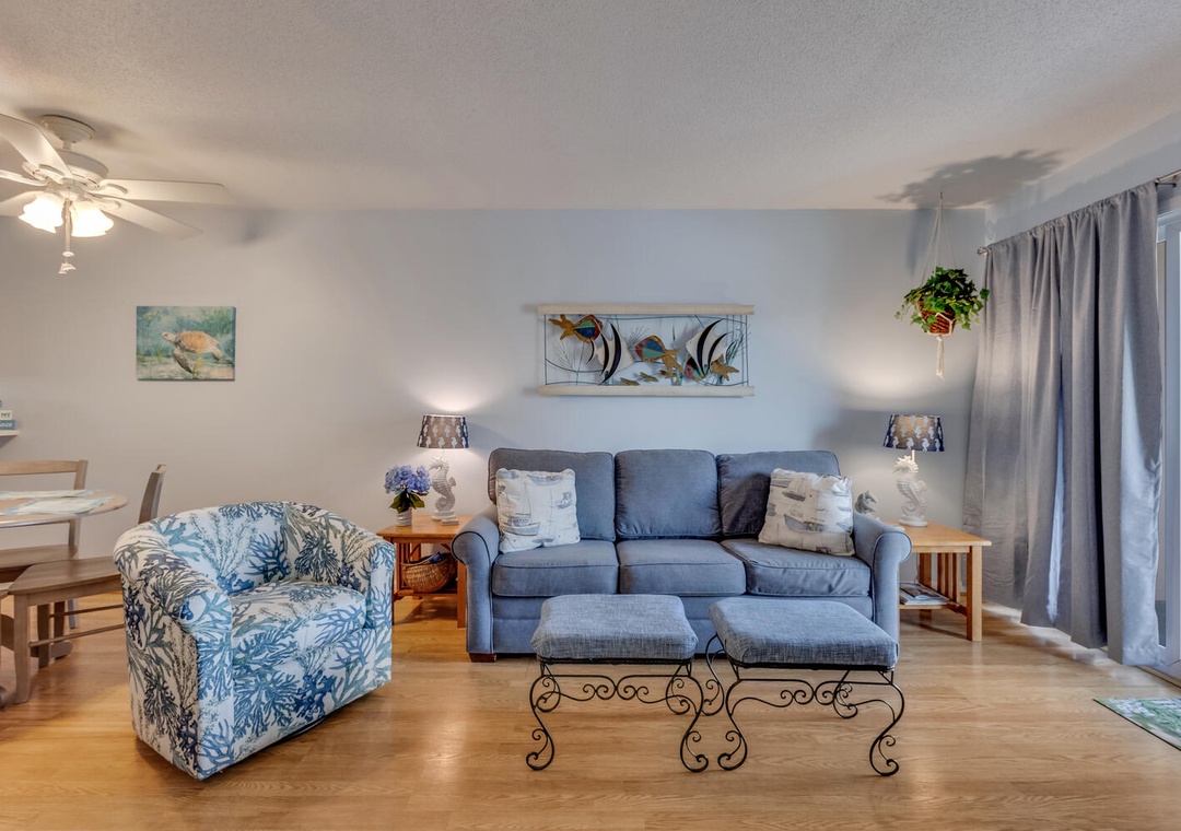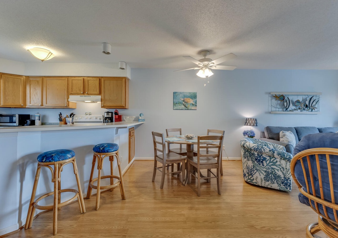 Inside, you'll find an inviting living space with ocean views, a sleeper sofa, comfortable seating, and a flat-screen TV with cable and Blu-Ray for family movie nights. The well-equipped kitchen boasts all the essentials, including a Keurig coffee maker, a panini press, and a George Foreman grill, making meal prep a breeze. The dining area offers seating for four at the table and two at the bar, creating the perfect setting for enjoying meals with loved ones. A washer, dryer, and ironing facilities add convenience to your stay.