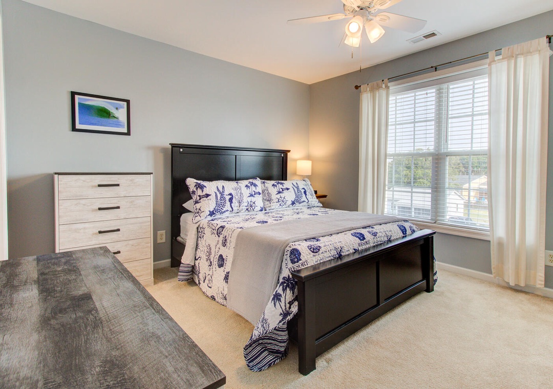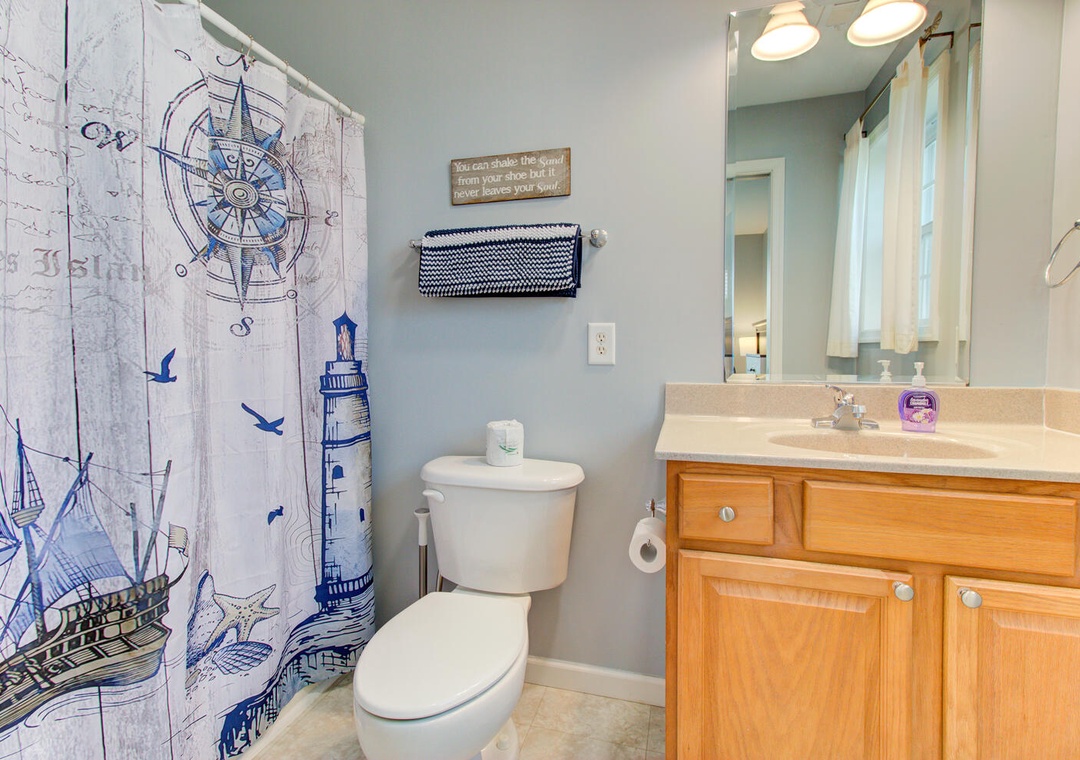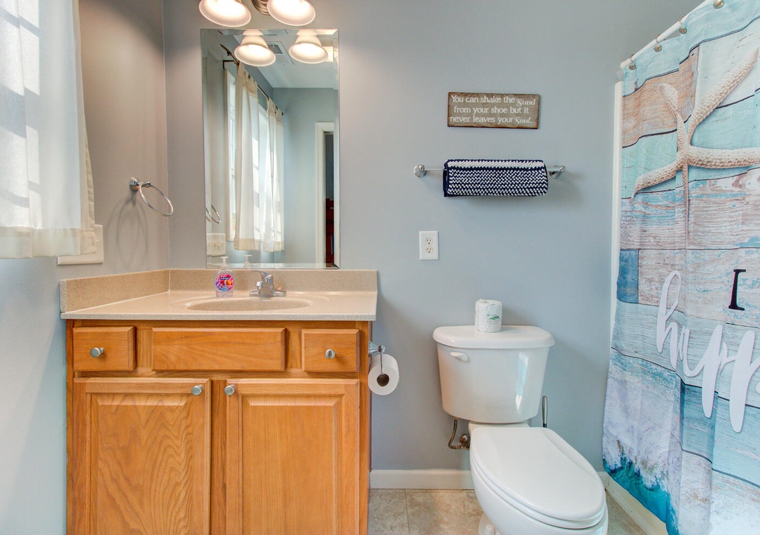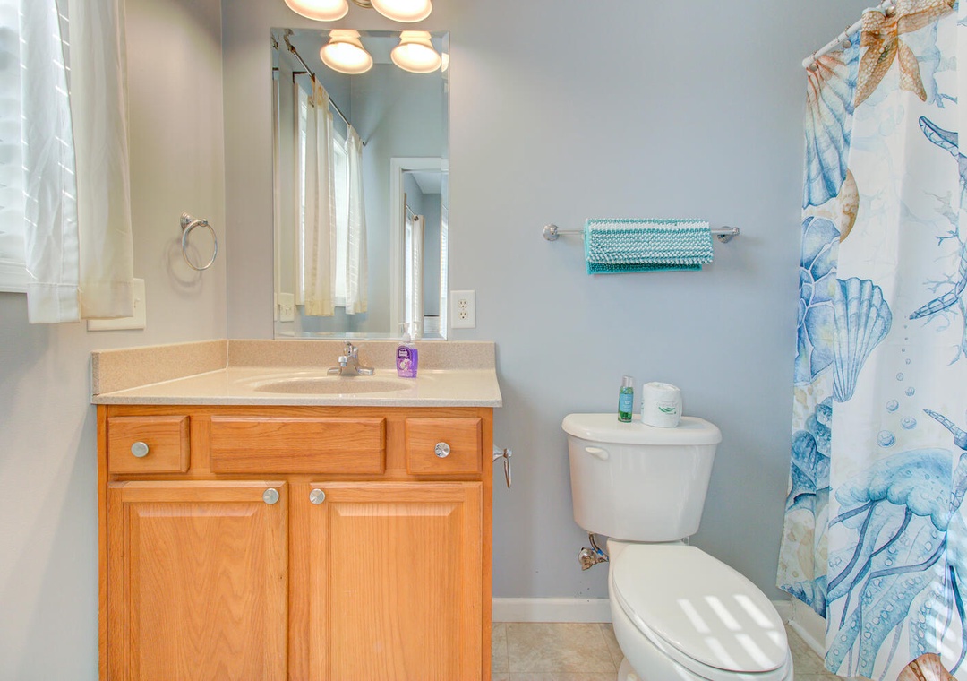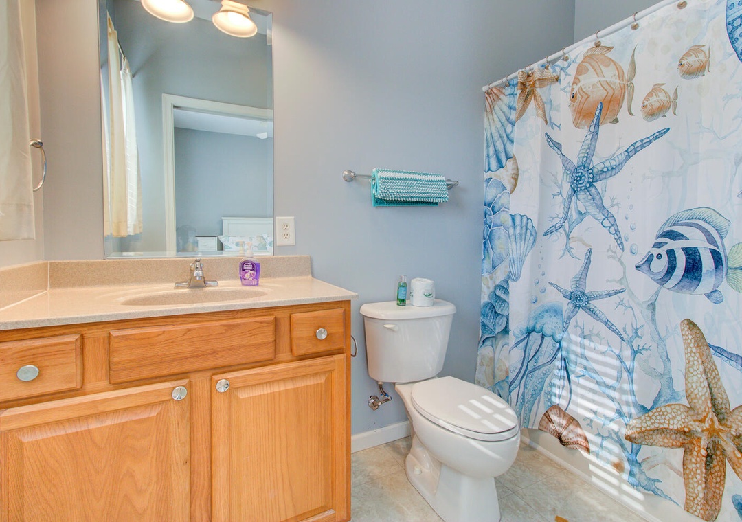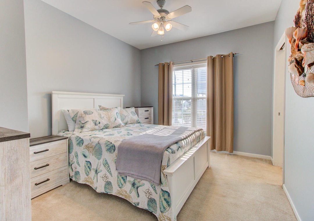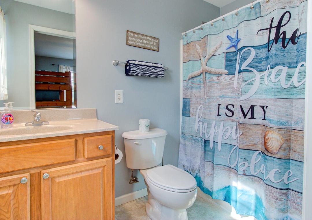 This home offers four spacious bedrooms, including a private master suite with a queen bed, street views, a ceiling fan, and an en-suite bathroom featuring a glass door walk-in shower and double vanity sinks. Two additional queen bedrooms provide comfortable accommodations, while the fourth bedroom includes a twin-over-full bunk bed with a twin trundle, perfect for kids or extra guests.