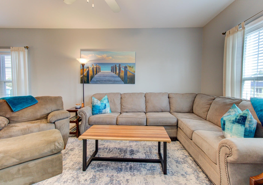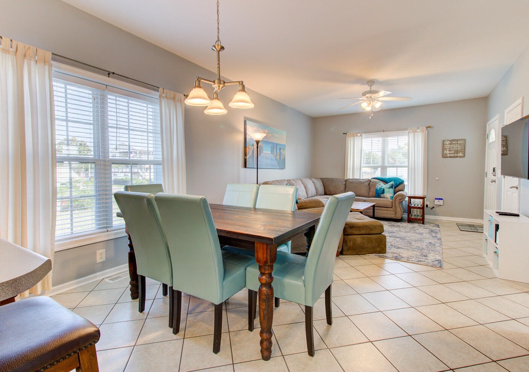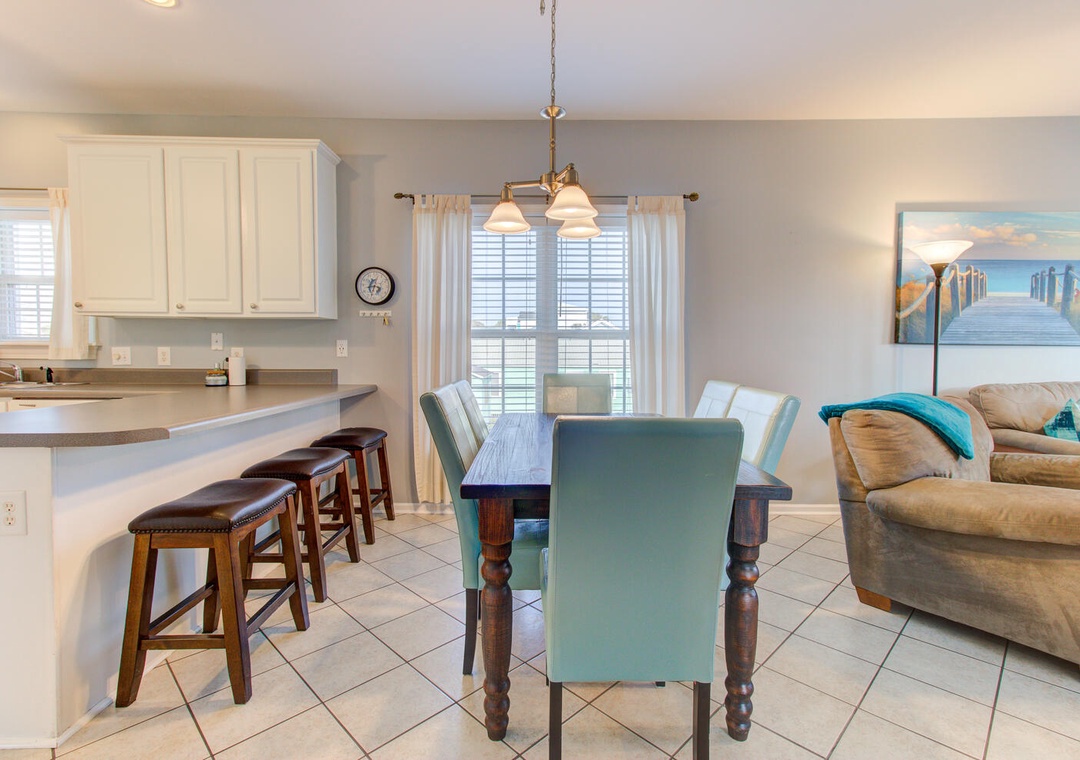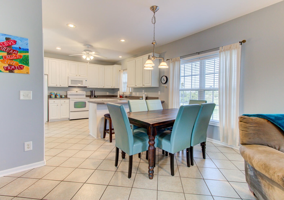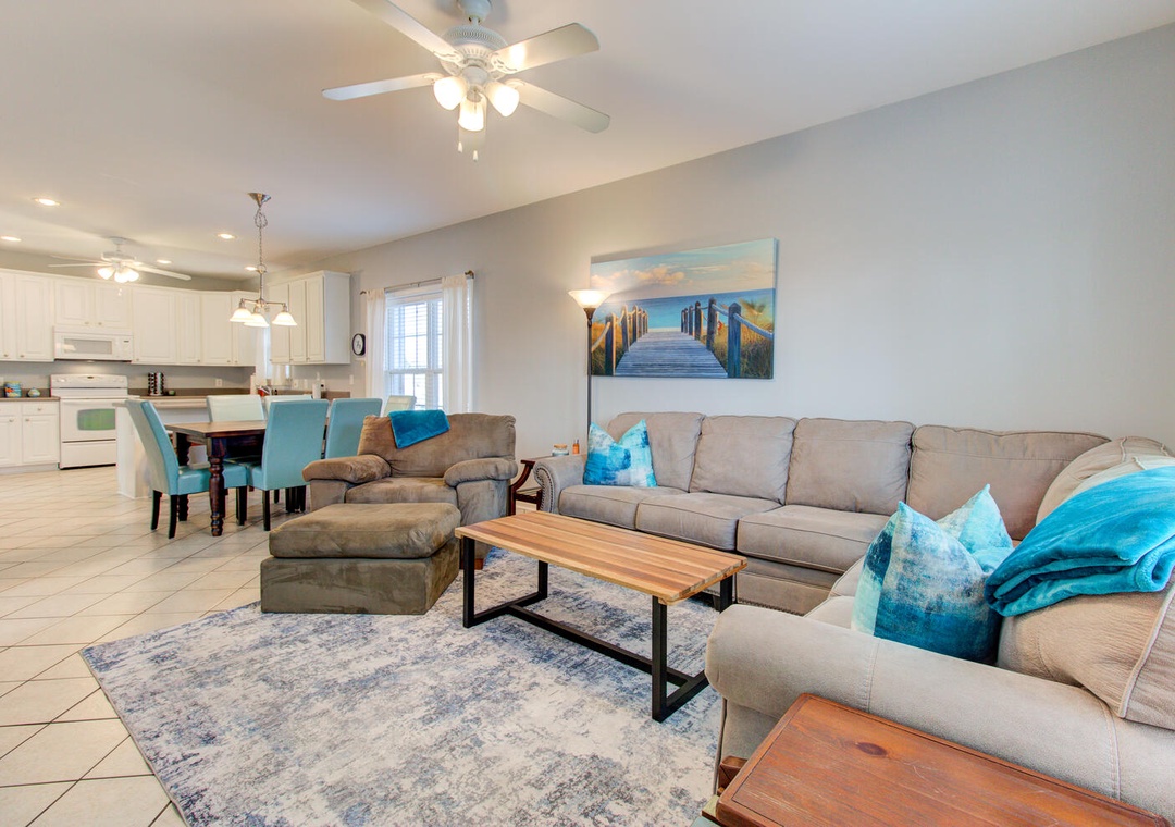 The inviting living room features a wrap-around couch, a cozy chair, a flat-screen TV, and a ceiling fan, creating a welcoming space to relax after a day at the beach. The well-equipped kitchen includes a flat cooktop stove, refrigerator, microwave, toaster oven, and a crockpot. Enjoy meals together at the dining table with seating for six, plus additional barstool seating for three.
