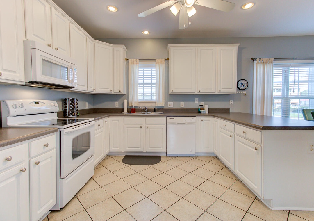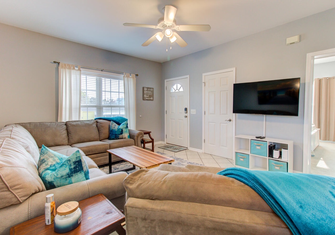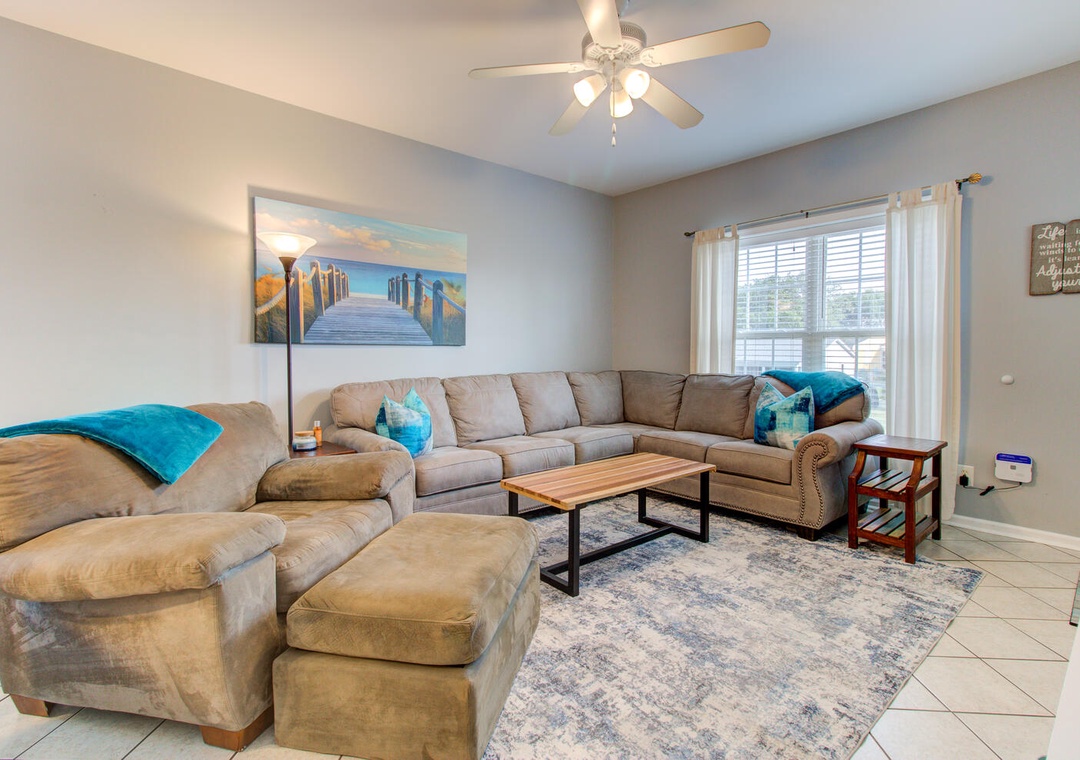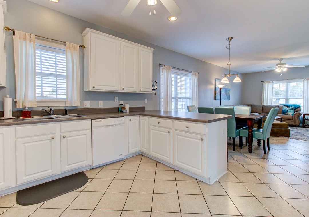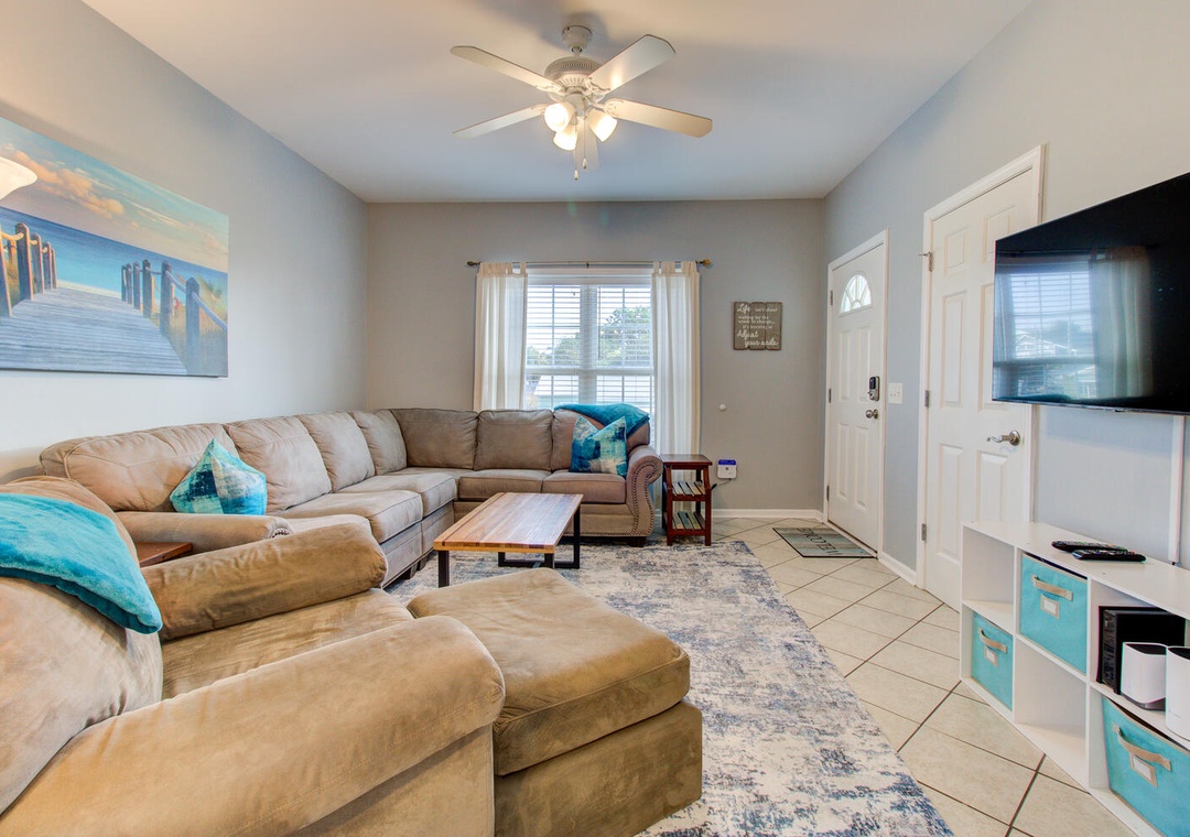 The inviting living room features a wrap-around couch, a cozy chair, a flat-screen TV, and a ceiling fan, creating a welcoming space to relax after a day at the beach. The well-equipped kitchen includes a flat cooktop stove, refrigerator, microwave, toaster oven, and a crockpot. Enjoy meals together at the dining table with seating for six, plus additional barstool seating for three.
