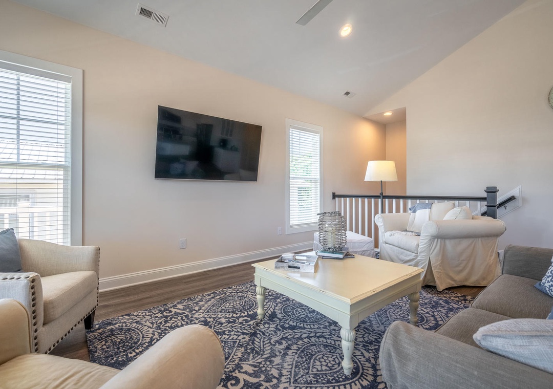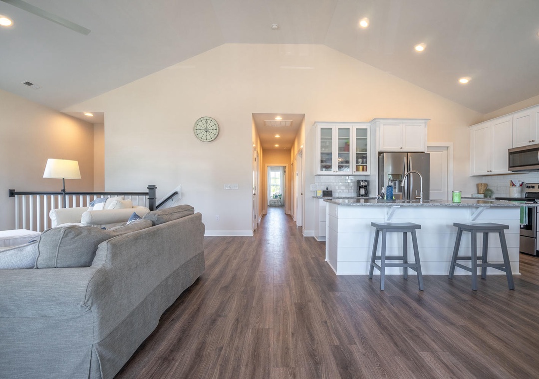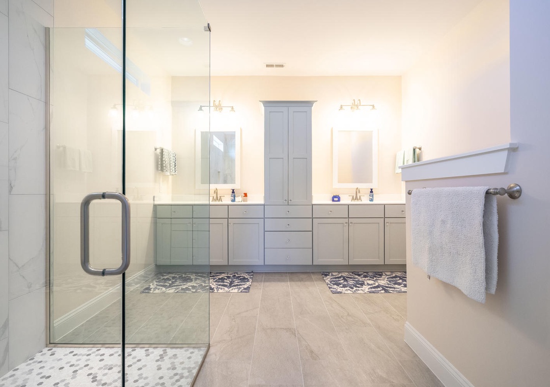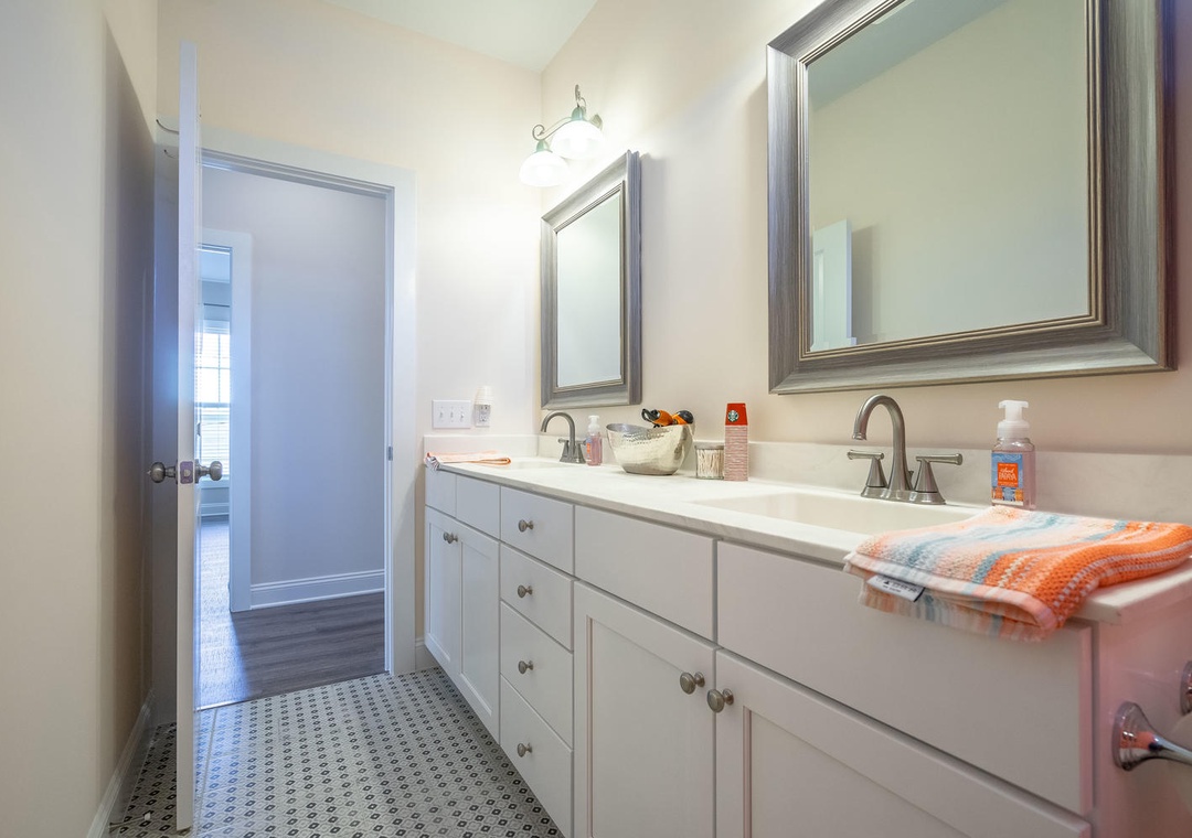 The sleeping accommodations at SeaWave are both comfortable and thoughtfully designed. The master suite features a king bed, a private bathroom with a double vanity and glass-door shower, a walk-in closet, and a ceiling fan for added comfort. A second bedroom also offers a king bed, a walk-in closet, and a shared bathroom with double vanity sinks and a tub/shower combo. The third bedroom is ideal for kids or groups, featuring two sets of twin-over-twin bunk beds and shared access to the bathroom. With its prime amenities and inviting atmosphere, SeaWave provides the perfect setting for a relaxing and adventure-filled beach vacation.