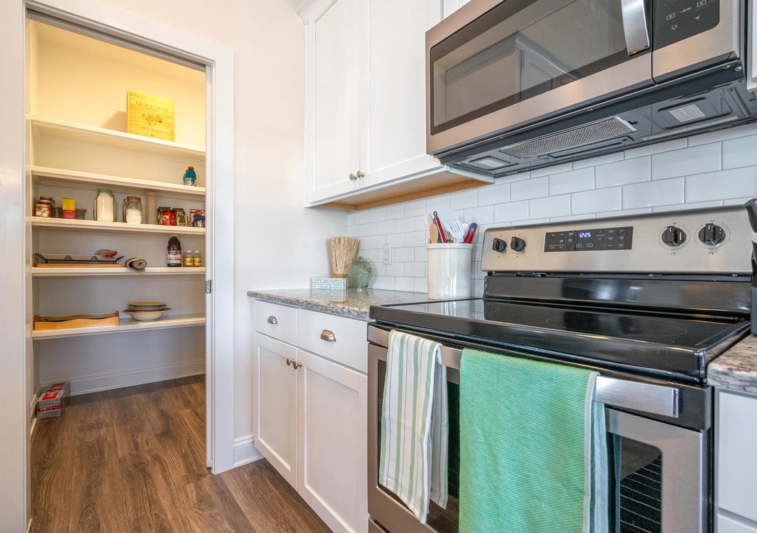Inside, the kitchen and dining space are designed for gathering and entertaining, with a dining table for eight and a kitchen bar with additional seating. A fully equipped kitchen includes modern appliances such as a flat cooktop stove, wine cooler, electric skillet, and four-piece toaster, making meal preparation a breeze. The living room provides a welcoming space to unwind, with seating for six, a flat-screen TV with cable, a Google Home speaker, and an assortment of books and cards for entertainment. A dedicated laundry area with a washer, dryer, and ironing essentials ensures convenience during longer stays.
