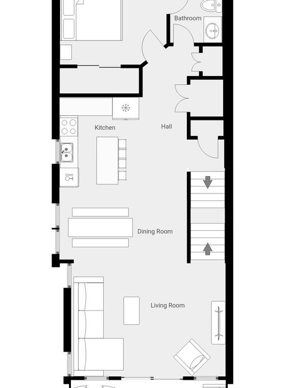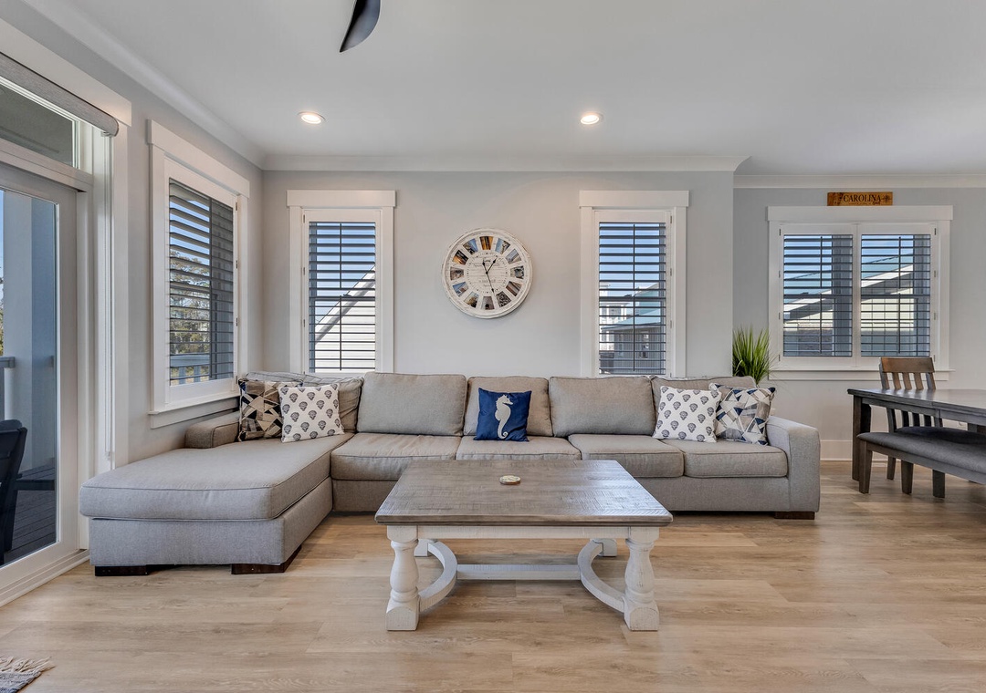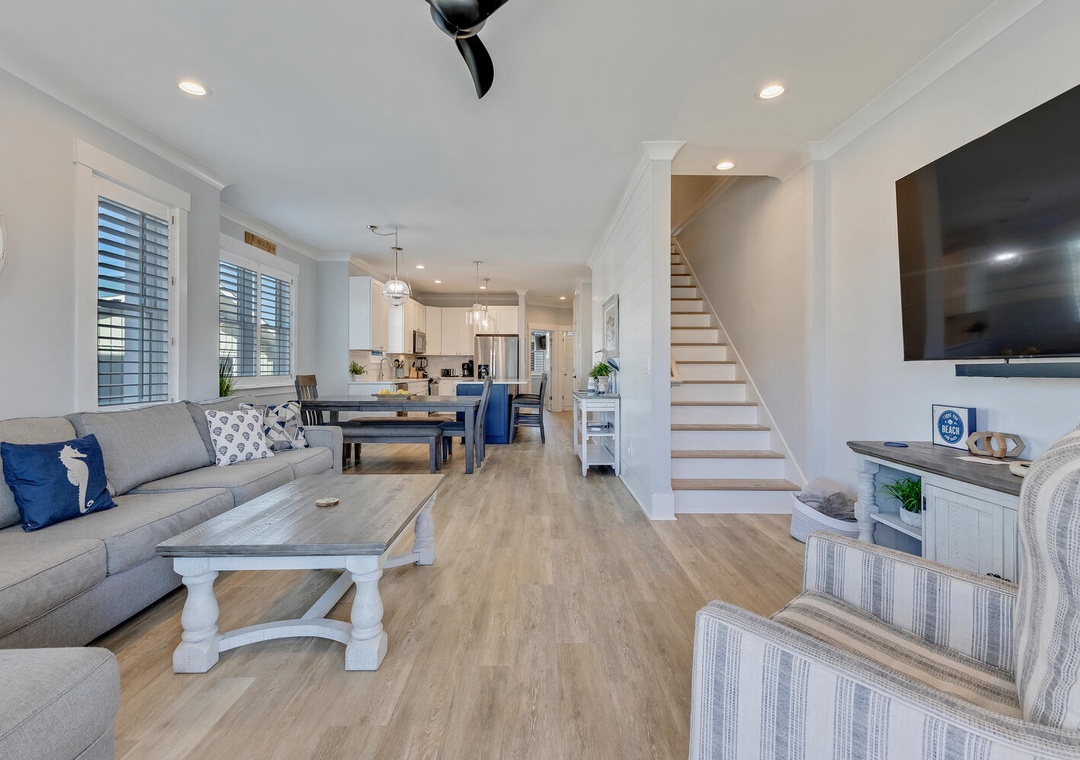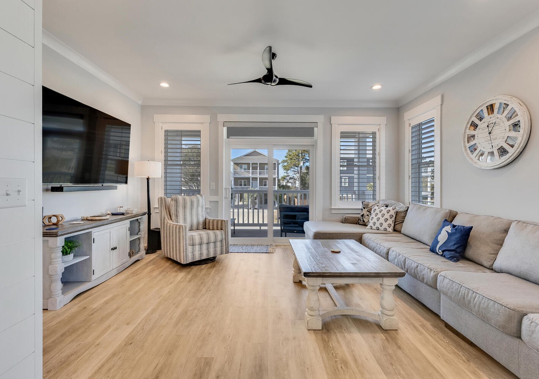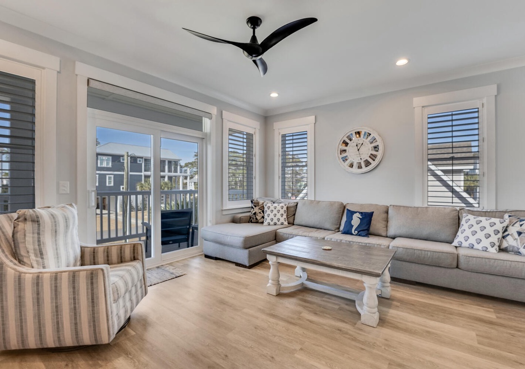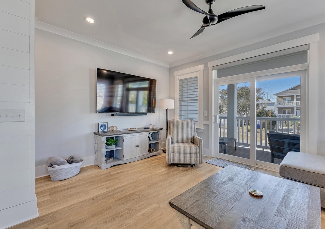 Living Room: Queen size sofa sleeper. Upholstered side chairs. Ceiling Fan and Smart TV. Window Wall and Sliding Doors to Front Porch