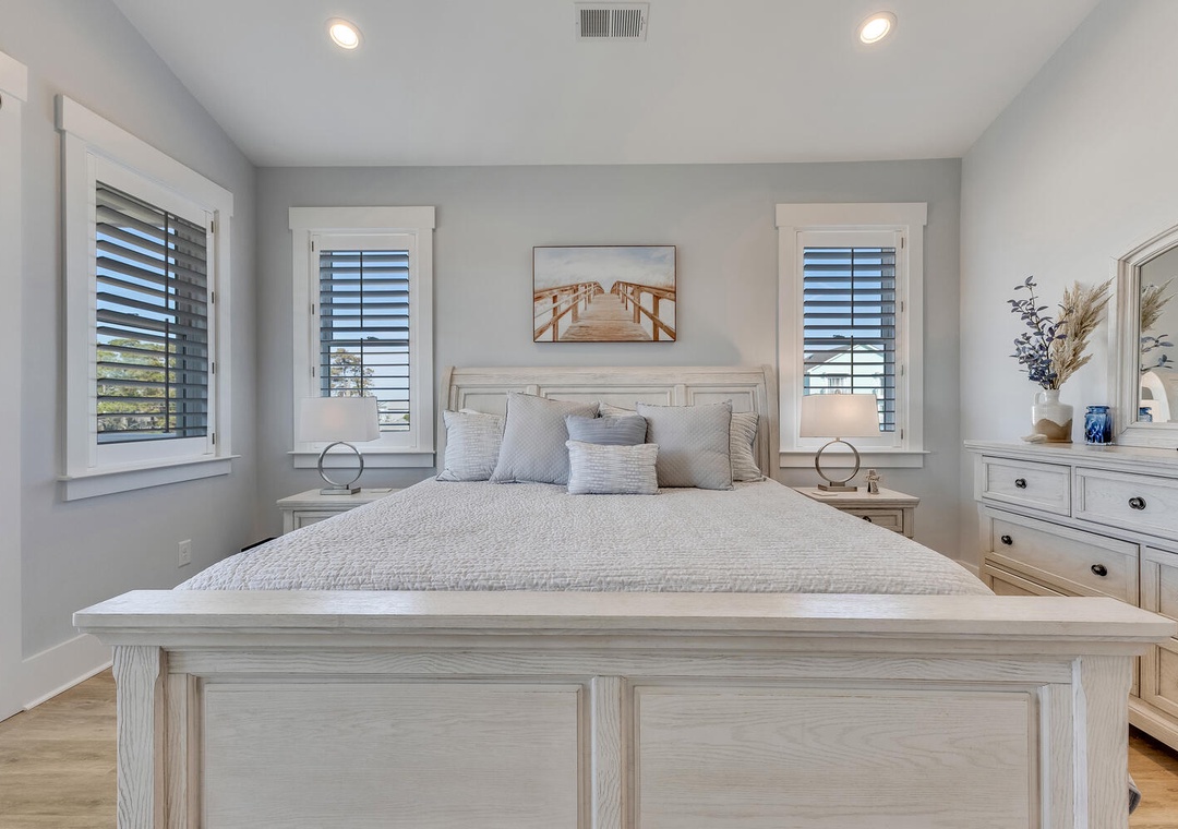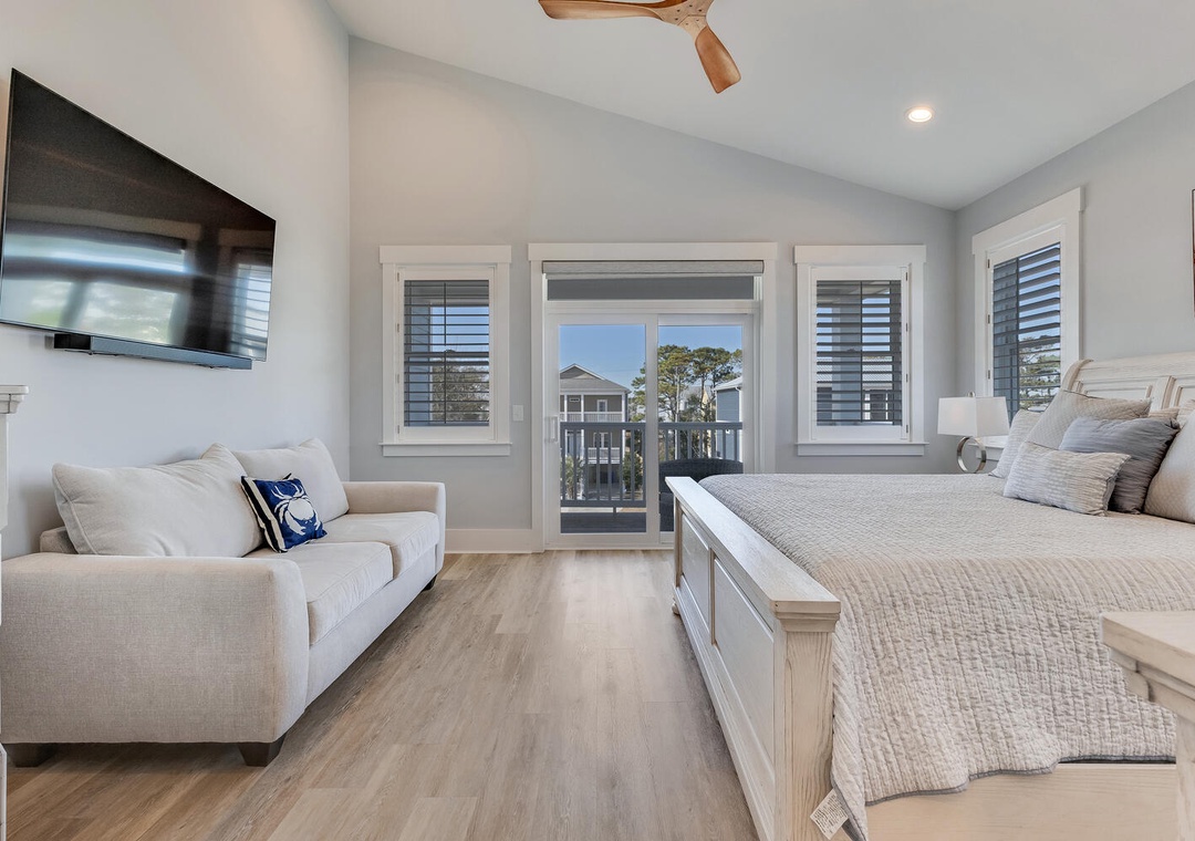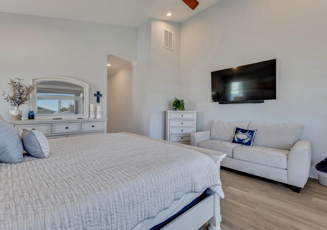 Primary Bedroom Suite with King Bed. Ensuite Bath. Ceiling fan, Smart TV. Private Porch.