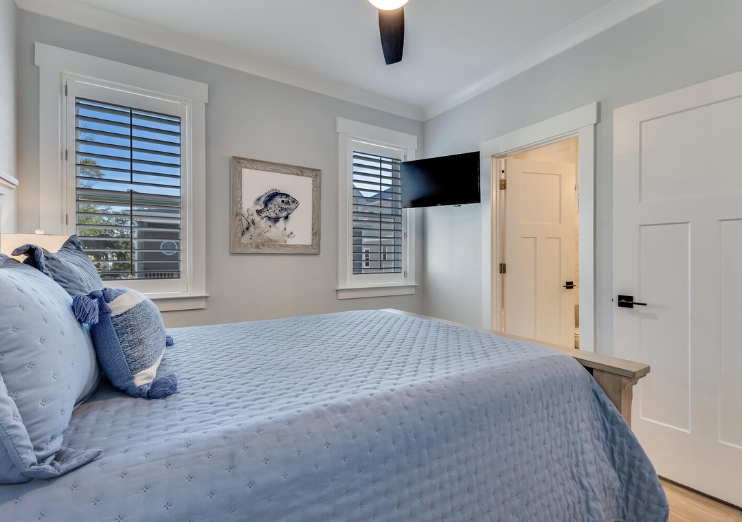 Guest Bedroom with Queen Bed. Ceiling Fan and Smart TV. Ensuite Bath.
