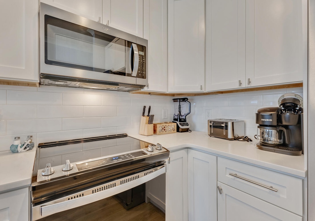 Kitchen: Oversized Stainless sink with pull spray faucet. Stainless steel appliances: Dishwasher, Microwave, Electric Range, Side by Side Refrigerator. Access to Hallway Bathroom.