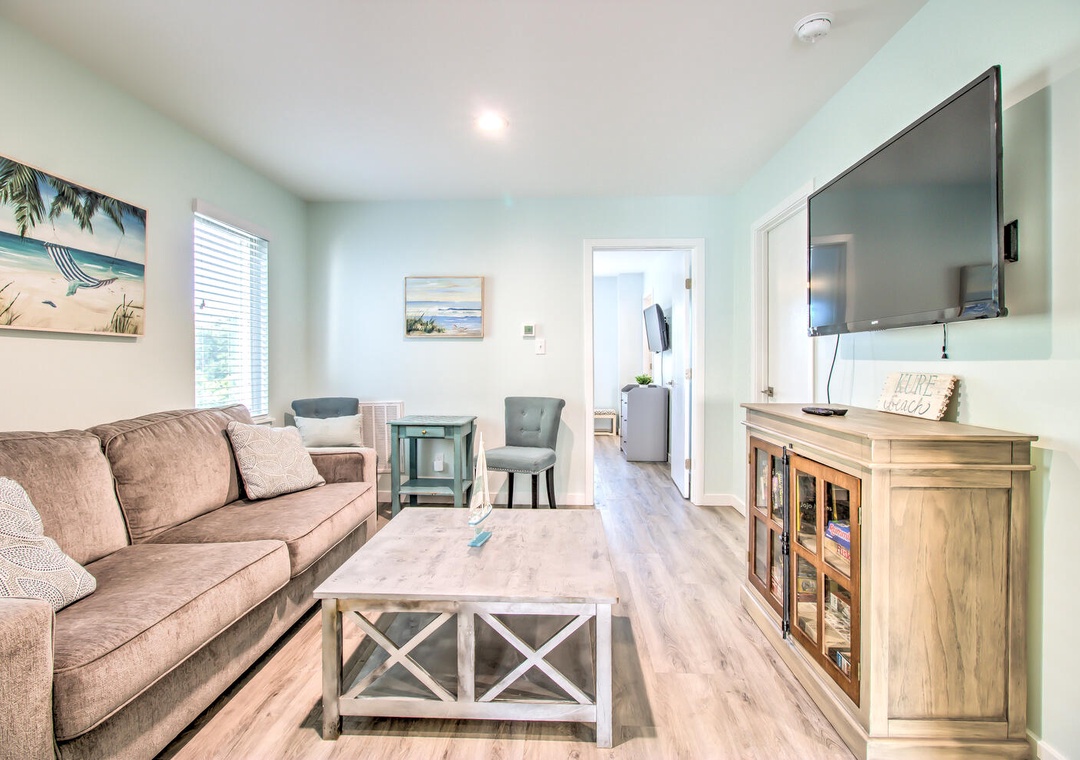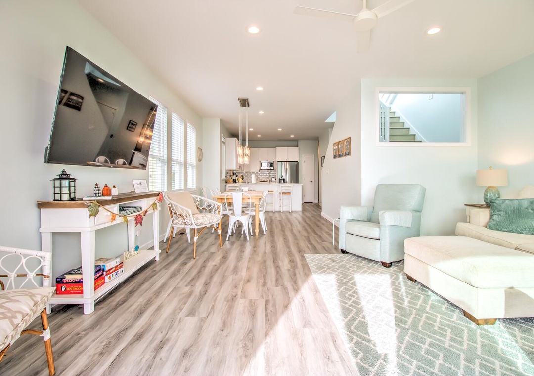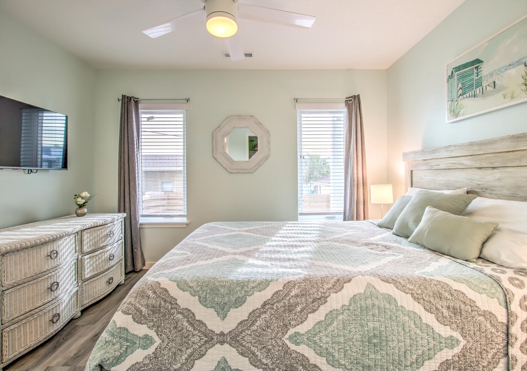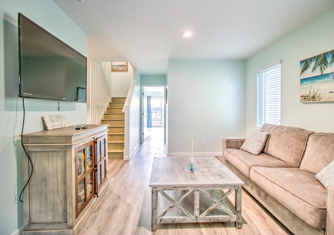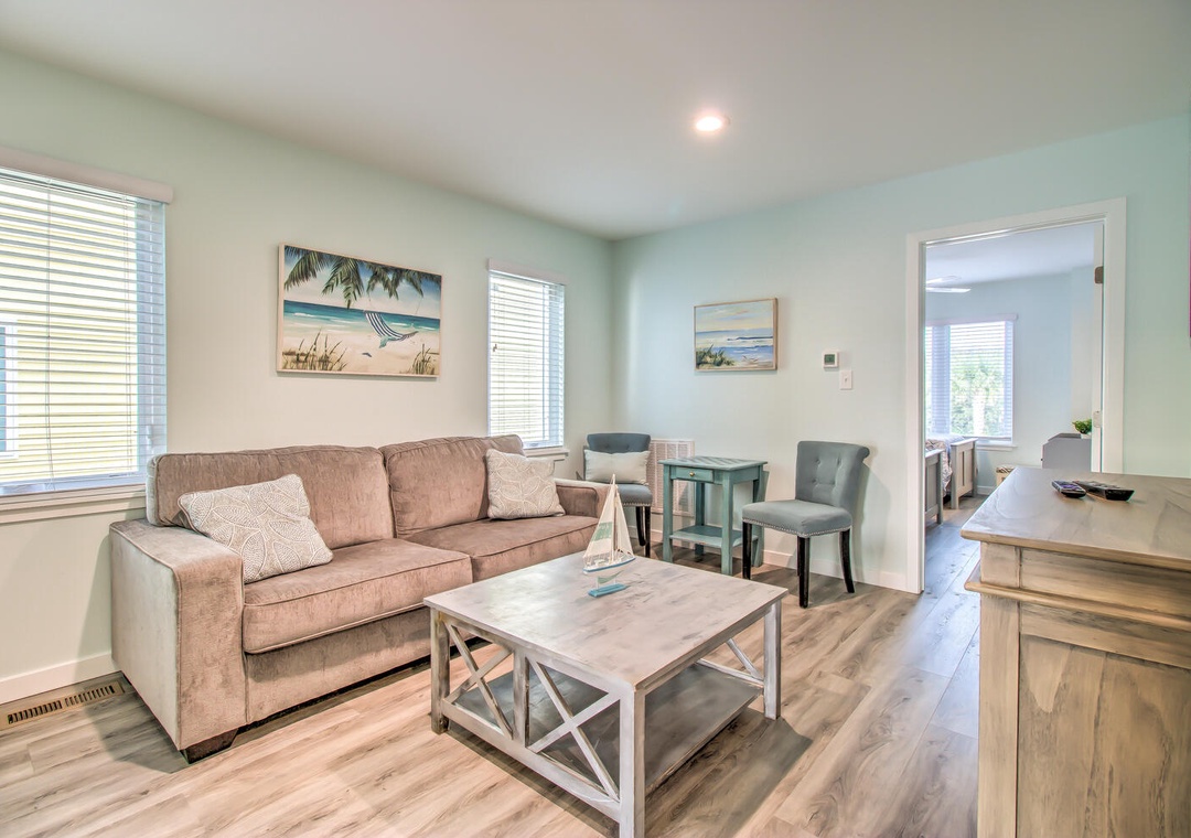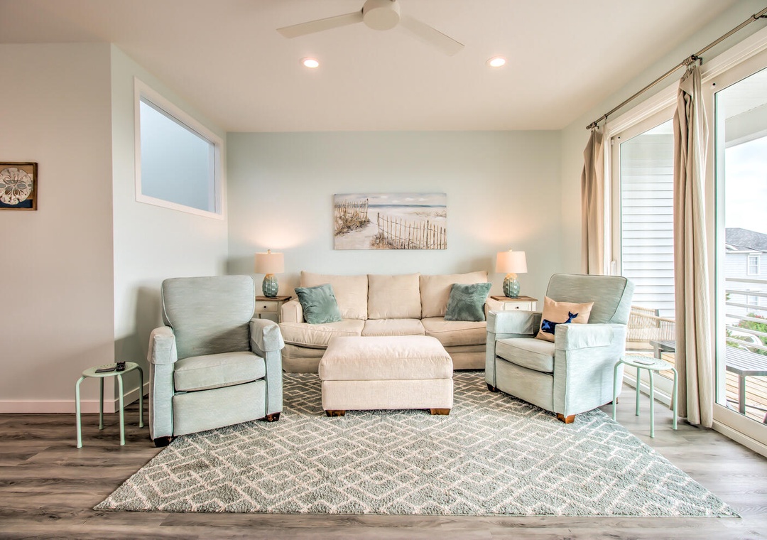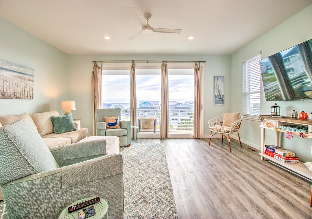 Serenity by the Sea boasts spacious living and sleeping areas designed to suit families and groups alike. With its street and side views, the living room offers deck access, a flat-screen TV with streaming, and comfortable seating for seven, including a queen sleeper sofa for additional guests. The home features four well-appointed bedrooms: a luxurious master suite on the 2nd floor with a king bed, private balcony, and en-suite bathroom with a glass walk-in shower and double vanity sinks; a second bedroom on the 2nd floor with twin beds and a private bath; a 3rd-floor bedroom with a queen bed and a shared bathroom featuring a glass door walk-in shower; and a cozy bedroom on the 1st floor with a queen bed and convenient access to a shared bathroom at the entrance. Additional amenities like a second-floor laundry area with a top-loading washer and front-loading dryer, along with a common area boasting a flat-screen TV and seating for five, complete this perfect coastal getaway.