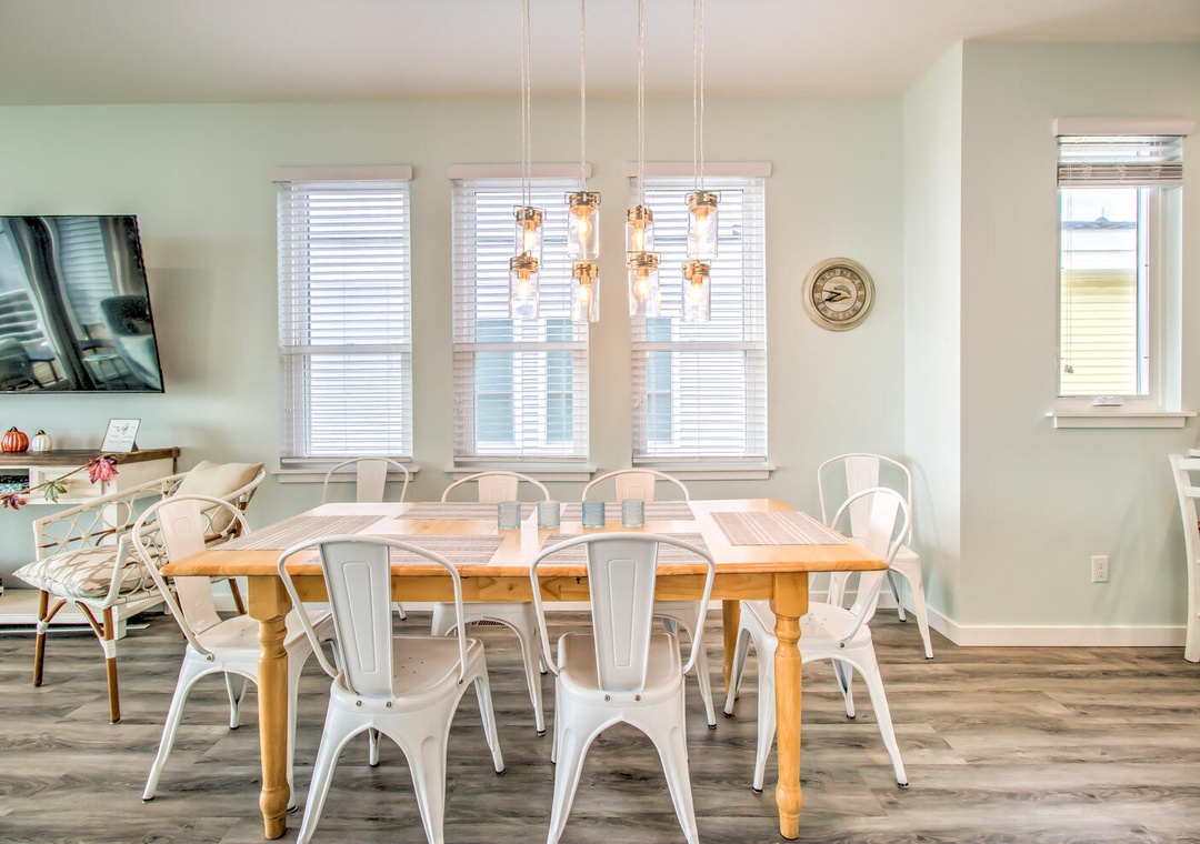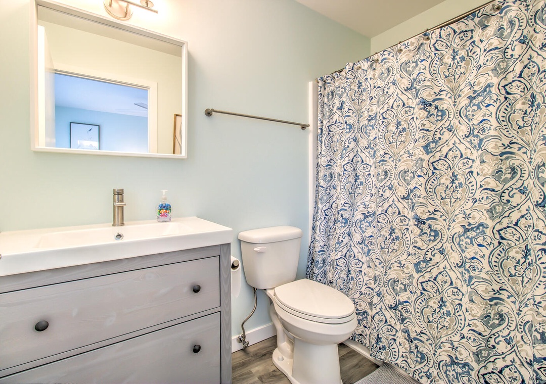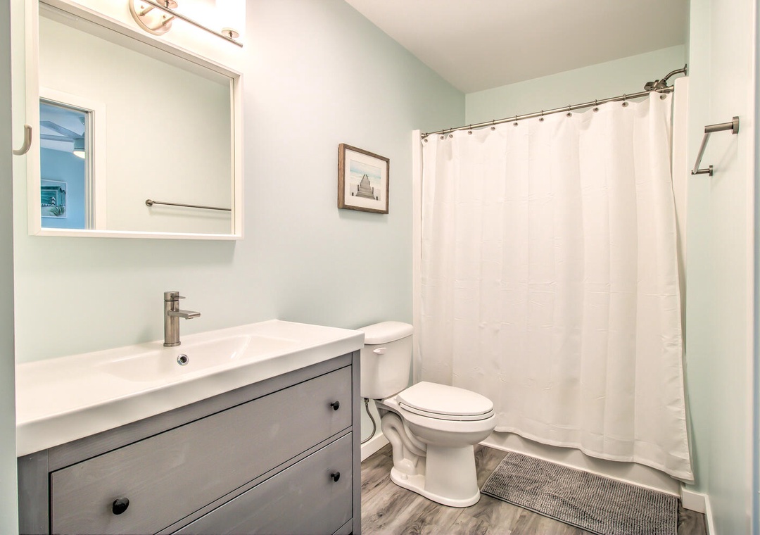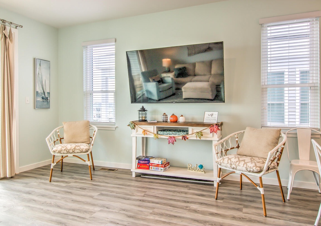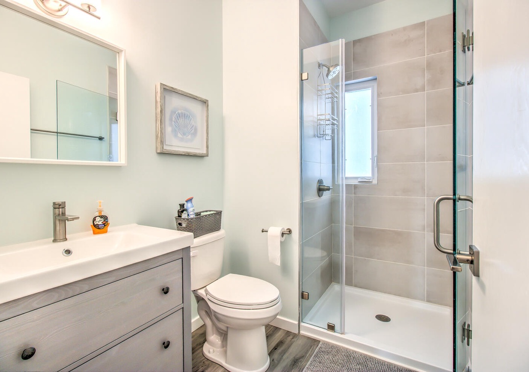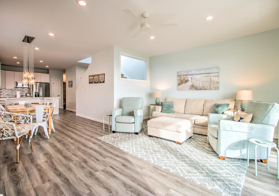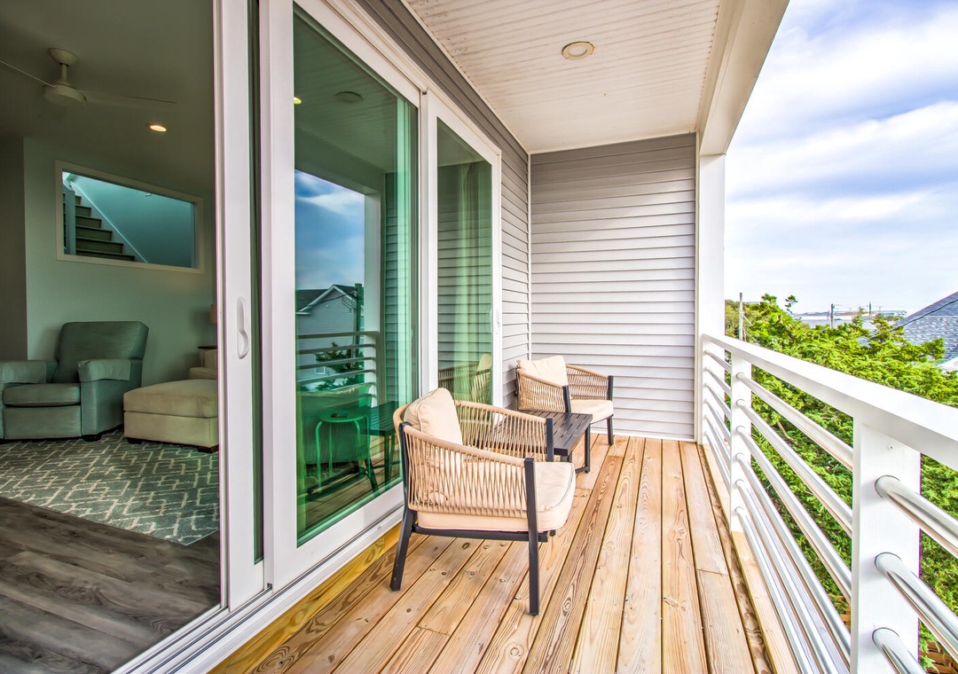 Serenity by the Sea boasts spacious living and sleeping areas designed to suit families and groups alike. With its street and side views, the living room offers deck access, a flat-screen TV with streaming, and comfortable seating for seven, including a queen sleeper sofa for additional guests. The home features four well-appointed bedrooms: a luxurious master suite on the 2nd floor with a king bed, private balcony, and en-suite bathroom with a glass walk-in shower and double vanity sinks; a second bedroom on the 2nd floor with twin beds and a private bath; a 3rd-floor bedroom with a queen bed and a shared bathroom featuring a glass door walk-in shower; and a cozy bedroom on the 1st floor with a queen bed and convenient access to a shared bathroom at the entrance. Additional amenities like a second-floor laundry area with a top-loading washer and front-loading dryer, along with a common area boasting a flat-screen TV and seating for five, complete this perfect coastal getaway.