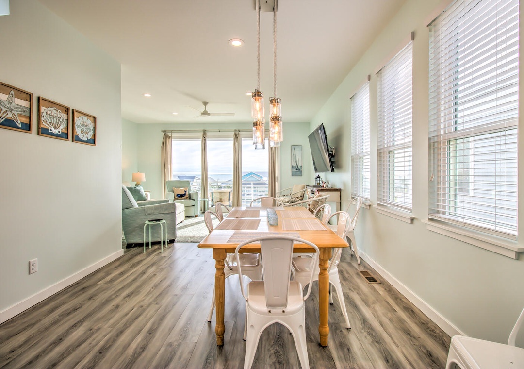 A standout feature of this coastal retreat is the 3rd-floor rooftop patio, where guests can unwind while admiring breathtaking ocean views and the picturesque Kure Beach. The rooftop is thoughtfully furnished with seating for five and a dining table that accommodates six, providing an ideal setting for intimate meals or relaxed evenings under the stars. Complementing this outdoor haven is an equally inviting kitchen and dining area on the 3rd floor, complete with a large dining table for eight, a kitchen bar for four, and a full suite of modern appliances—from a refrigerator with an ice maker to a 12-cup drip coffee maker—making meal preparation a delight.