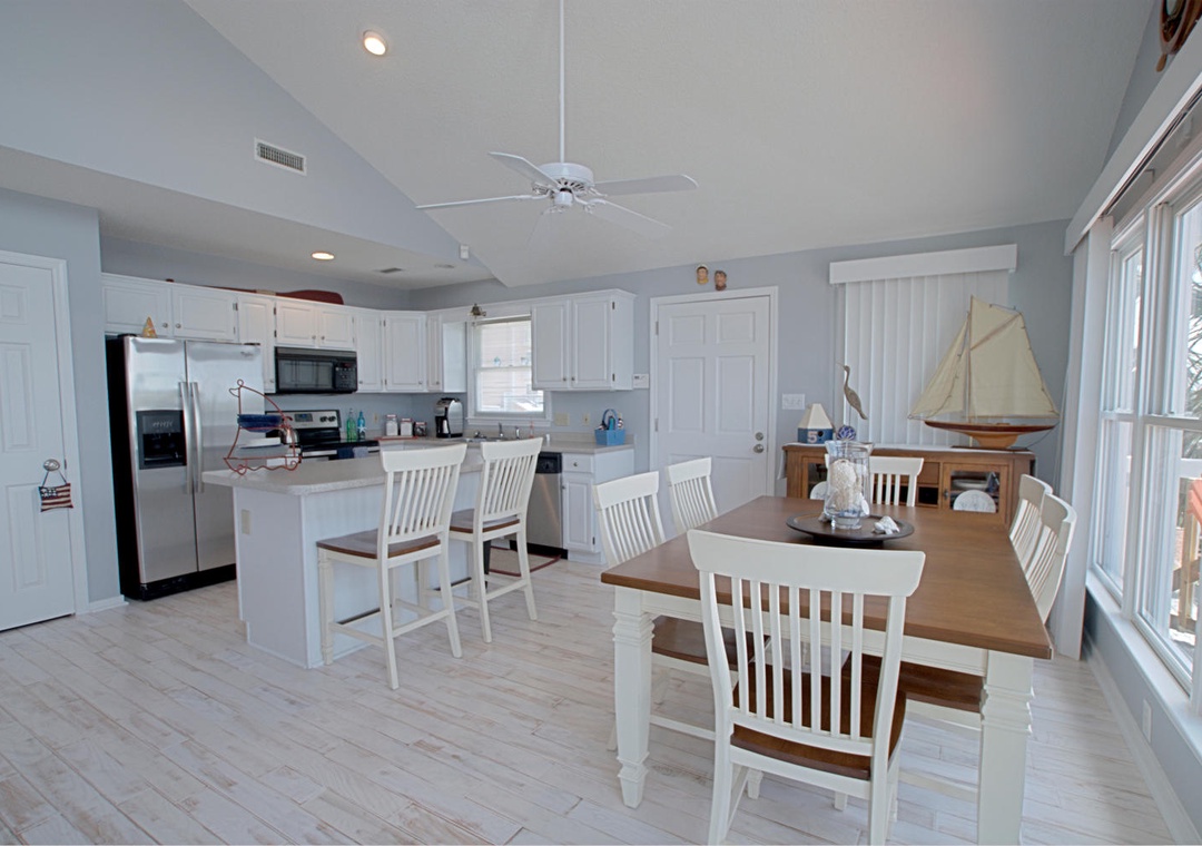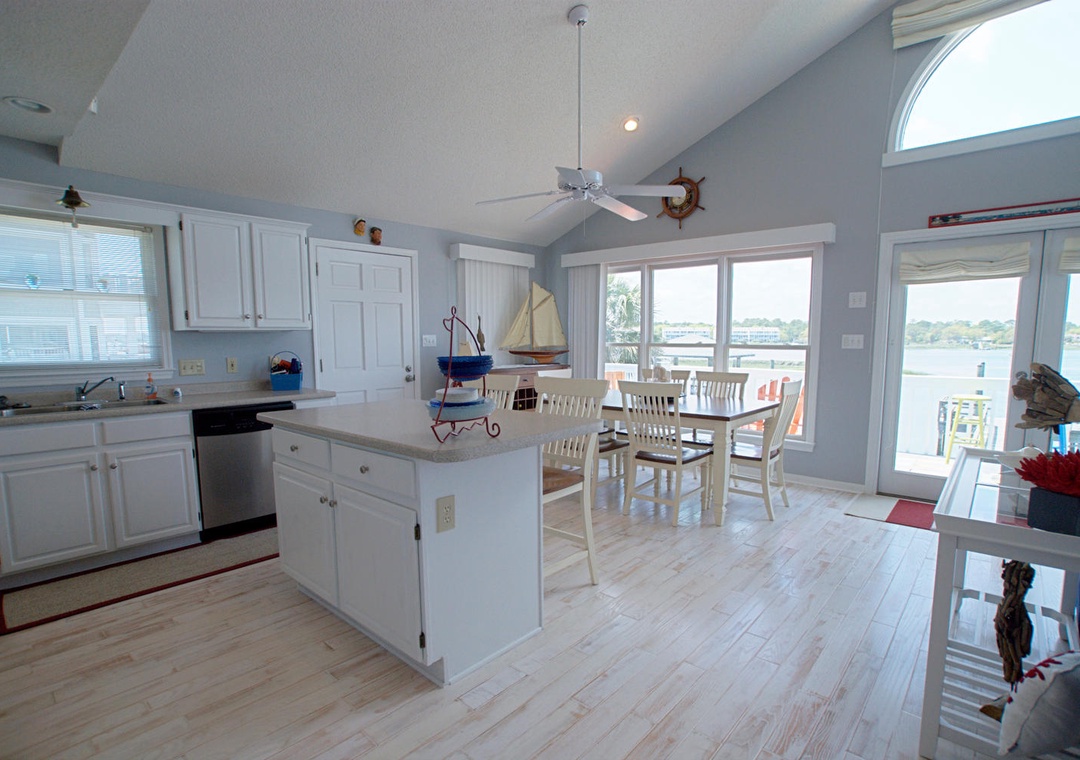 The first floor opens to a spacious living area, complete with seating for eight, a flat-screen TV with cable, and access to a canal-side deck where you can enjoy tranquil waterfront views. The well-equipped kitchen offers everything you need to prepare meals, featuring a dining table for six, additional bar seating for two, and modern appliances, including a refrigerator with an ice maker, flat cooktop stove, microwave, and dishwasher. The home also includes a convenient laundry area with a full-size washer and dryer.