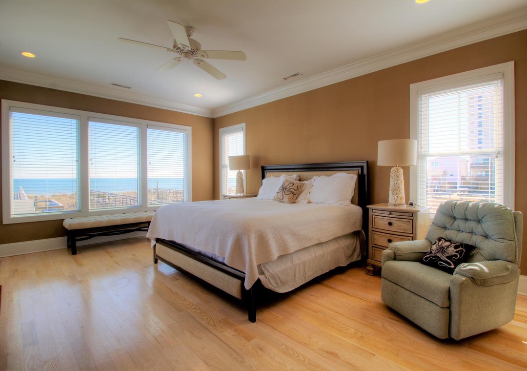 Master Suite, Oceanfront, 2nd Floor En Suite Bathroom with Jacuzzi Tub, Tiled Shower, and Double Vanity Sinks Walk-in Closet with Safe King Bed Recliner Chair Smart Flat Screen 4K TV Oceanfront Deck Access Ceiling Fan Alarm clock Vanity mirror
