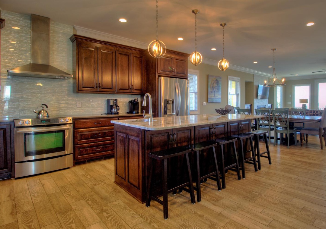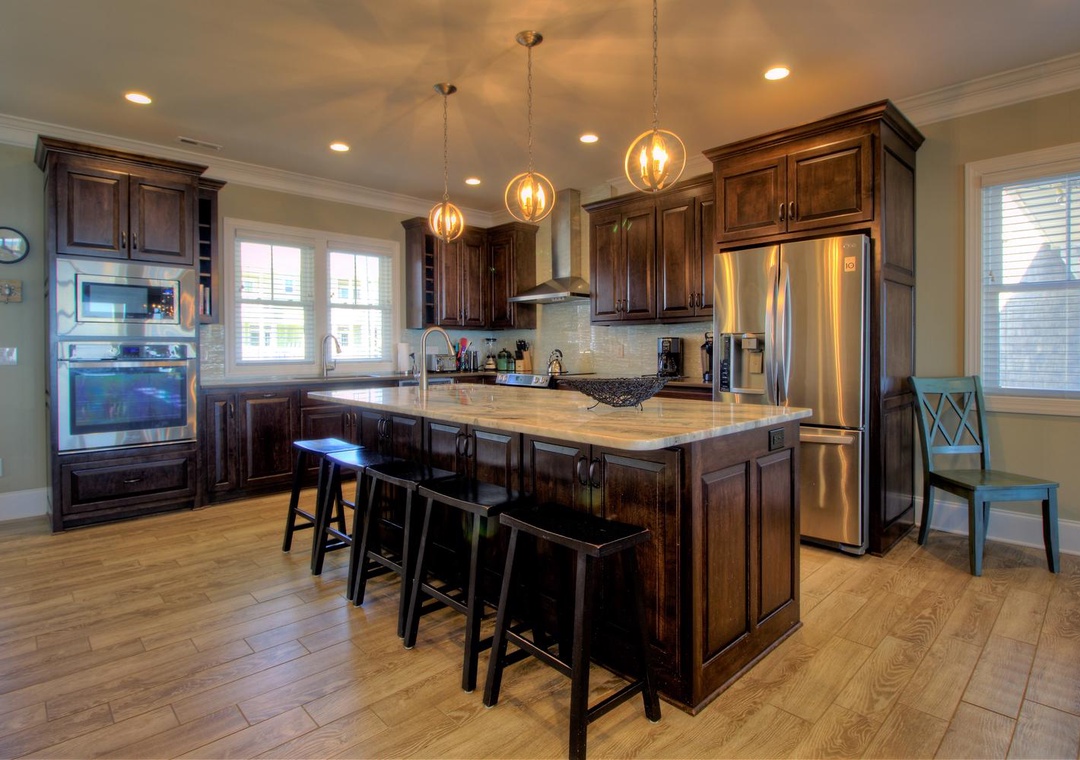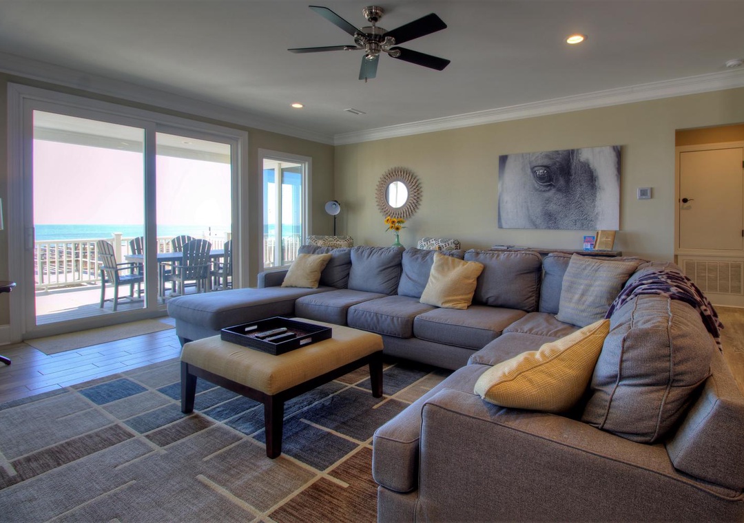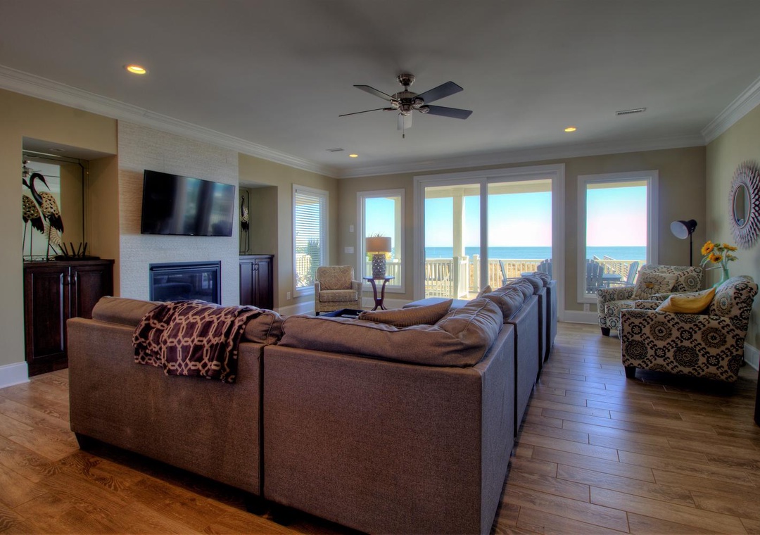 The home’s fully equipped kitchen and dining area on the second floor are perfect for preparing and sharing meals. Features include two sinks with garbage disposals, a refrigerator with an ice maker, dual ovens, two dishwashers, and a range of appliances such as a Keurig, blender, and crock-pot. A large dining table seats 10, with additional seating for five at the kitchen bar. The adjoining living room offers cozy seating for up to 12, a 65” LED 4K Smart TV, and direct access to the second-floor oceanfront deck. A third-floor loft provides additional entertainment options with a couch, sleeper sofa, and another PlayStation 5 setup.