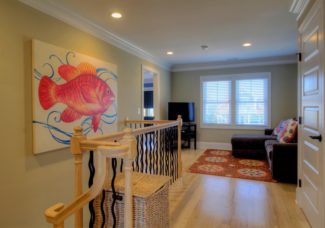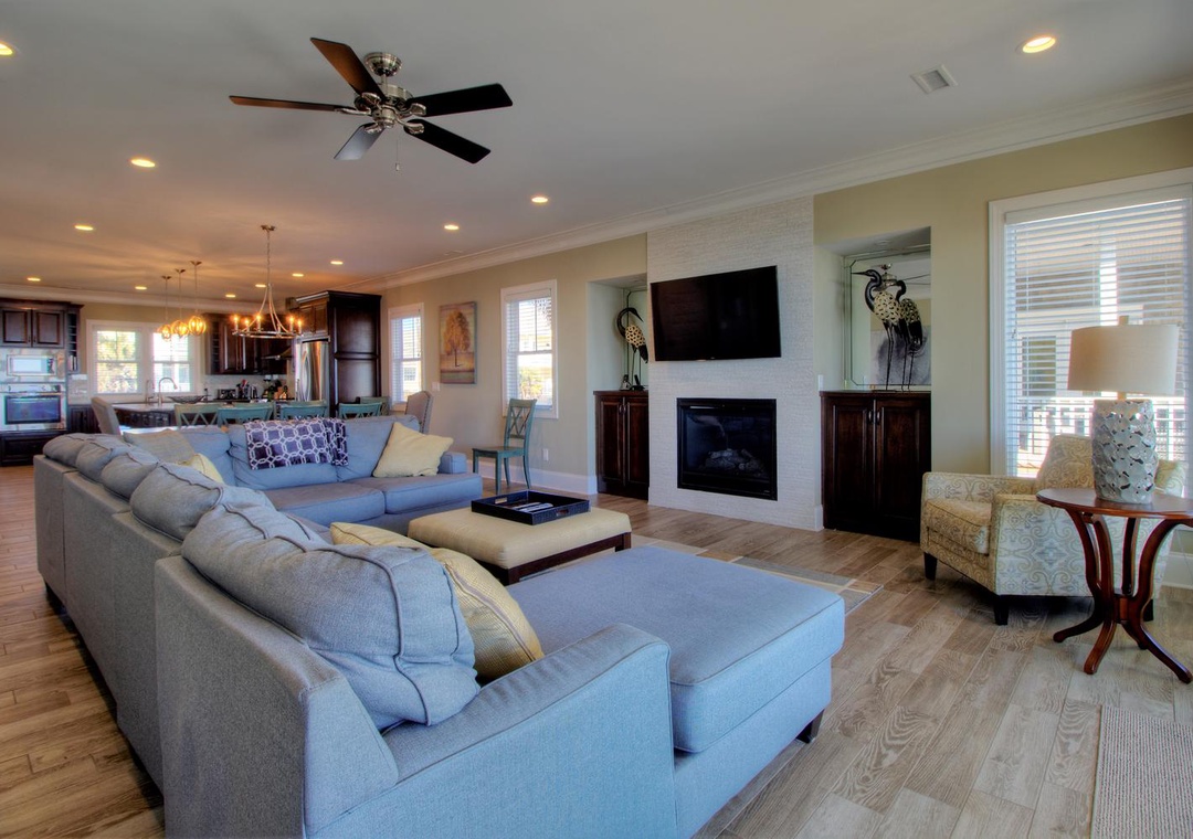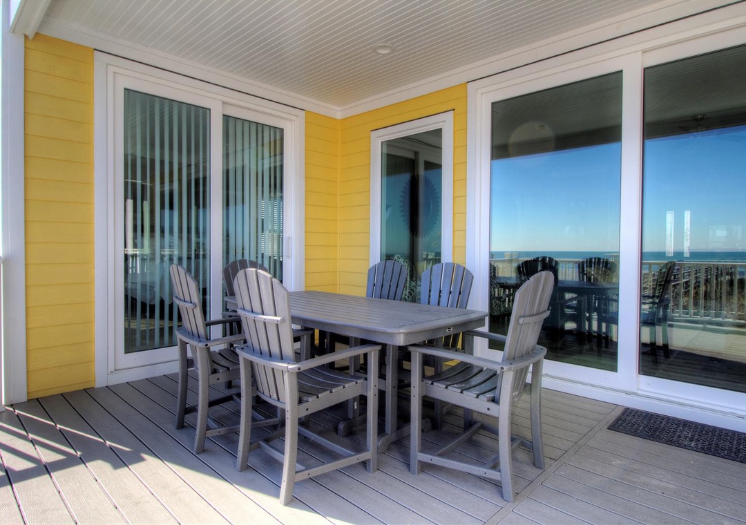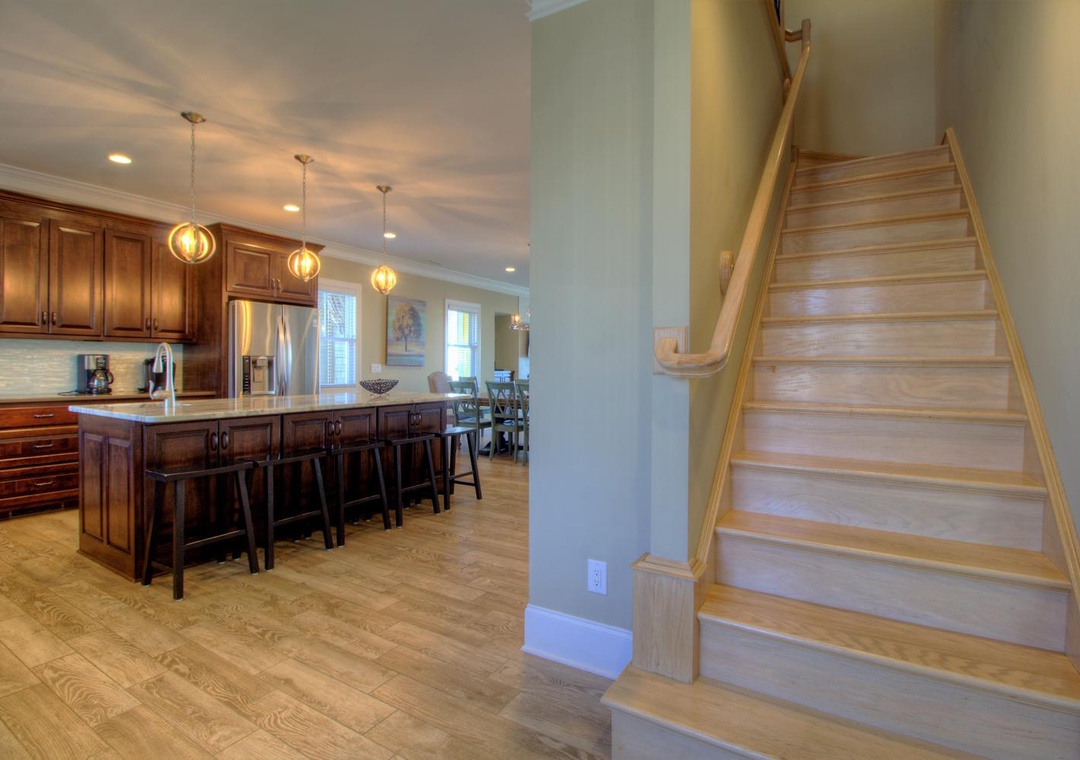 The home’s fully equipped kitchen and dining area on the second floor are perfect for preparing and sharing meals. Features include two sinks with garbage disposals, a refrigerator with an ice maker, dual ovens, two dishwashers, and a range of appliances such as a Keurig, blender, and crock-pot. A large dining table seats 10, with additional seating for five at the kitchen bar. The adjoining living room offers cozy seating for up to 12, a 65” LED 4K Smart TV, and direct access to the second-floor oceanfront deck. A third-floor loft provides additional entertainment options with a couch, sleeper sofa, and another PlayStation 5 setup.