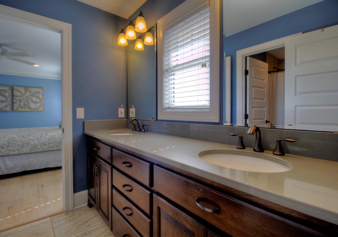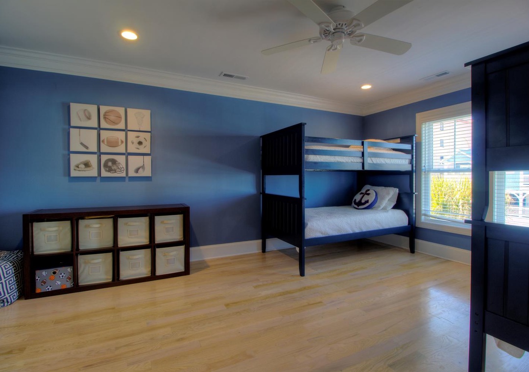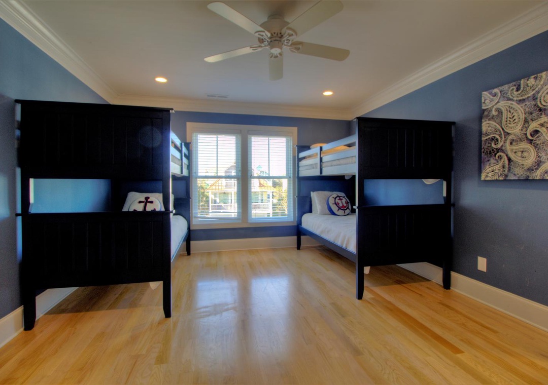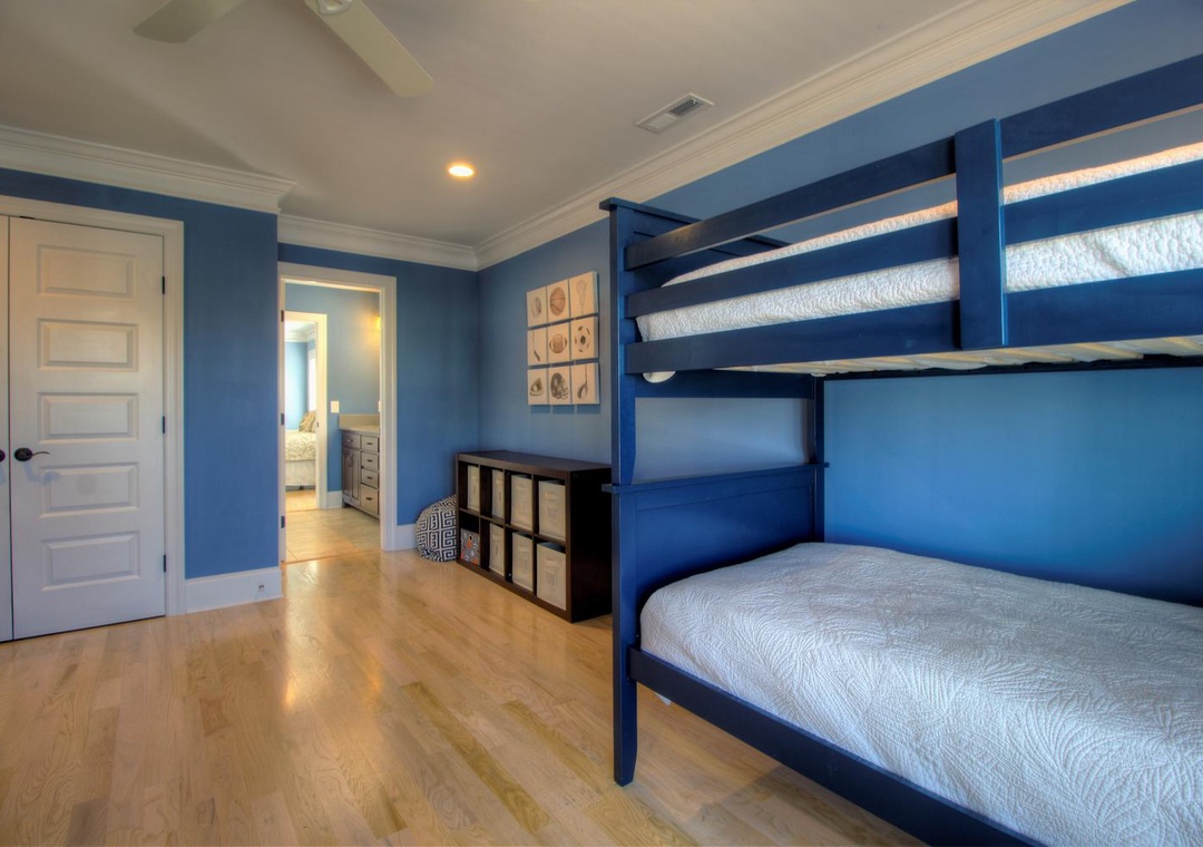 3rd Floor Jack and Jill Bathroom with Bedroom #5 Private Shower/Tub Combo and Commode Double Vanity 2 Bunk Beds (Twin over Twin) Sleeps 4 Ceiling Fan Alarm Clock Bean Bag Chair