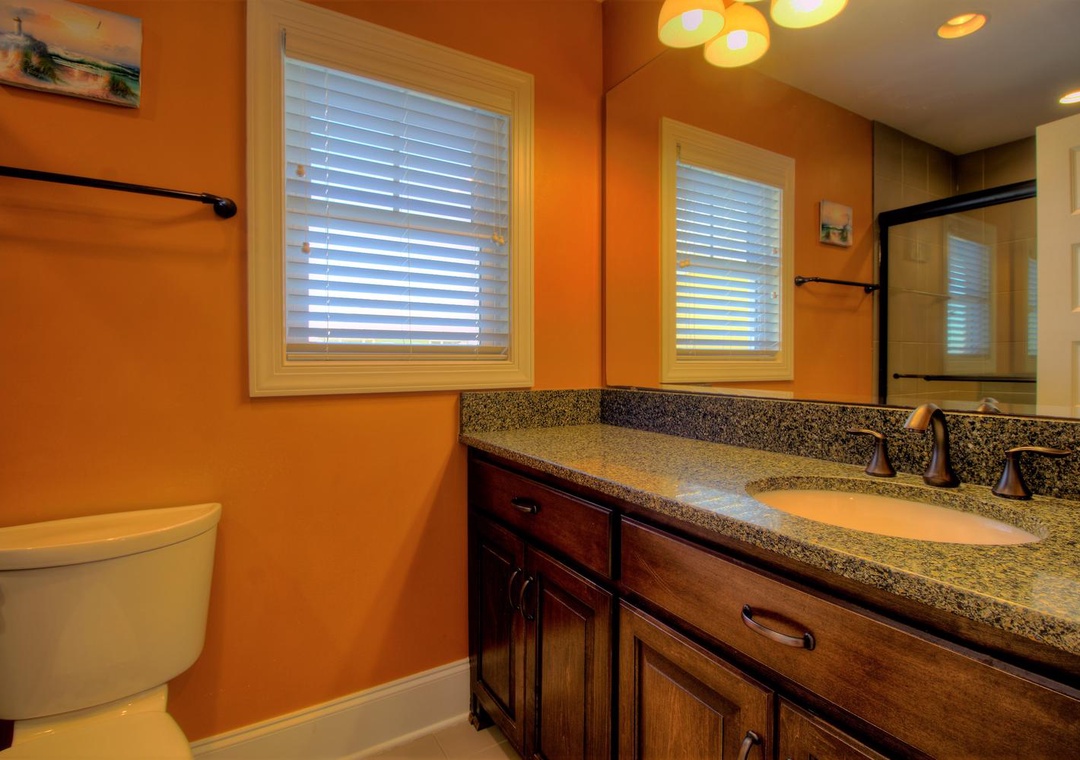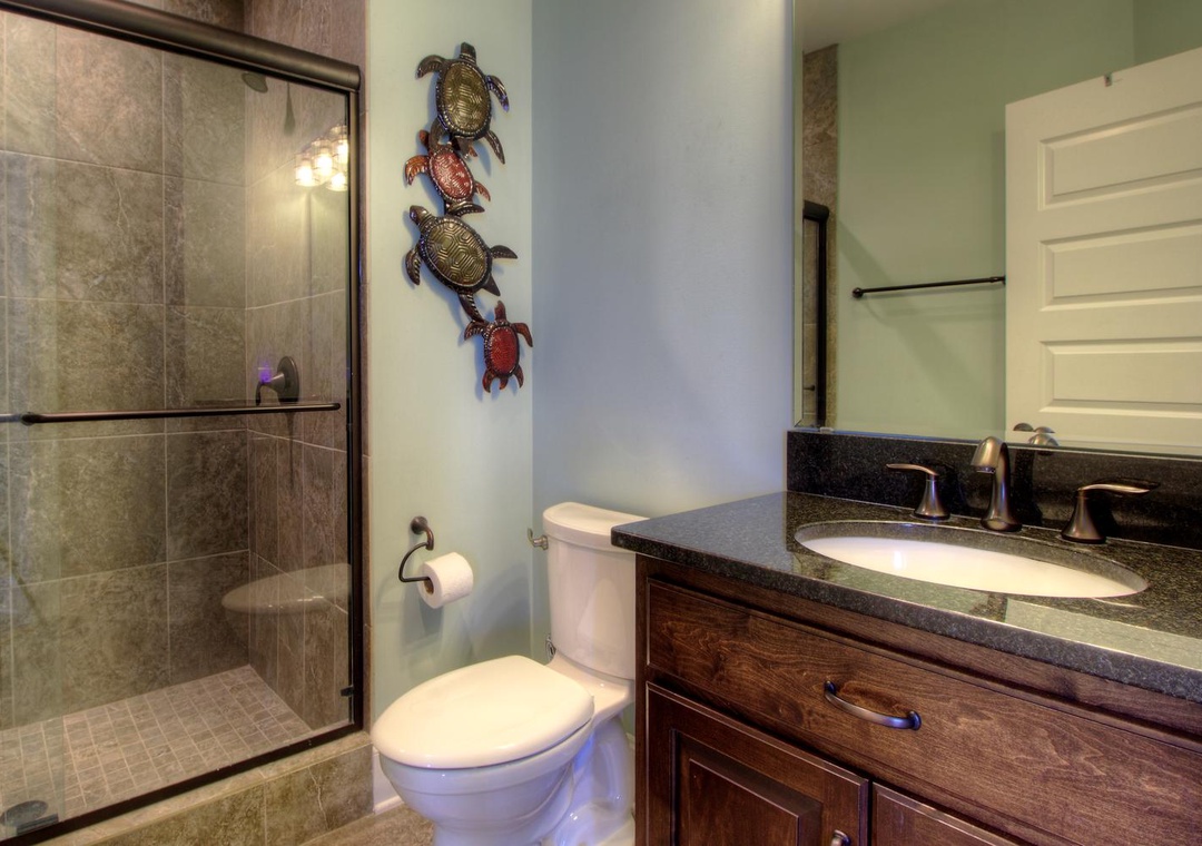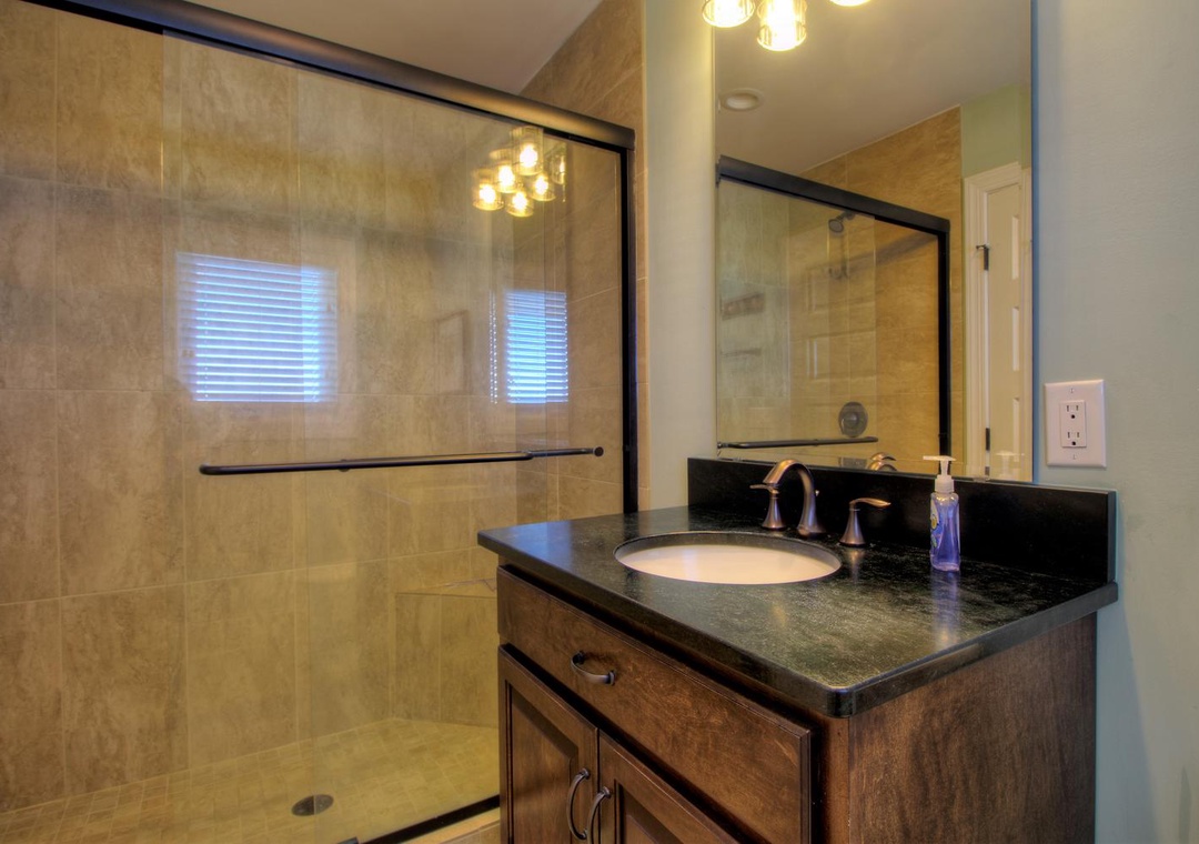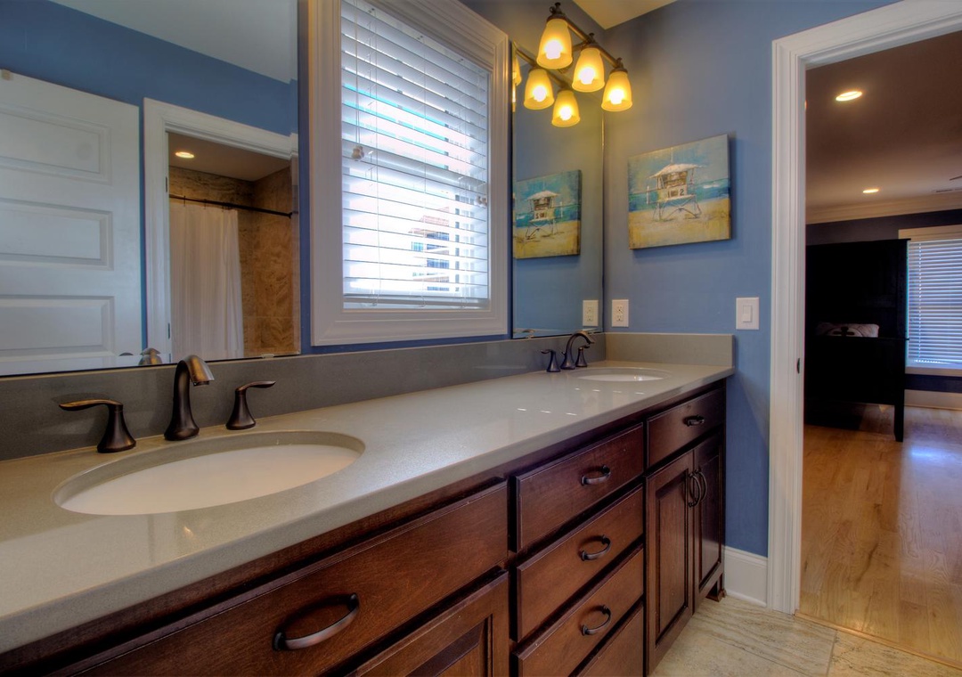 3rd Floor Jack and Jill Bathroom with Bedroom #5 Private Shower/Tub Combo and Commode Double Vanity 2 Bunk Beds (Twin over Twin) Sleeps 4 Ceiling Fan Alarm Clock Bean Bag Chair