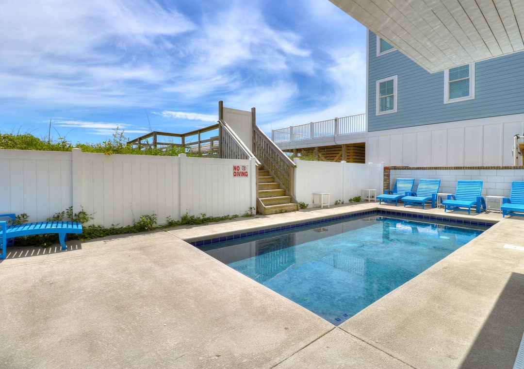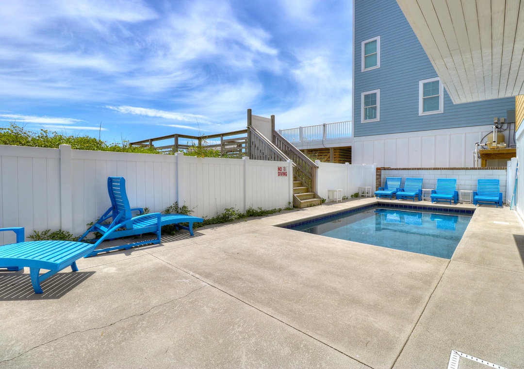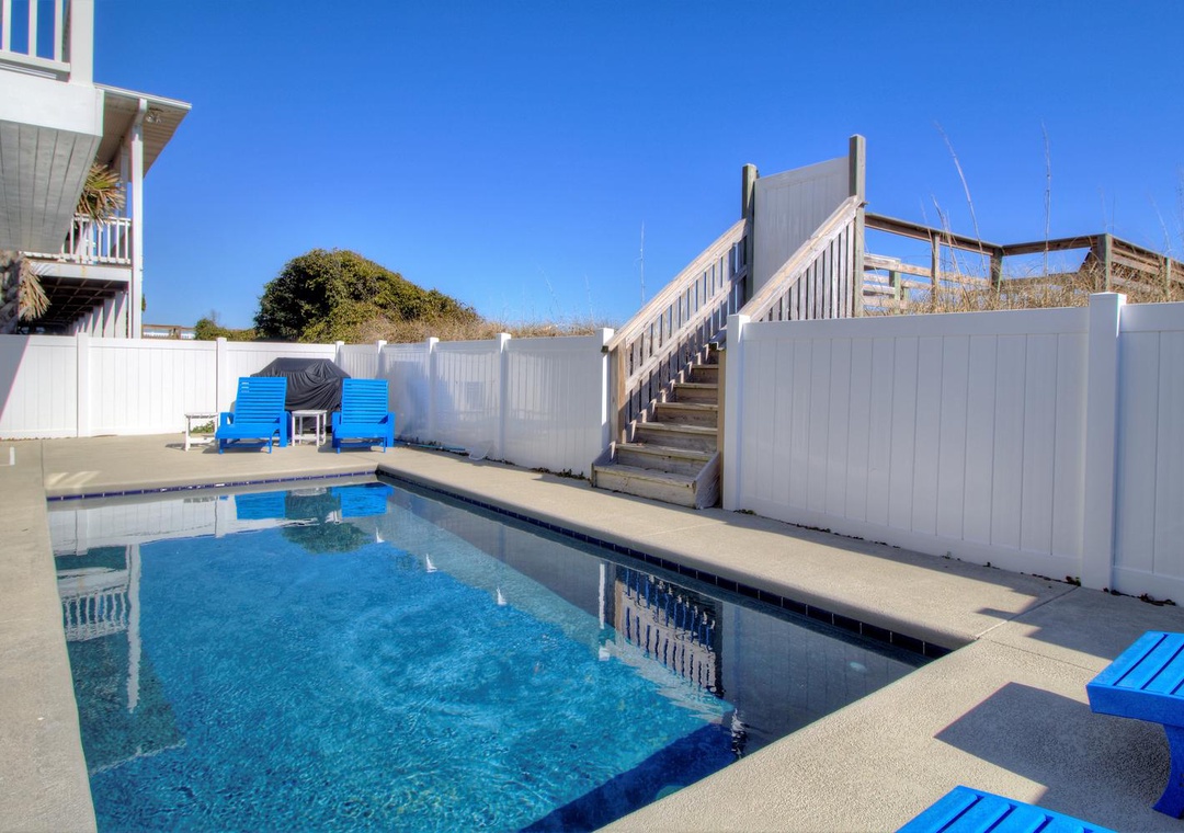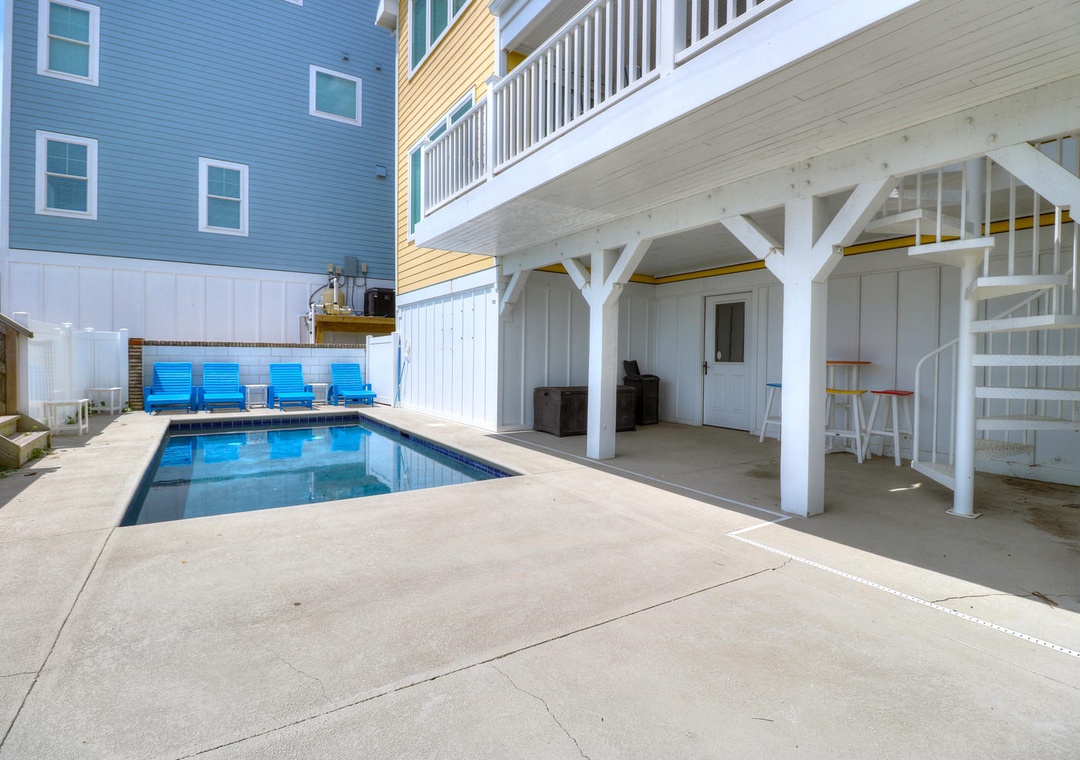 Each bedroom is thoughtfully designed for comfort and privacy, with Smart 4K TVs, ceiling fans, and alarm clocks in every room. The home includes four master suites, three of which feature oceanfront views and en suite bathrooms. Additional bedrooms include configurations for twin beds, queen beds, and bunk beds, making it suitable for families and groups of all sizes. The ground floor patio features a private pool, gas grill, and an outdoor shower, completing the home’s offerings for a perfect beachside vacation.