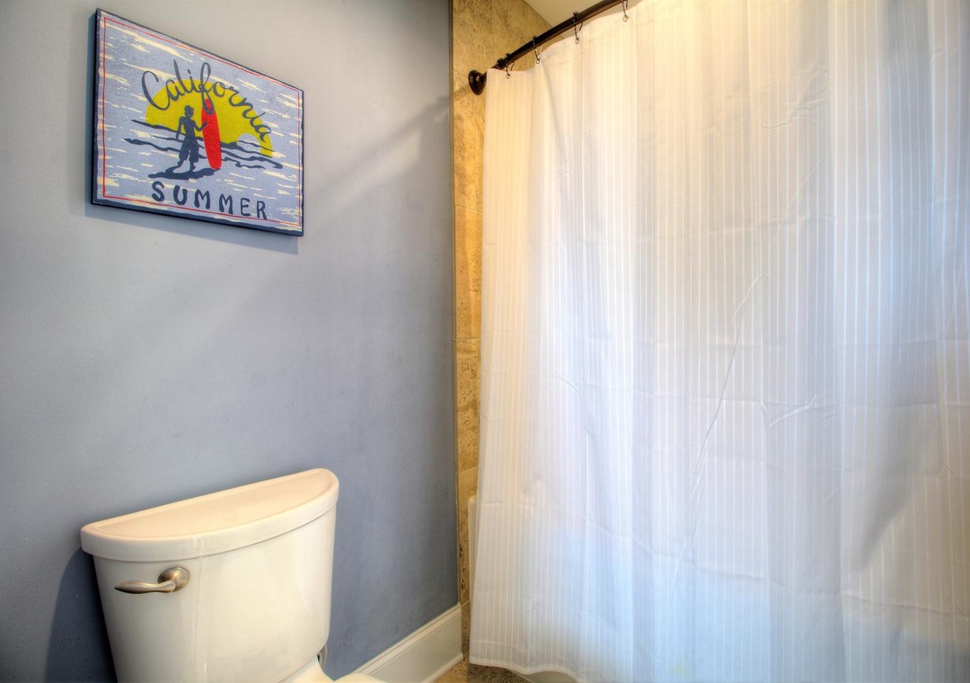3rd Floor Jack and Jill Bathroom with Bedroom #6 Private Shower/Tub Combo and Commode Queen Bed Smart Flat Screen 4K TV Ceiling Fan Alarm Clock