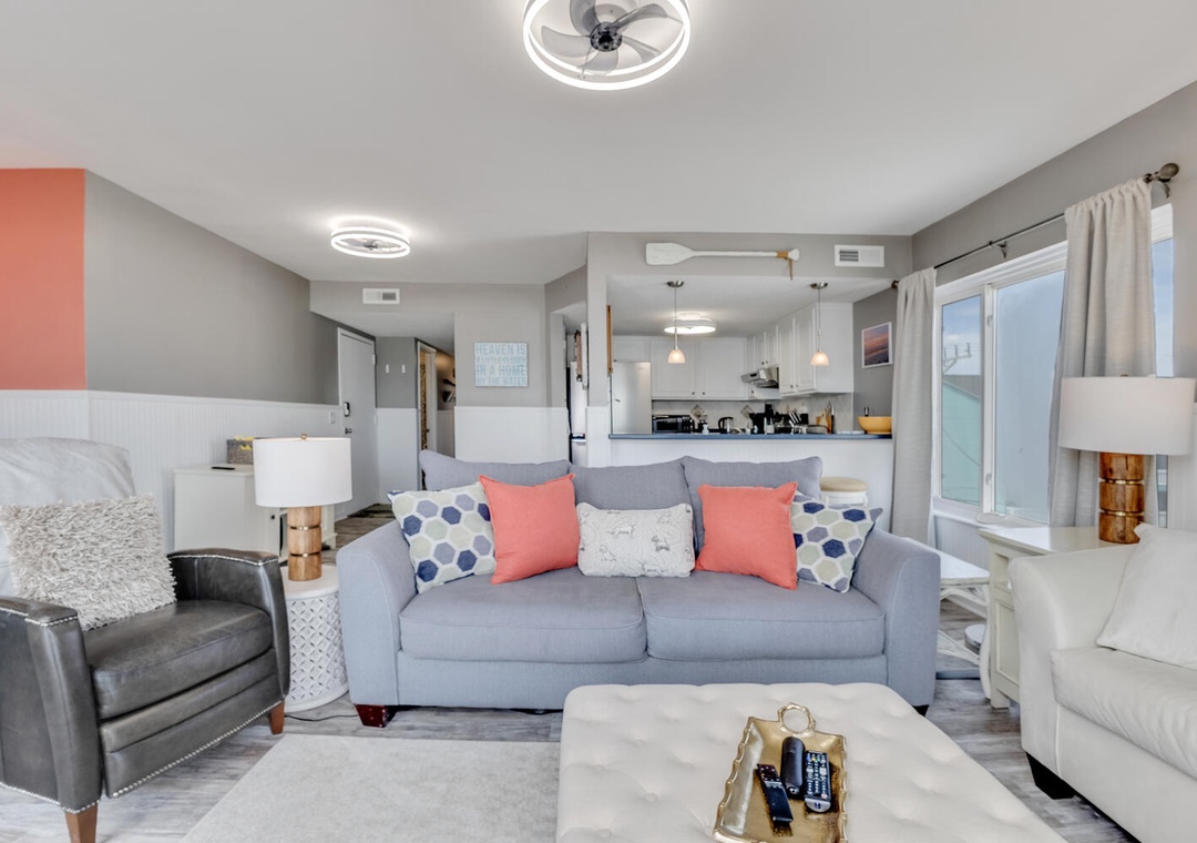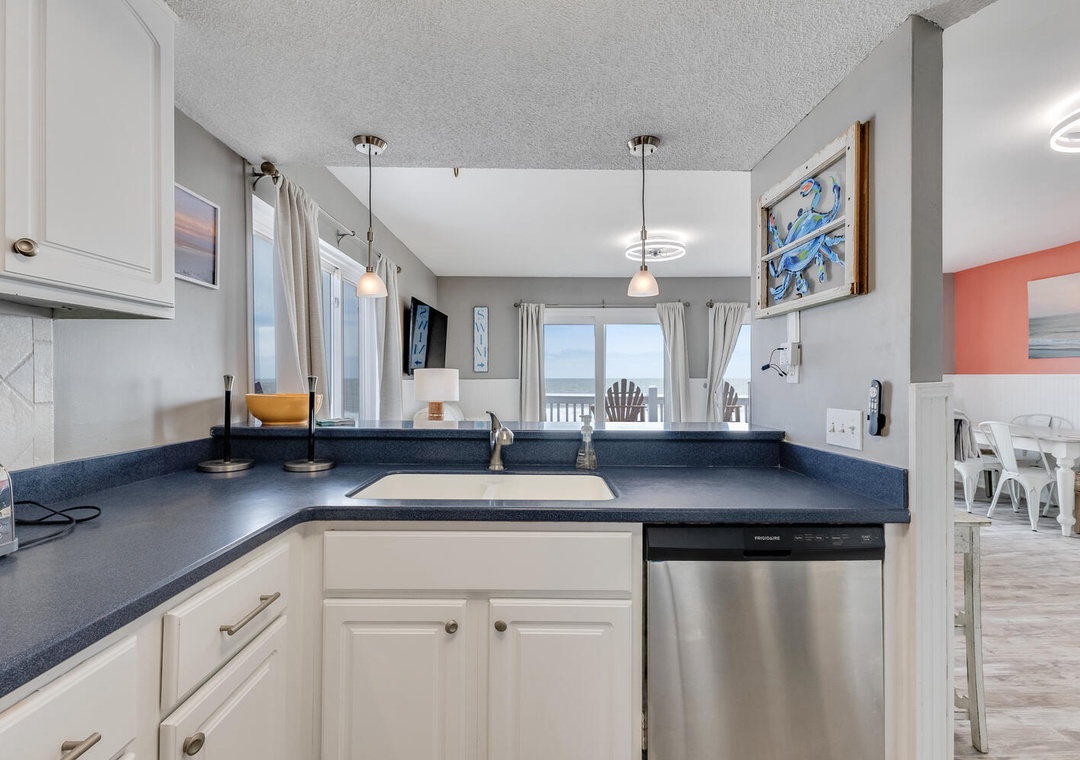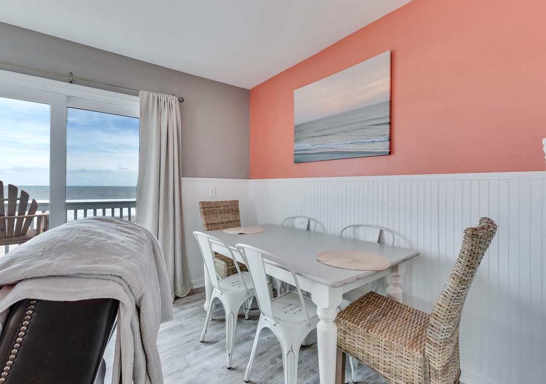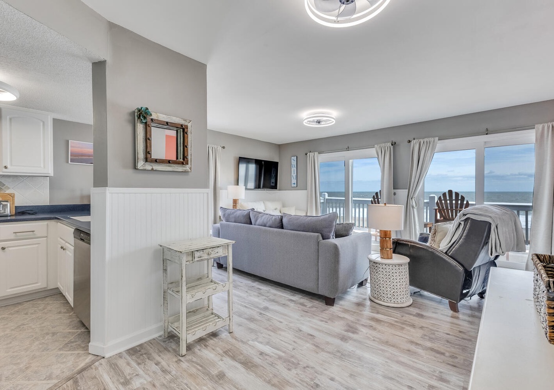 Step inside to a bright, inviting living space filled with natural light and comfortable coastal décor. Large sliding doors open directly to the oceanfront deck. The fully equipped kitchen provides everything you need for easy meals, snacks after the beach.