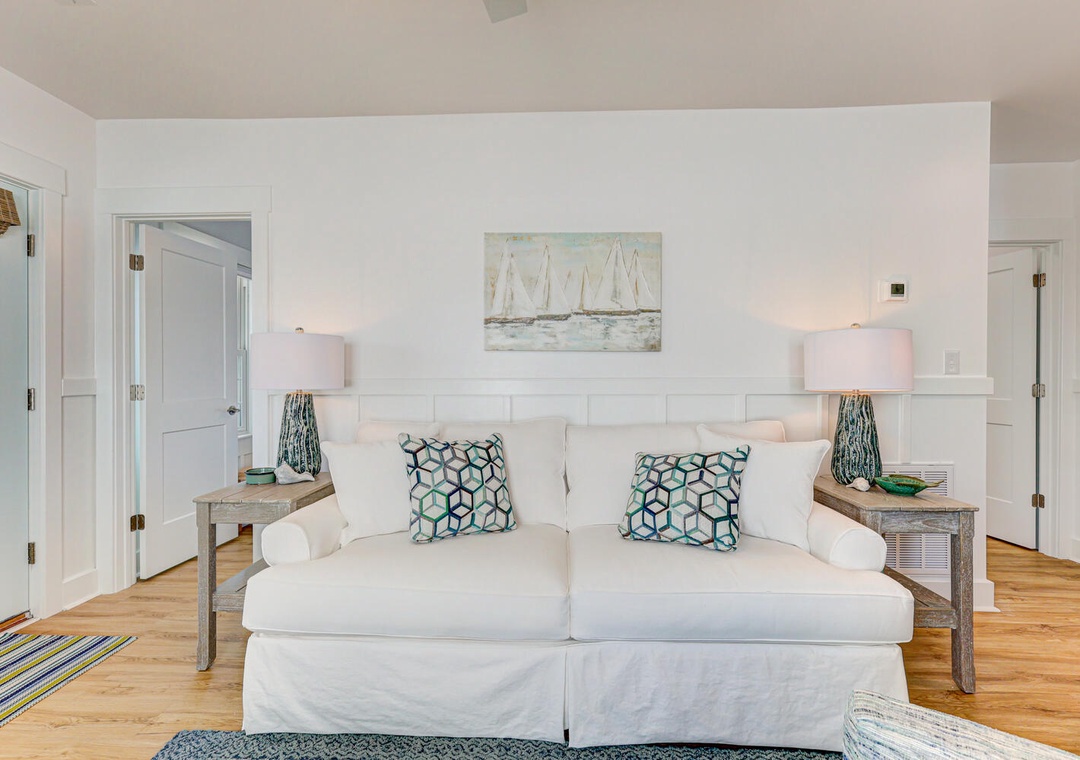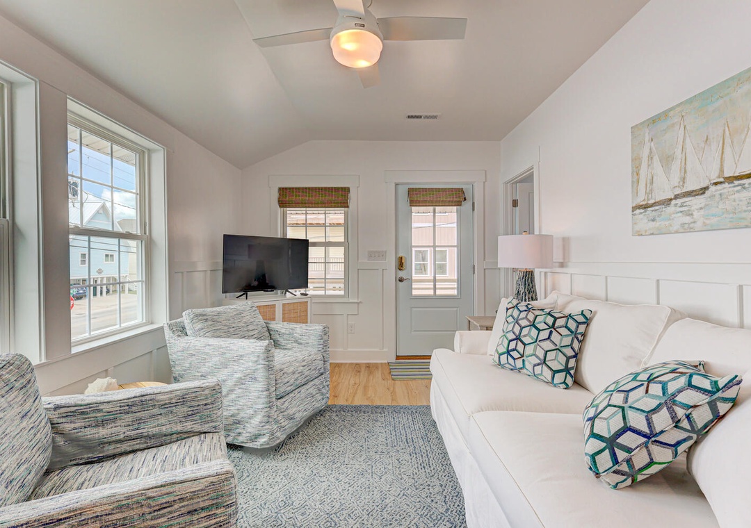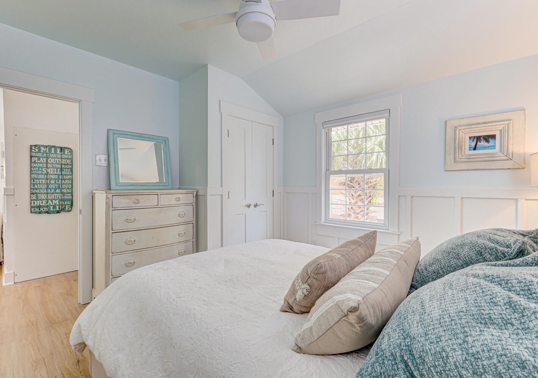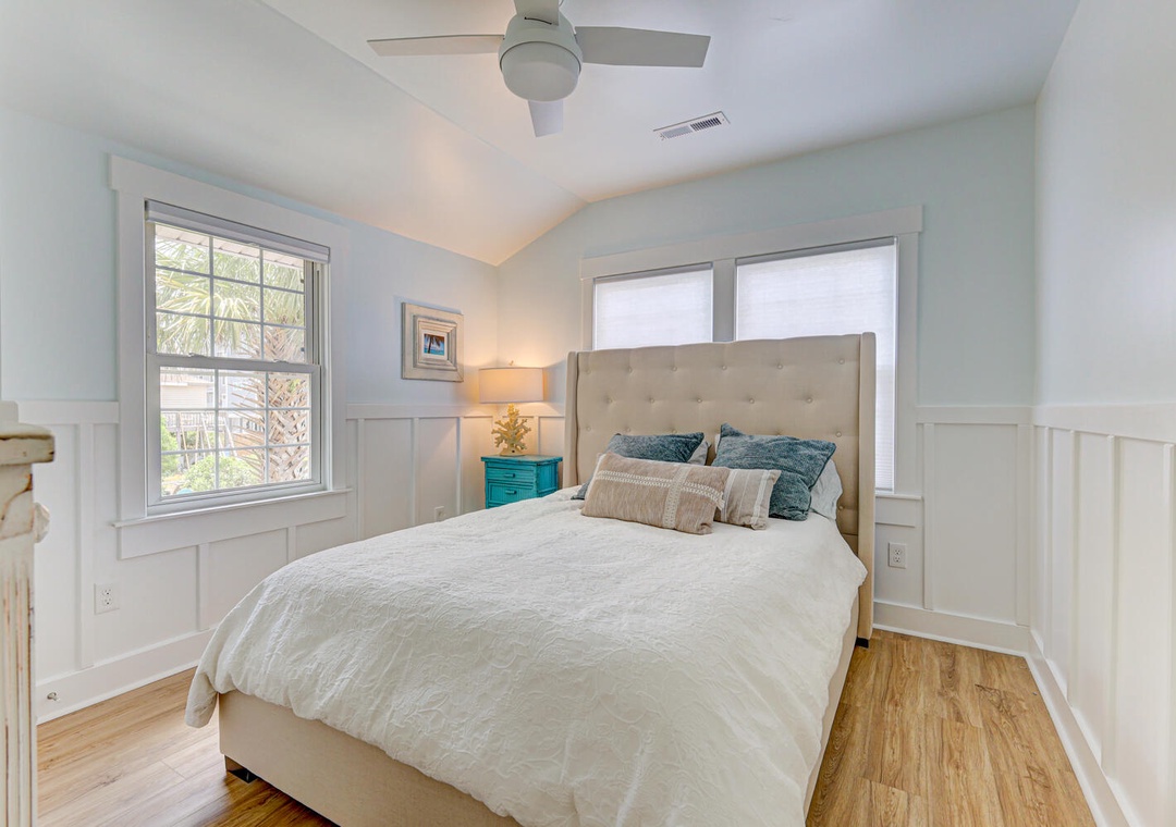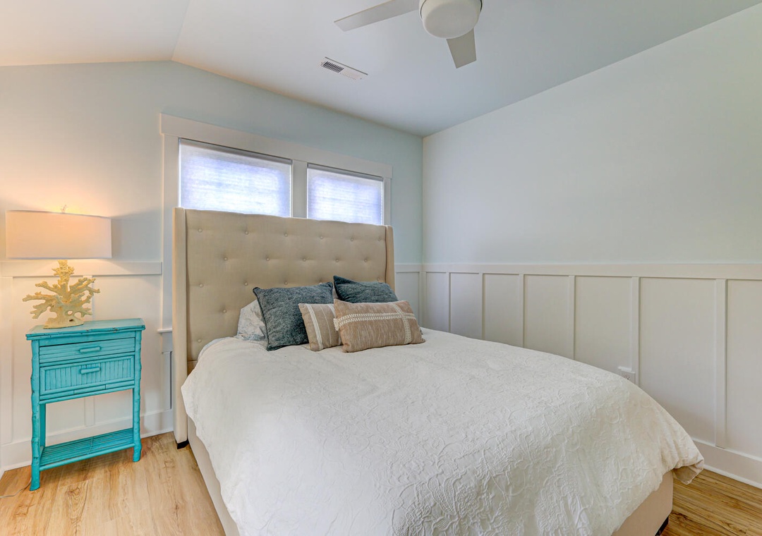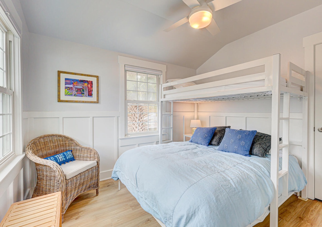 The Guest House features two inviting bedrooms, both located on the second floor. The first bedroom is ideal for families, with a bunk bed set (twin over queen), while the second bedroom offers a comfortable queen bed and ceiling fan. A shared bathroom with a tub/shower combo and single vanity ensures a refreshing start to each day. With its blend of modern amenities and unbeatable location, The Guest House on Scotch Bonnet is your perfect home away from home for a memorable beach escape.