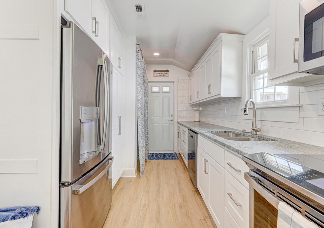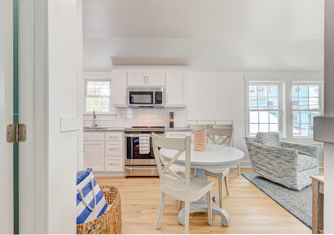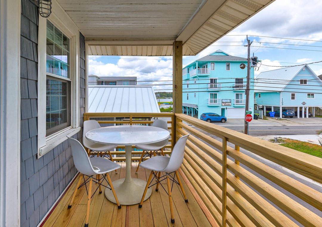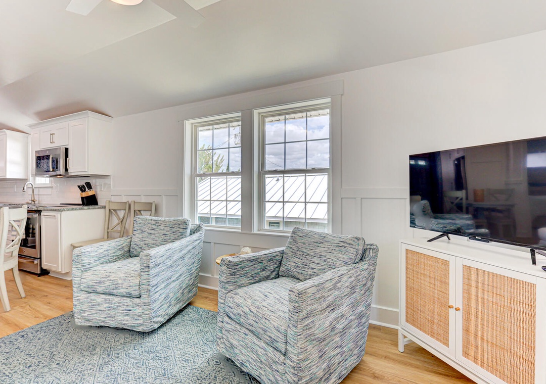 The heart of the home is the cozy living room on the second floor, offering seating for five with a couch and chairs, a smart TV for entertainment, and a ceiling fan for added comfort. Step out onto the spacious porch, where seating for eight invites you to soak up the fresh sea breeze. The adjacent kitchen and dining area are fully equipped with modern appliances, including a Keurig coffee maker, air fryer, crockpot, and dishwasher, making meal prep a breeze. A dining table for four and a convenient washer/dryer tucked in a closet complete this functional space.