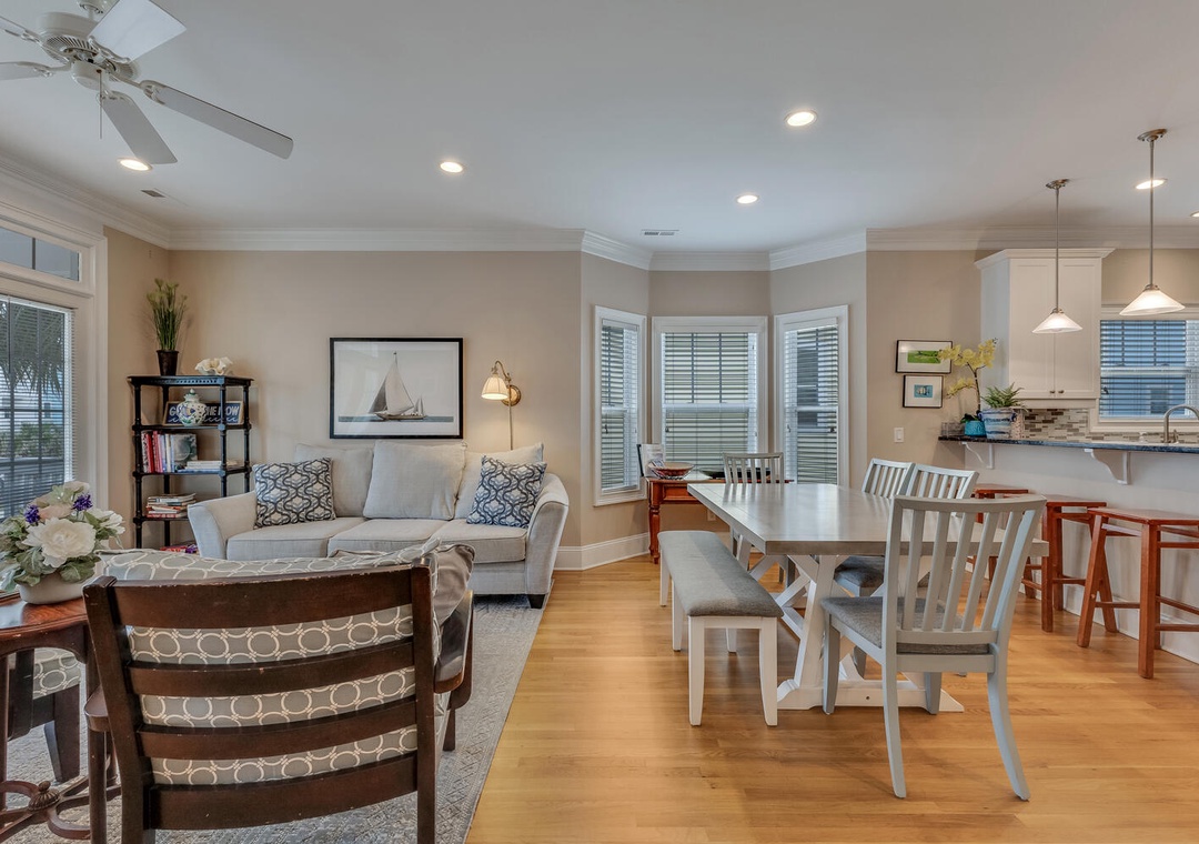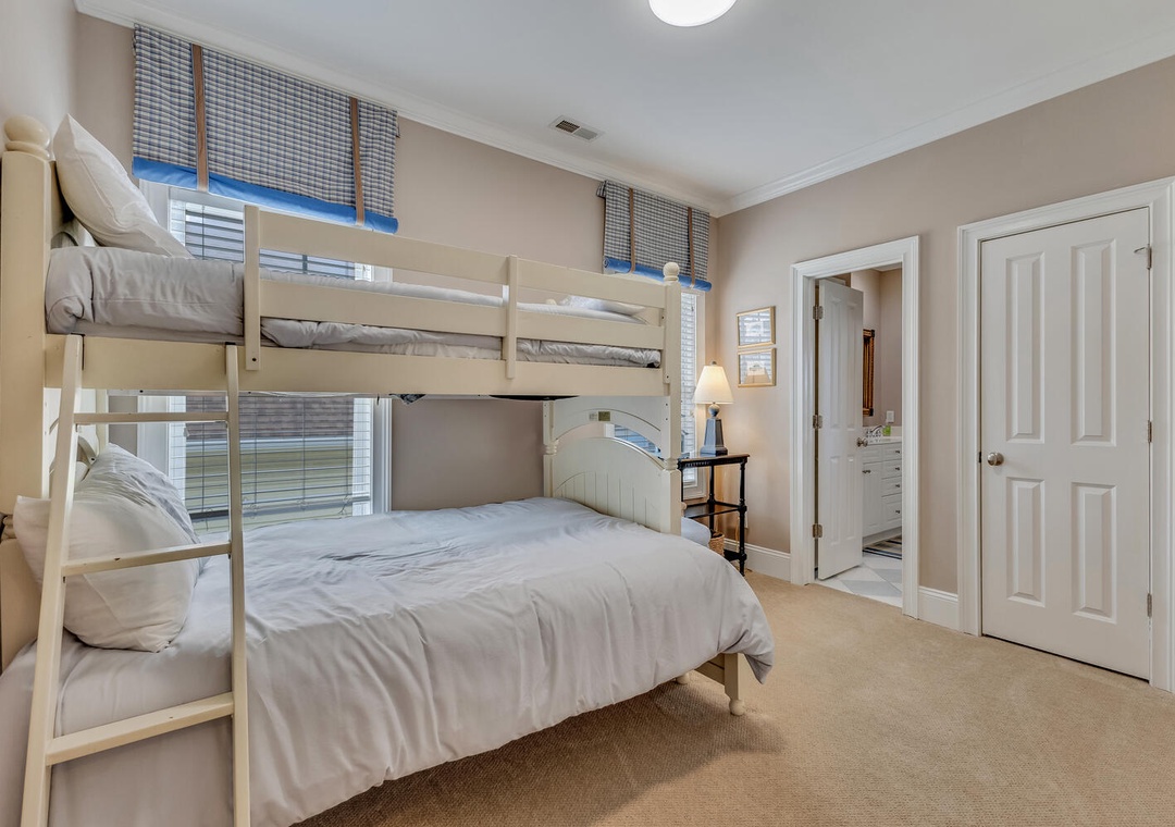 With six bedrooms and four full bathrooms, there's plenty of space for everyone. The open-concept main floor features a bright and airy layout where the kitchen, dining area, and living room flow together seamlessly—perfect for gathering, sharing meals, and making memories. Just behind the kitchen is Bedroom 4, a cozy space that little ones often claim as their own hangout.