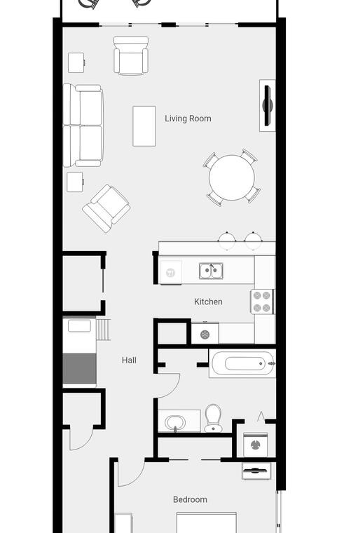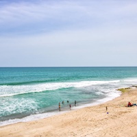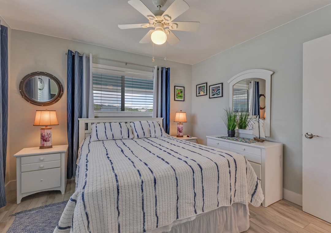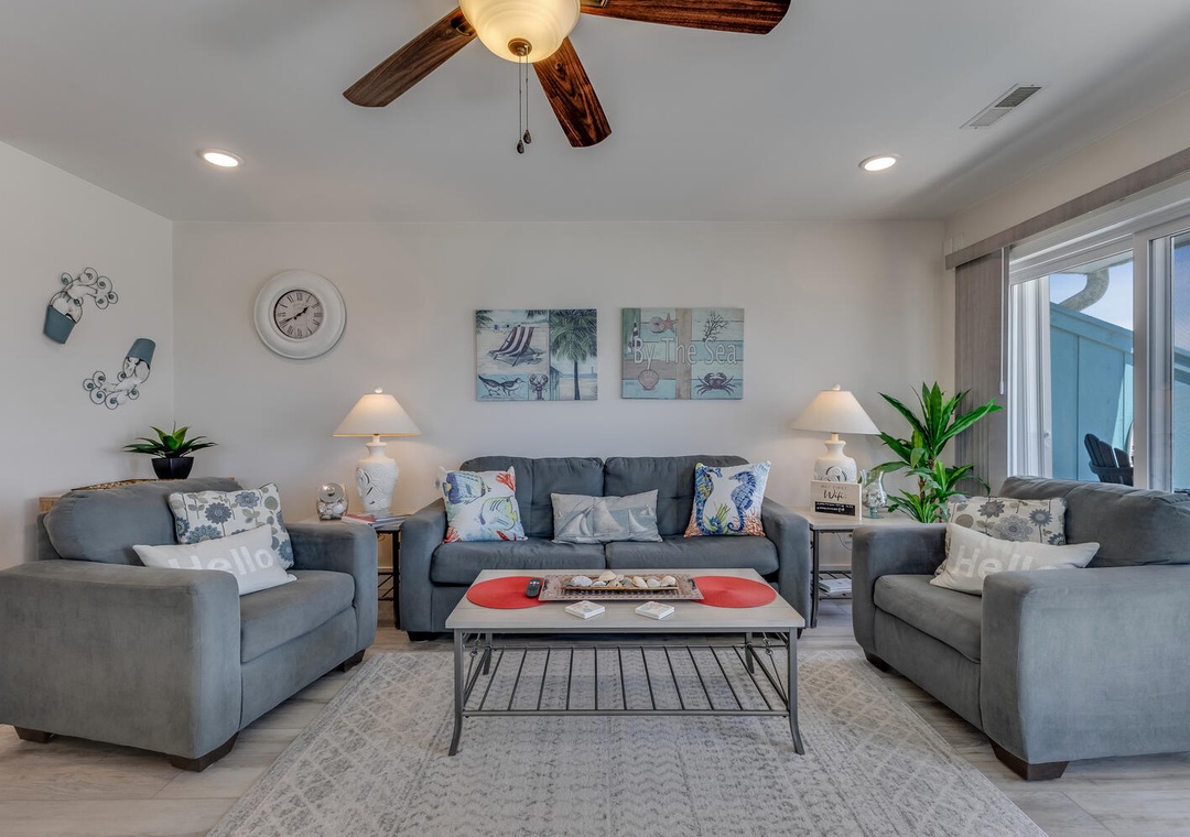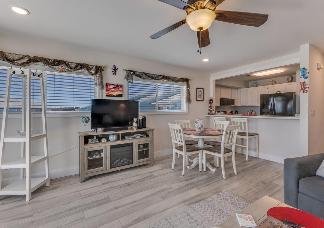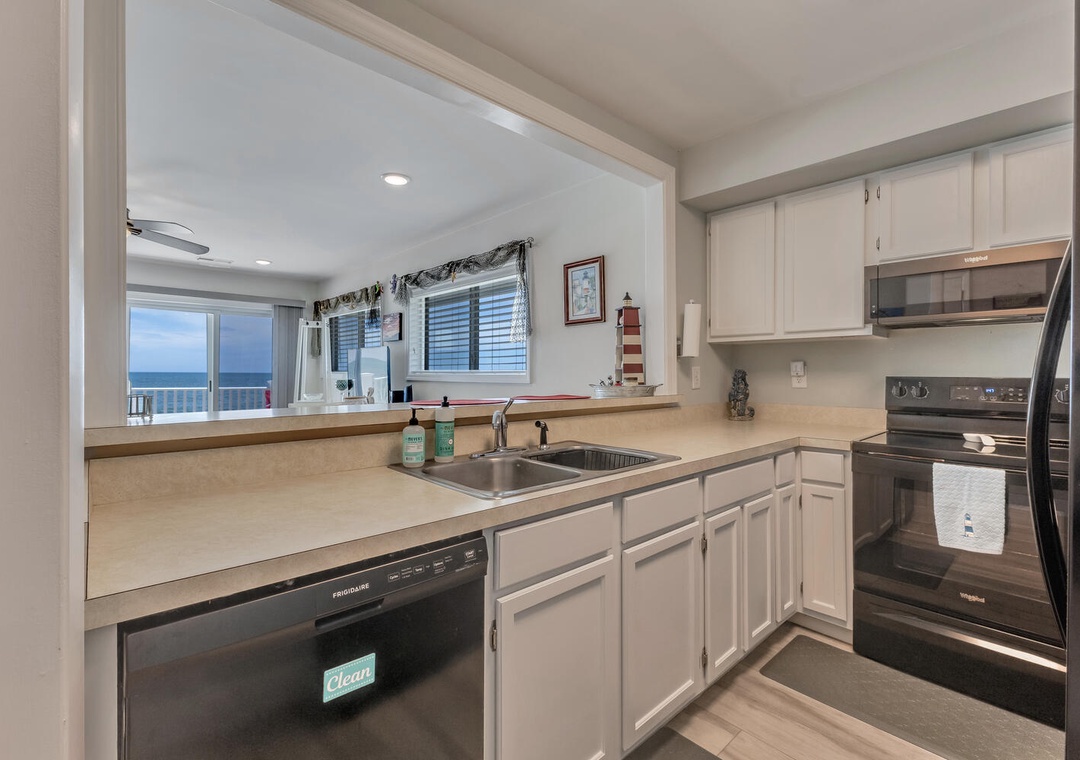 The main living area is open and airy, with a sleeper sofa to accommodate guests. With large windows that let in natural light and provide unobstructed views of the ocean. A sliding glass door leads to a private balcony, ideal for taking in the coastal scenery. The kitchen is fully equipped with modern appliances and ample cabinet space. A combined dining and living area offer comfortable seating and a casual space to relax.