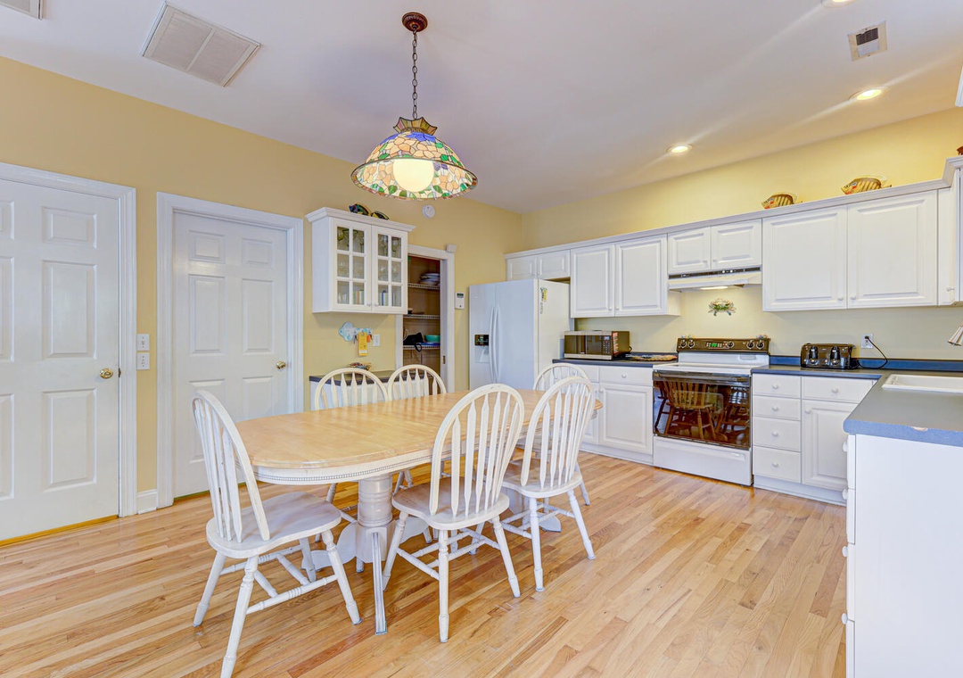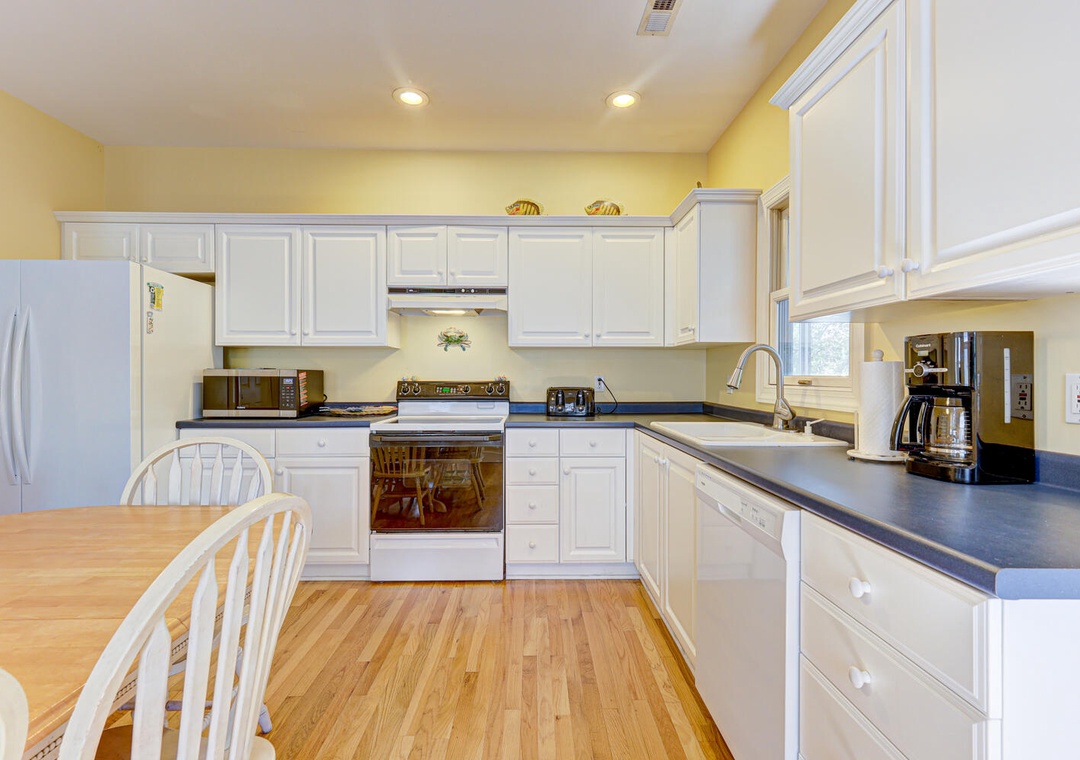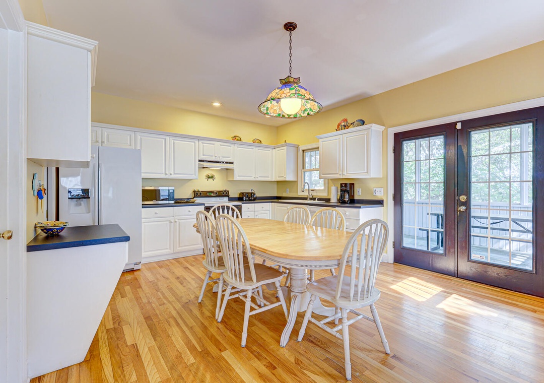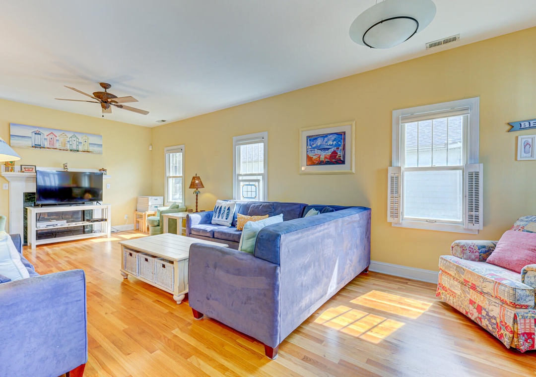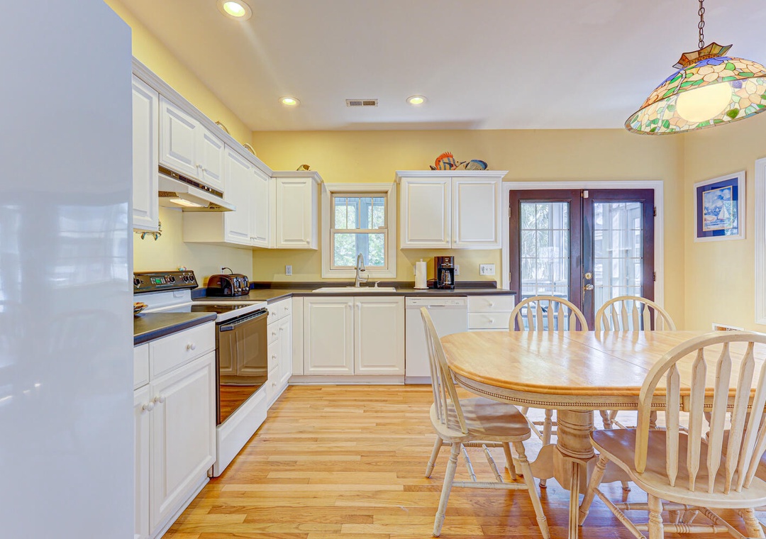 The well-equipped kitchen on the second floor features modern appliances, including a refrigerator, microwave, dishwasher, flat-top stove, drip coffee maker, and Nespresso machine. The adjacent dining area, with seating for six, provides a cozy space for meals, and a screened-in porch off the kitchen offers a peaceful spot to enjoy morning coffee or evening conversation. The master suite, also on the second floor, includes a queen bed, a smart TV with cable, a rocking chair, and an attached bathroom with a spacious walk-in shower. Additional bedrooms are spread across three floors, offering a variety of sleeping arrangements, including twin and queen beds, a trundle, and multiple smart TVs and ceiling fans for added comfort.