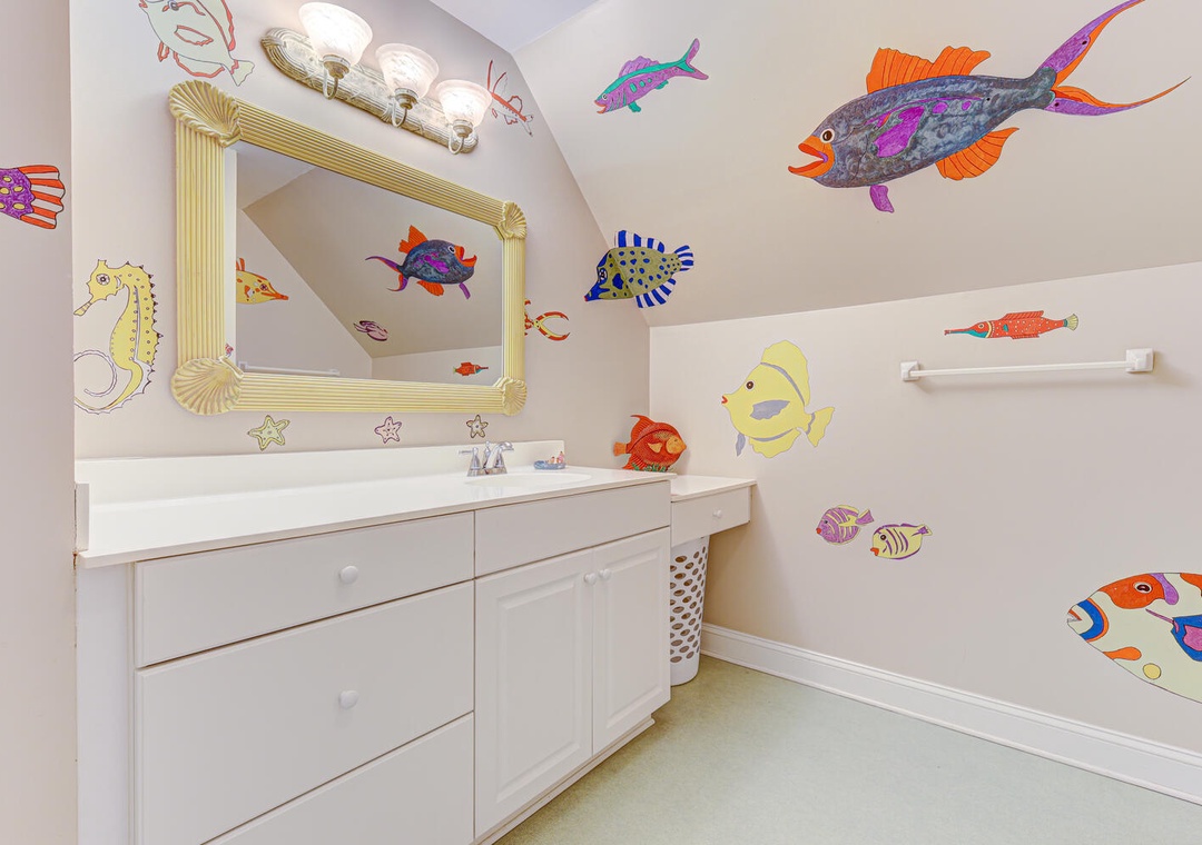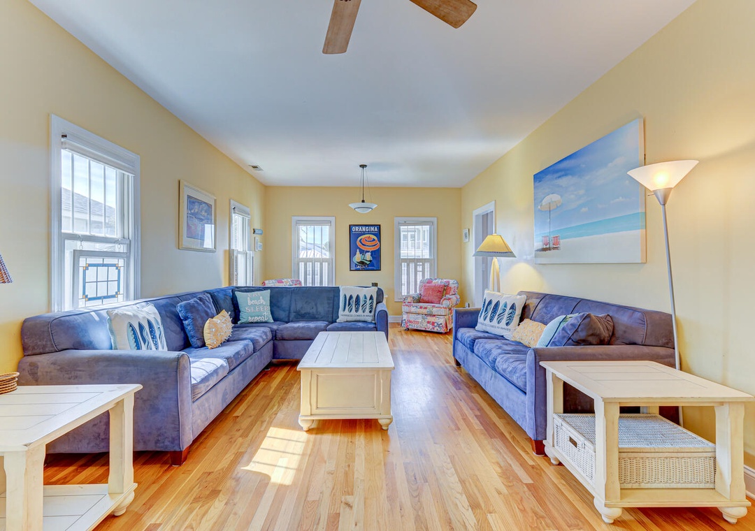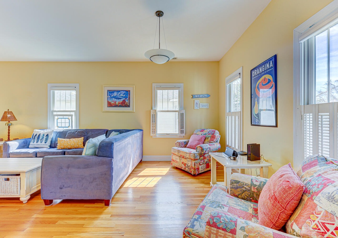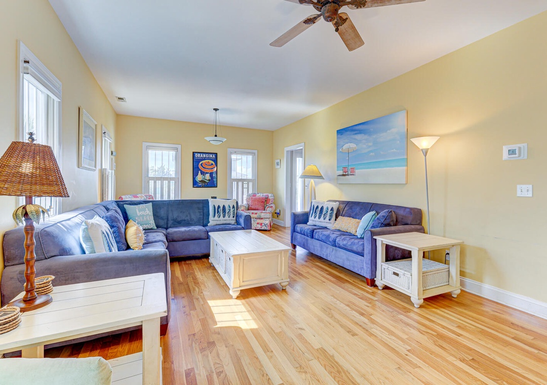 With four bathrooms throughout the home, including a convenient half bath on the second floor and a private bath attached to the first-floor bedroom, guests will have ample space and privacy. The first-floor bedroom, featuring three twin beds, a smart TV, a ceiling fan, and an HVAC wall unit, is ideal for younger guests or those wanting a separate space. A fully equipped laundry room on the second floor ensures a stress-free stay, while the beautifully furnished screened porch, complete with a porch swing, picnic table, and ample seating, invites guests to unwind and make lasting memories in this charming vacation retreat.