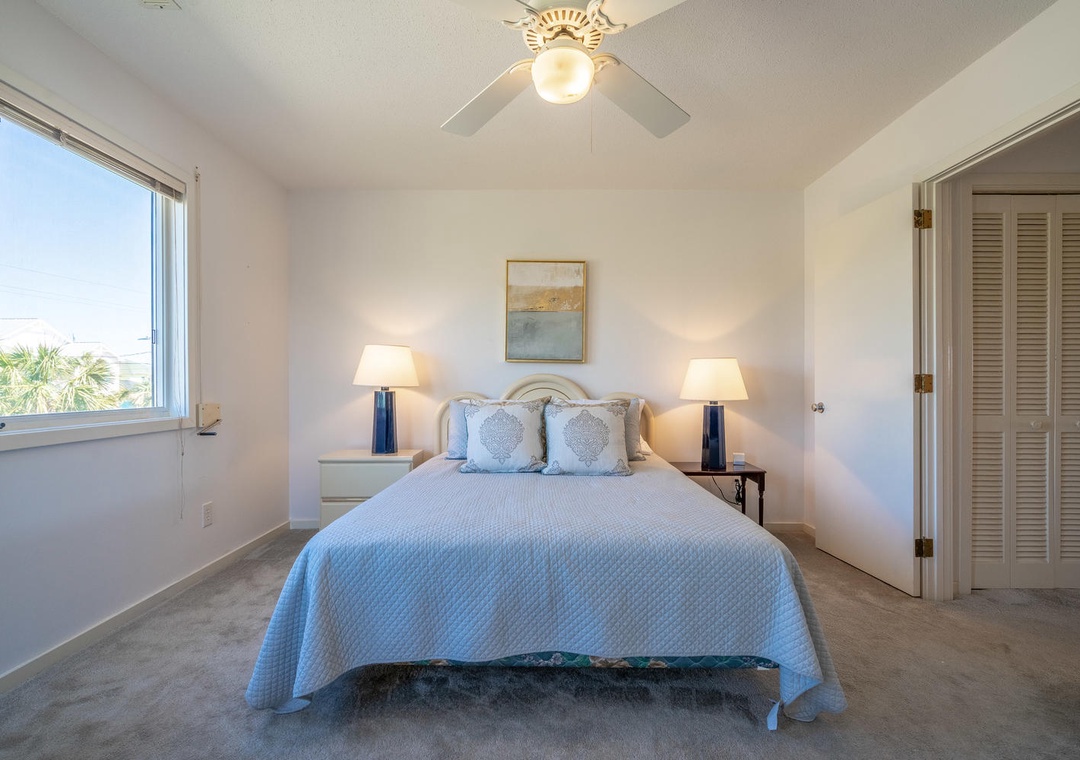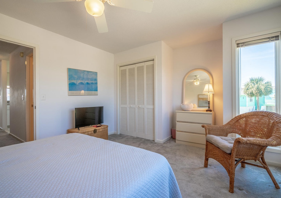 Upstairs, the sleeping arrangements provide comfortable accommodations across three bedrooms. Bedroom #1, located on the third floor, is a canal-front room with a king bed, private bathroom, and direct access to Deck #2. This room also includes a flat-screen TV and ceiling fan for added comfort. Bedroom #2, also on the third floor, features a king bed, private bathroom, and a street view. Bedroom #3, located on the second floor with a shared bathroom, includes a queen bed and flat-screen TV. Each bedroom has its own ceiling fan, ensuring a restful stay for everyone in this well-appointed vacation home.