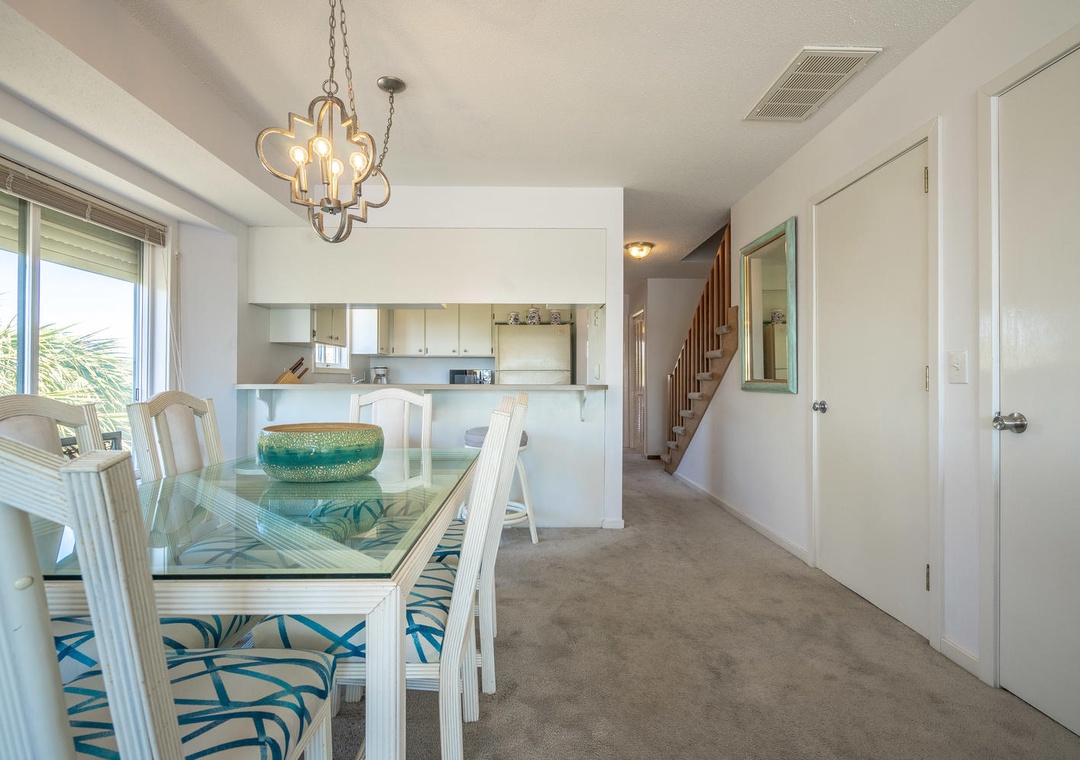 Inside, the second-floor layout includes a kitchen and dining area with seating for up to ten guests—six at the dining table and four at the breakfast bar. The kitchen is fully stocked with essential appliances, from a refrigerator with an ice-maker to a drip coffee maker, blender, dishwasher, and even a crock-pot and teapot. The living room on this floor offers seating for seven and access to Deck #1, which features a table and chairs with seating for four, providing a comfortable space for family time or watching TV. Additionally, this floor includes a laundry area with a top-loading washer and dryer for added convenience.