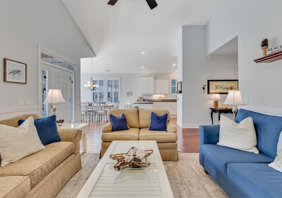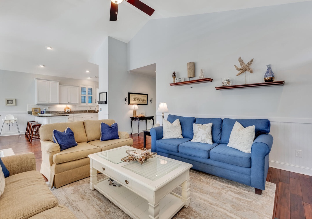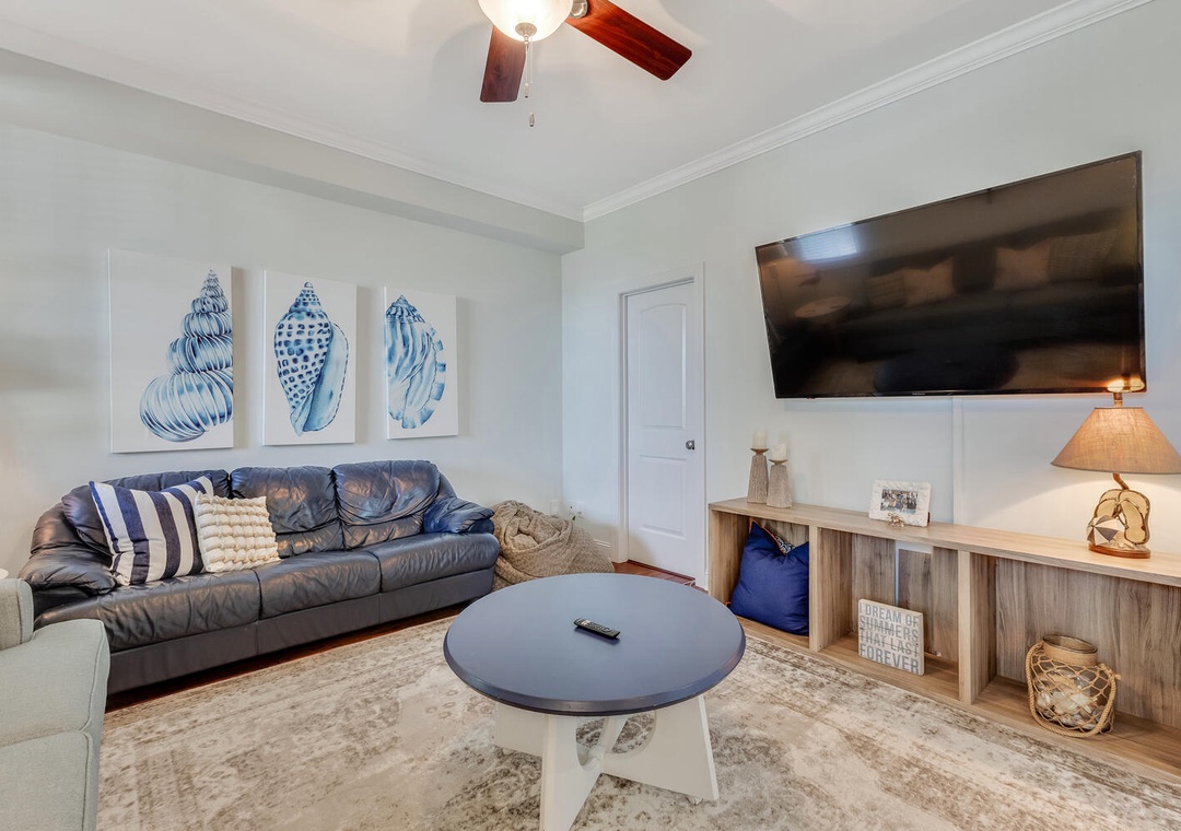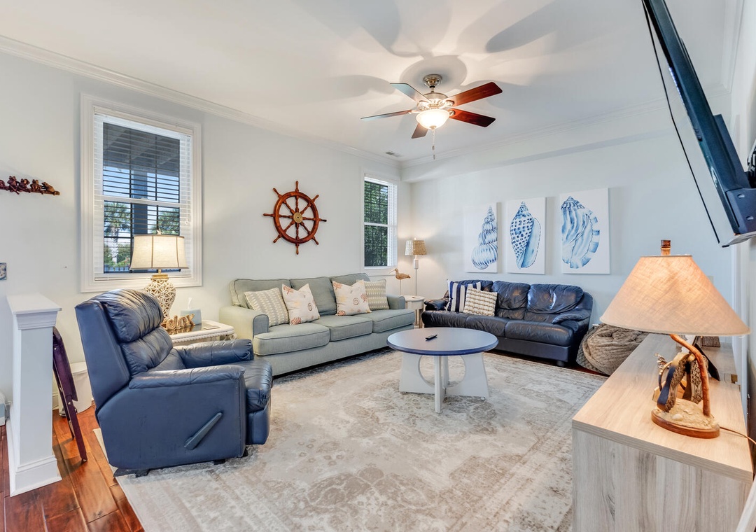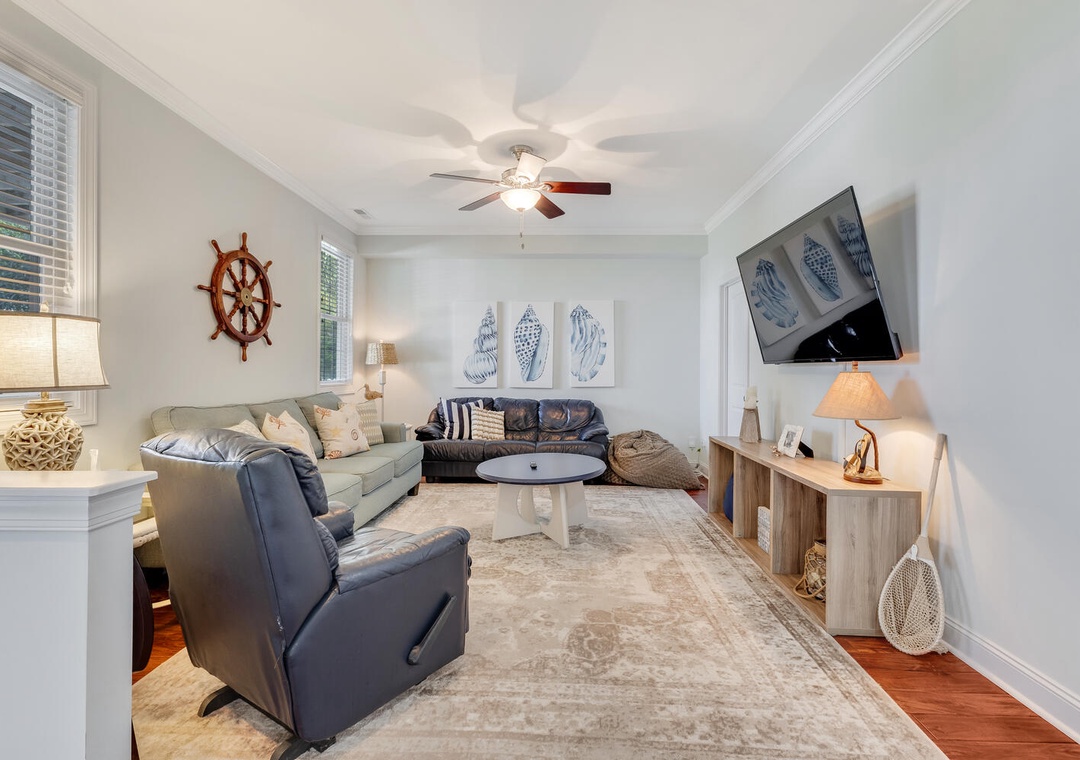 The fully equipped kitchen, featuring stainless steel appliances and a built-in microwave, makes it easy to prepare meals for the whole family. Enjoy dining together at the large family-style table or casual bar seating. The main living room offers comfortable seating, a flat-screen TV, and a ceiling fan, perfect for relaxing after a day on the beach. A first-floor family room provides an additional space to unwind with plush seating and another flat-screen TV, ensuring everyone has room to relax and recharge.