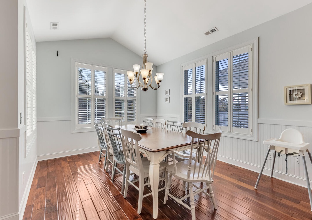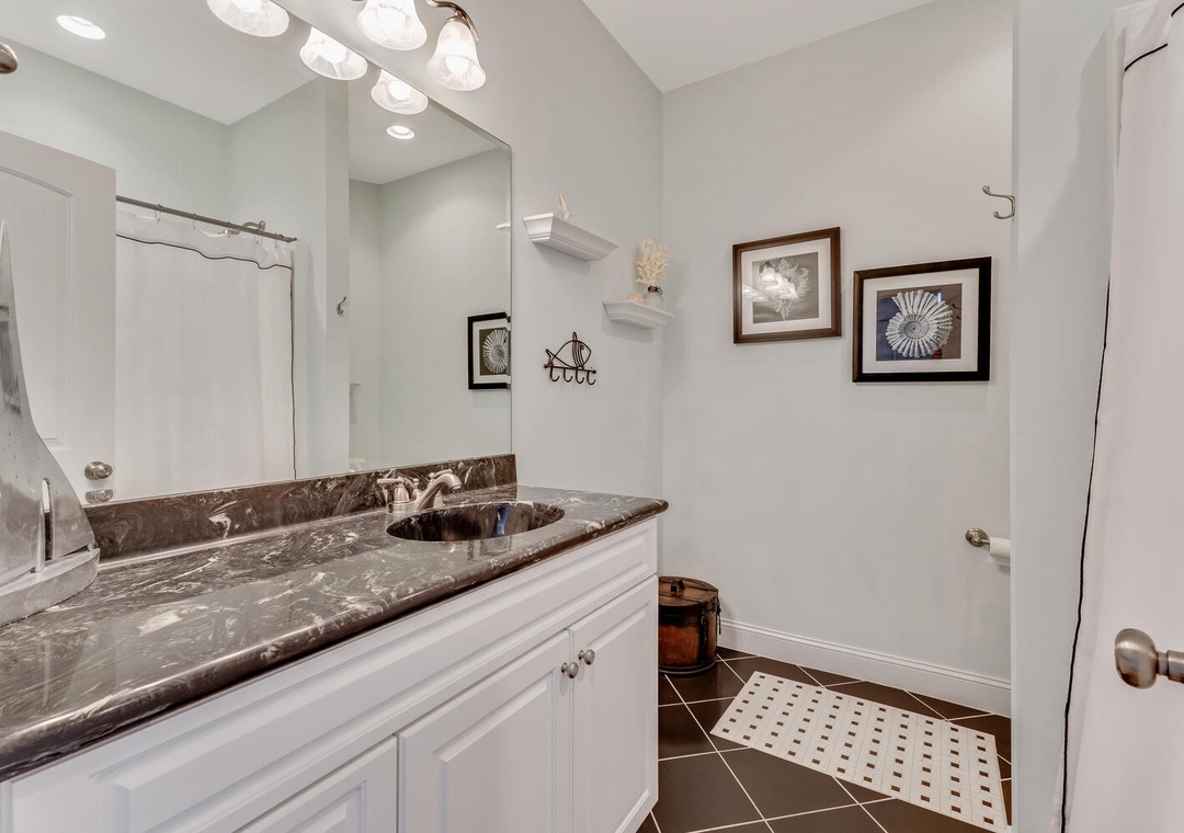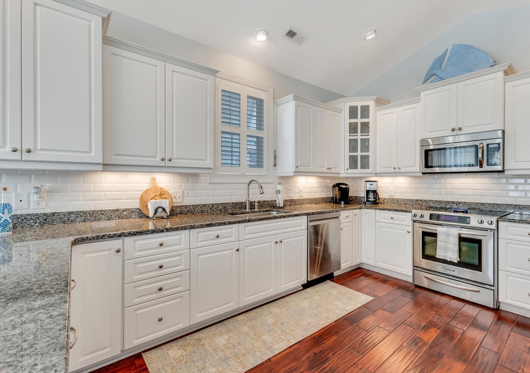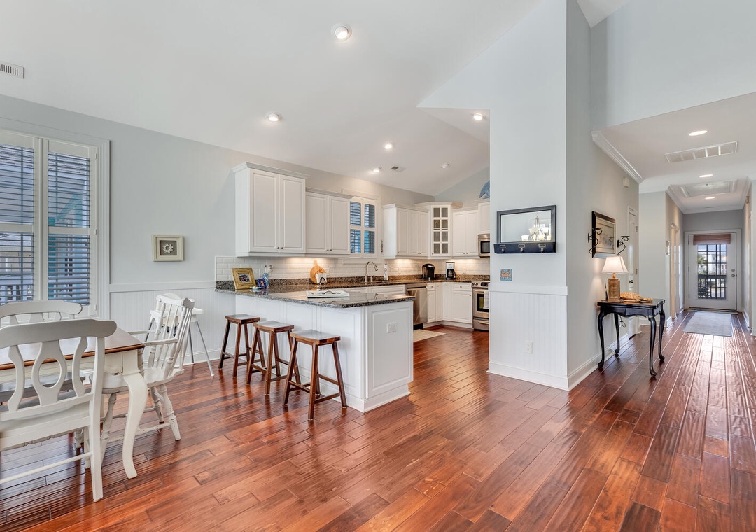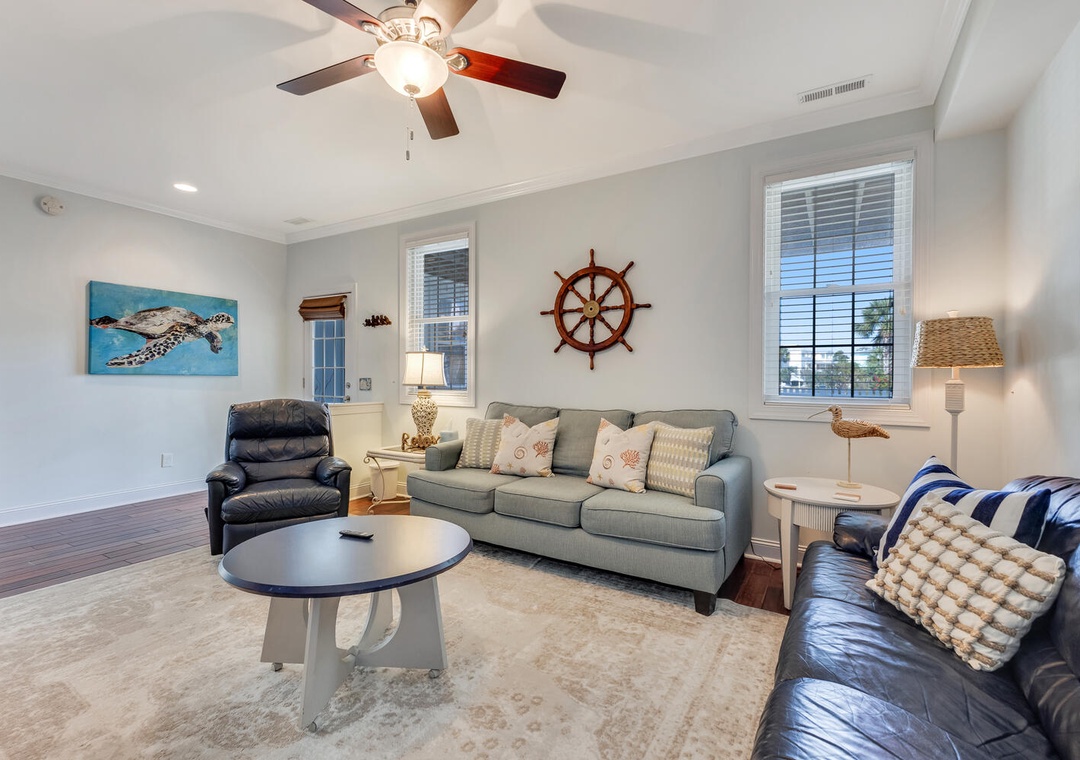 The fully equipped kitchen, featuring stainless steel appliances and a built-in microwave, makes it easy to prepare meals for the whole family. Enjoy dining together at the large family-style table or casual bar seating. The main living room offers comfortable seating, a flat-screen TV, and a ceiling fan, perfect for relaxing after a day on the beach. A first-floor family room provides an additional space to unwind with plush seating and another flat-screen TV, ensuring everyone has room to relax and recharge.