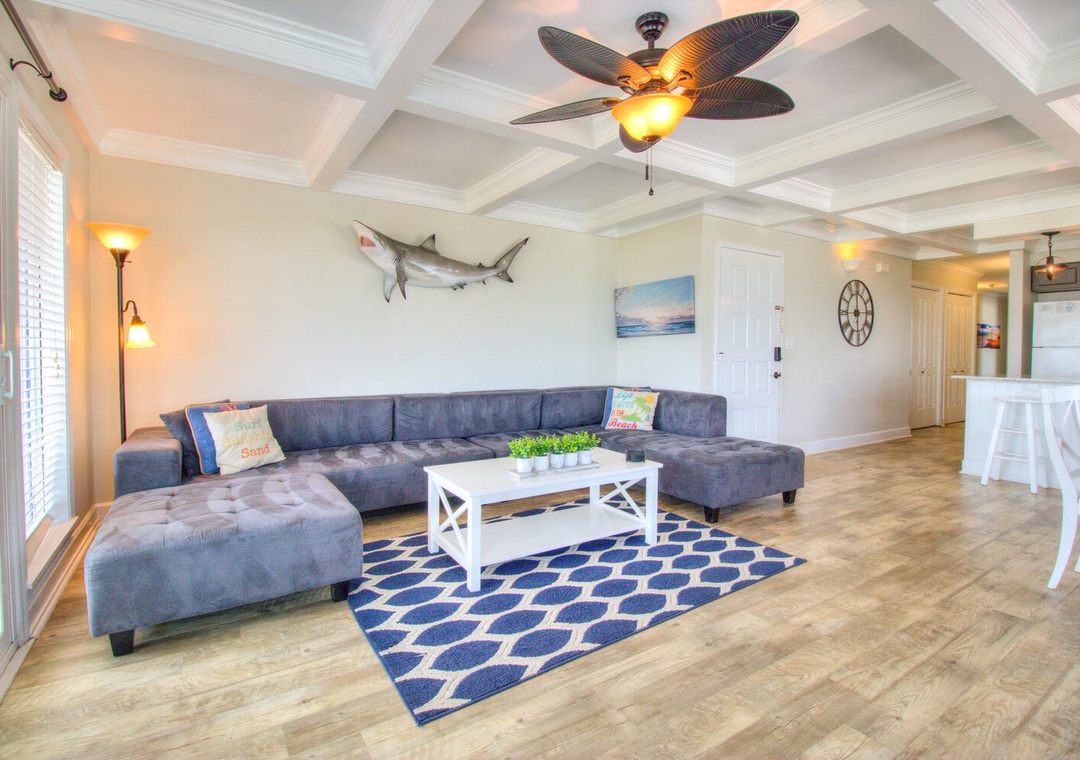 Inside, Whitecaps C has everything you need for a comfortable stay. The fully equipped kitchen and dining area make preparing meals a breeze, with a dining table that seats six, plus four additional kitchen bar stools. From a flat-top stove to a 12-cup coffee maker, toaster, and blender, this kitchen has all the essentials. The cozy living room, complete with seating for eight and access to the oceanfront deck, is the perfect spot to relax with loved ones and enjoy entertainment on the TV with Hulu. Complimentary WiFi, central heat and air, and parking for two cars add to the seamless experience of staying here.