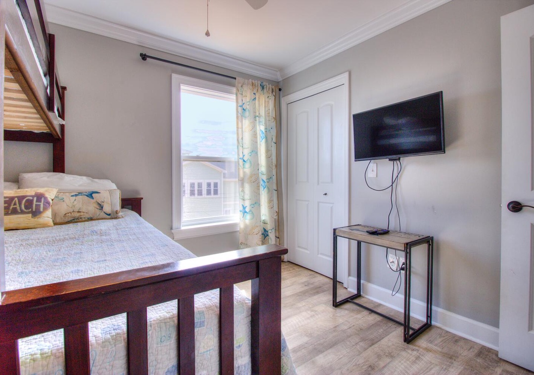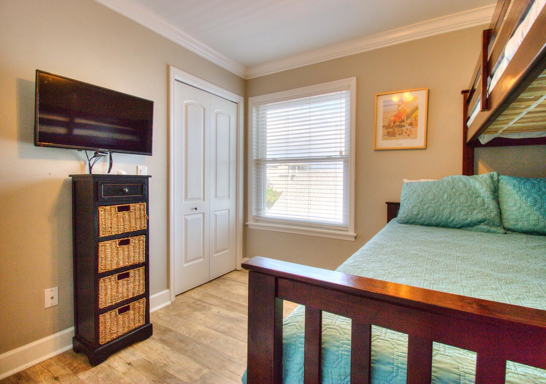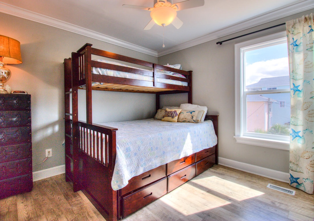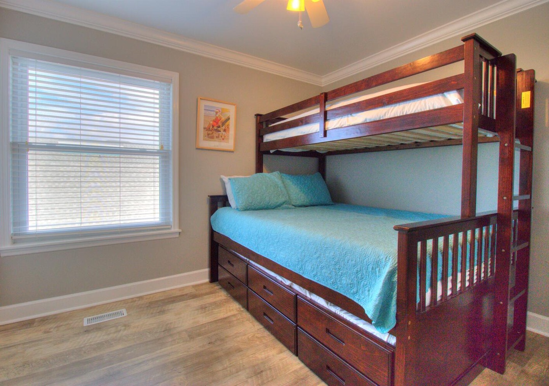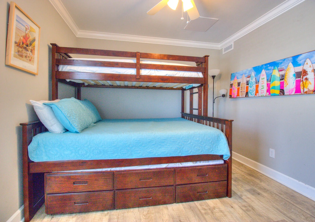 Guest Bedroom: Twin-over-queen bunk beds with pullout trundles